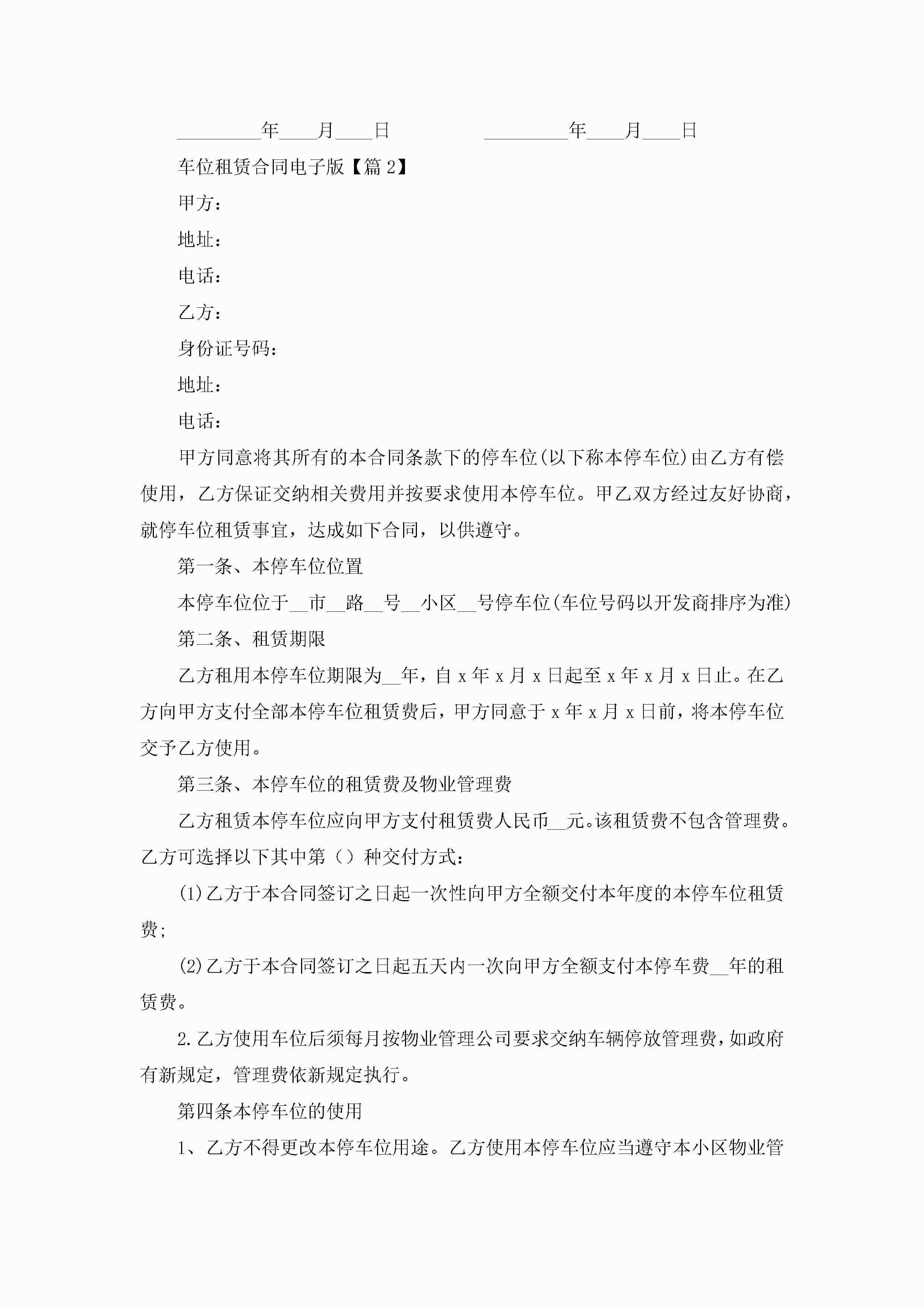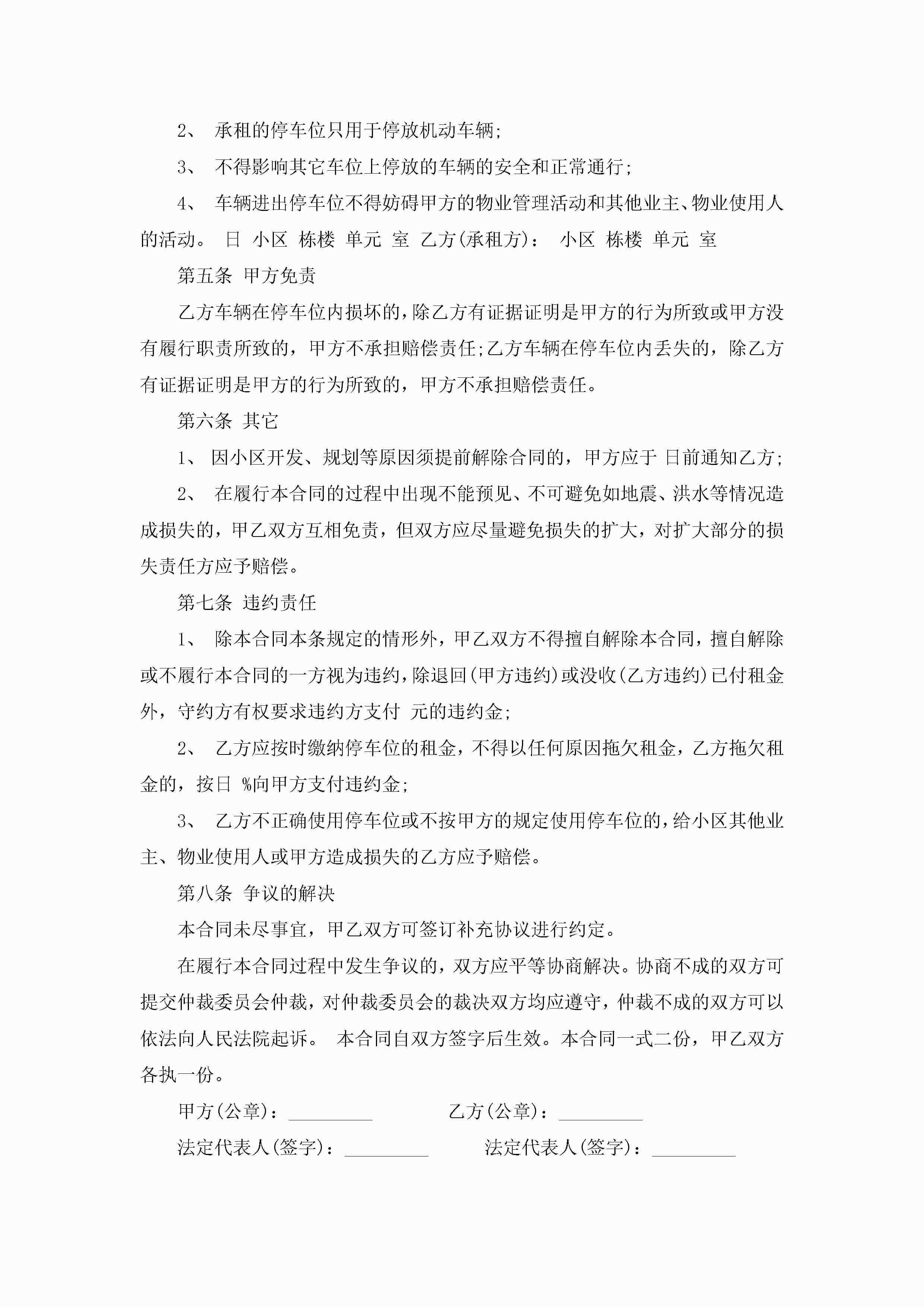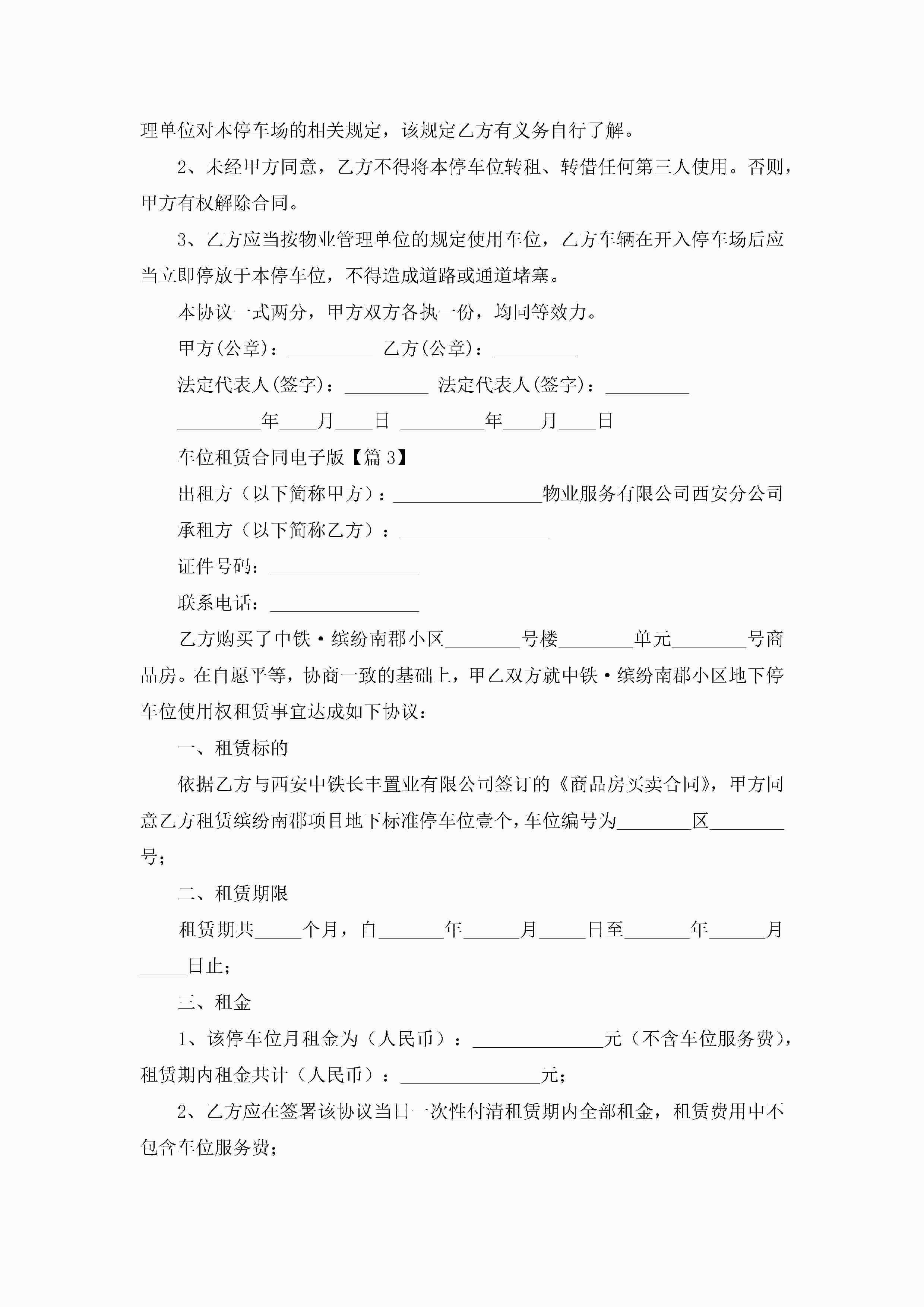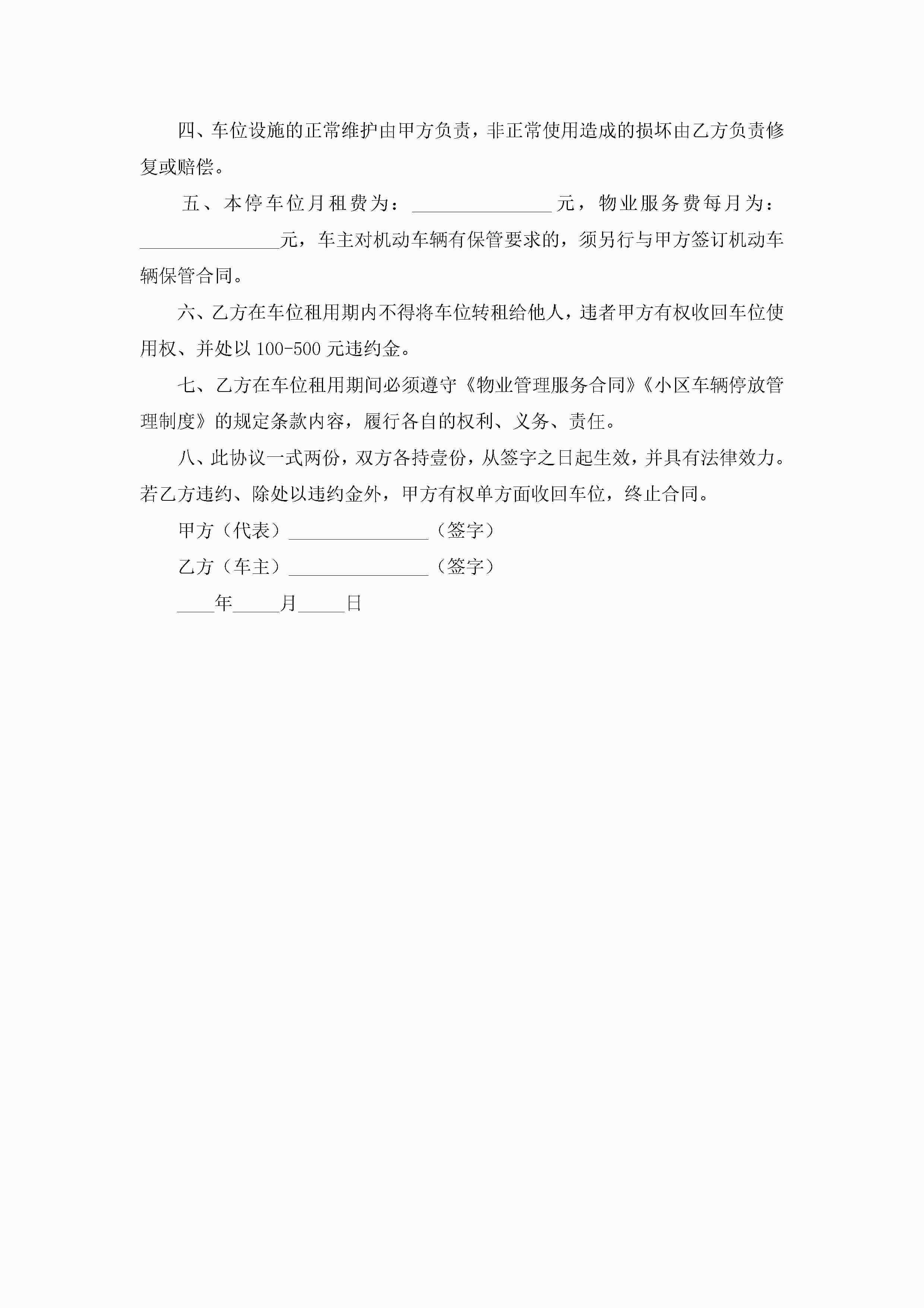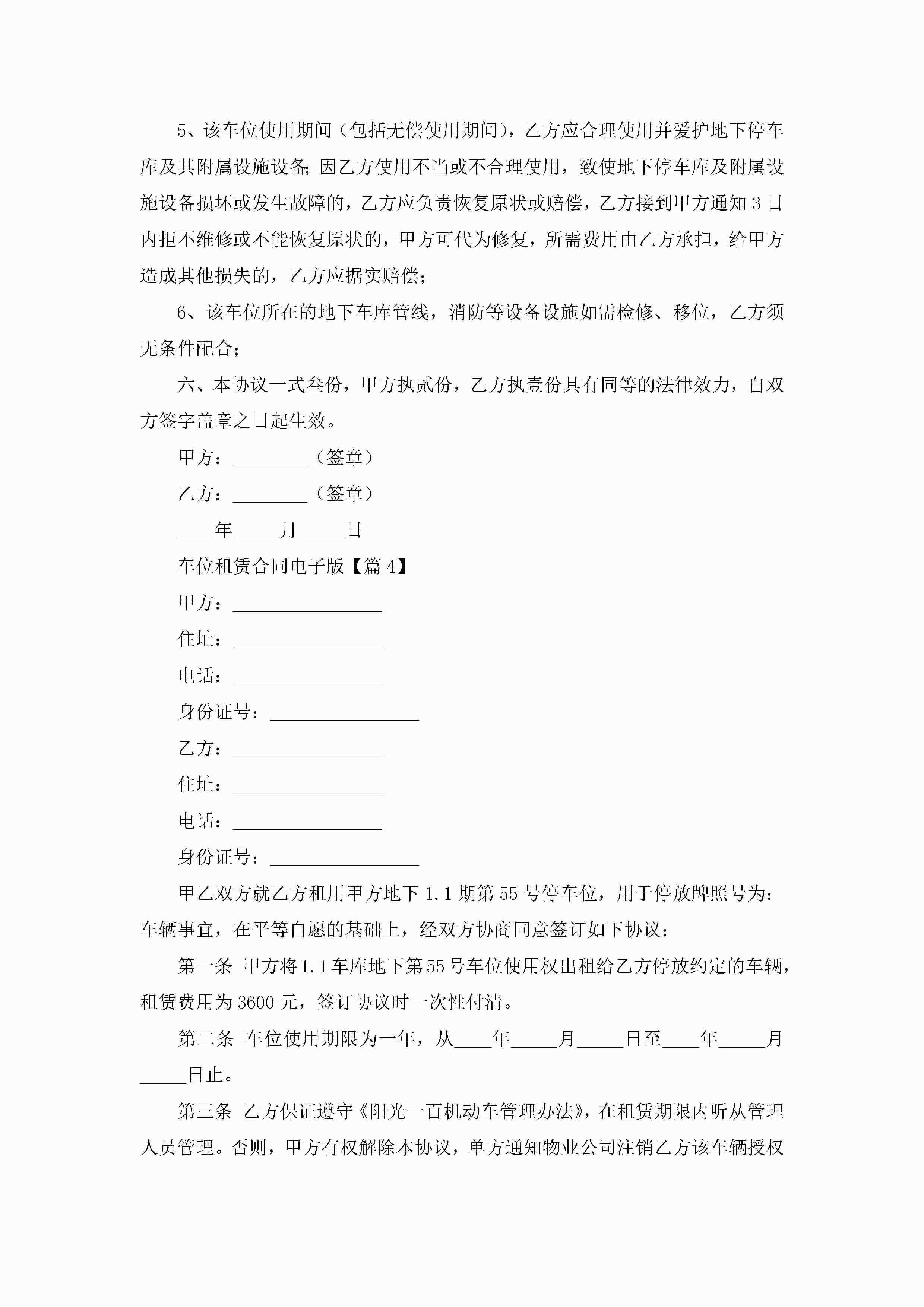 车位租赁合同电子版5篇jugei3月23日 01:43发布关注186 车位租赁合同电子版5篇此内容为付费资源,请付费后查看¥10.9 单篇文档限时特惠¥15个人会员开通企业会员开通立即下载无需登陆!可直接快捷下载单个模板付费资源© 版权声明THE ENDWord模板# 实用文档# 合同模板# 租赁合同# 车位租赁合同电子版 如有问题,可点击最底部“联系我们”联系客服 分享QQ空间微博QQ好友海报分享复制链接收藏