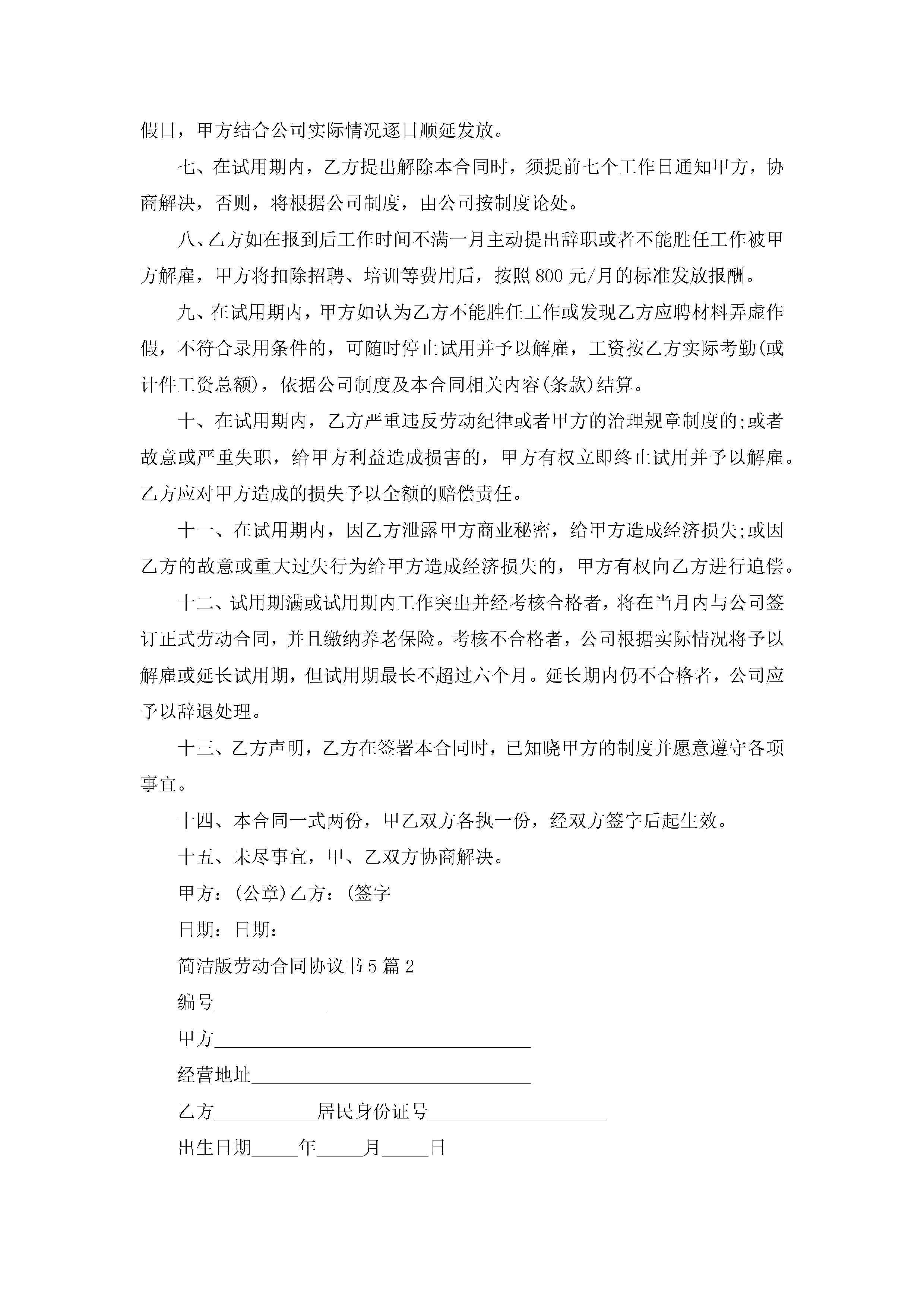 简洁版劳动合同协议书模板【5篇】_劳动合同协议模板jugei3月23日 01:44发布关注256 简洁版劳动合同协议书模板【5篇】_劳动合同协议模板此内容为付费资源,请付费后查看¥10.9 单篇文档限时特惠¥15个人会员开通企业会员开通立即下载无需登陆!可直接快捷下载单个模板付费资源© 版权声明THE ENDWord模板# 实用文档# 实用模板# 合同模板# 劳动合同 如有问题,可点击最底部“联系我们”联系客服 分享QQ空间微博QQ好友海报分享复制链接收藏