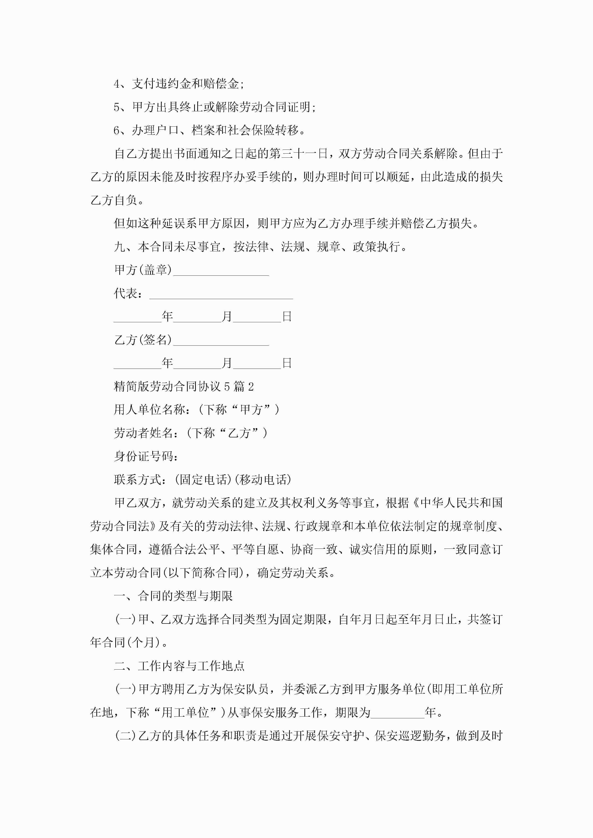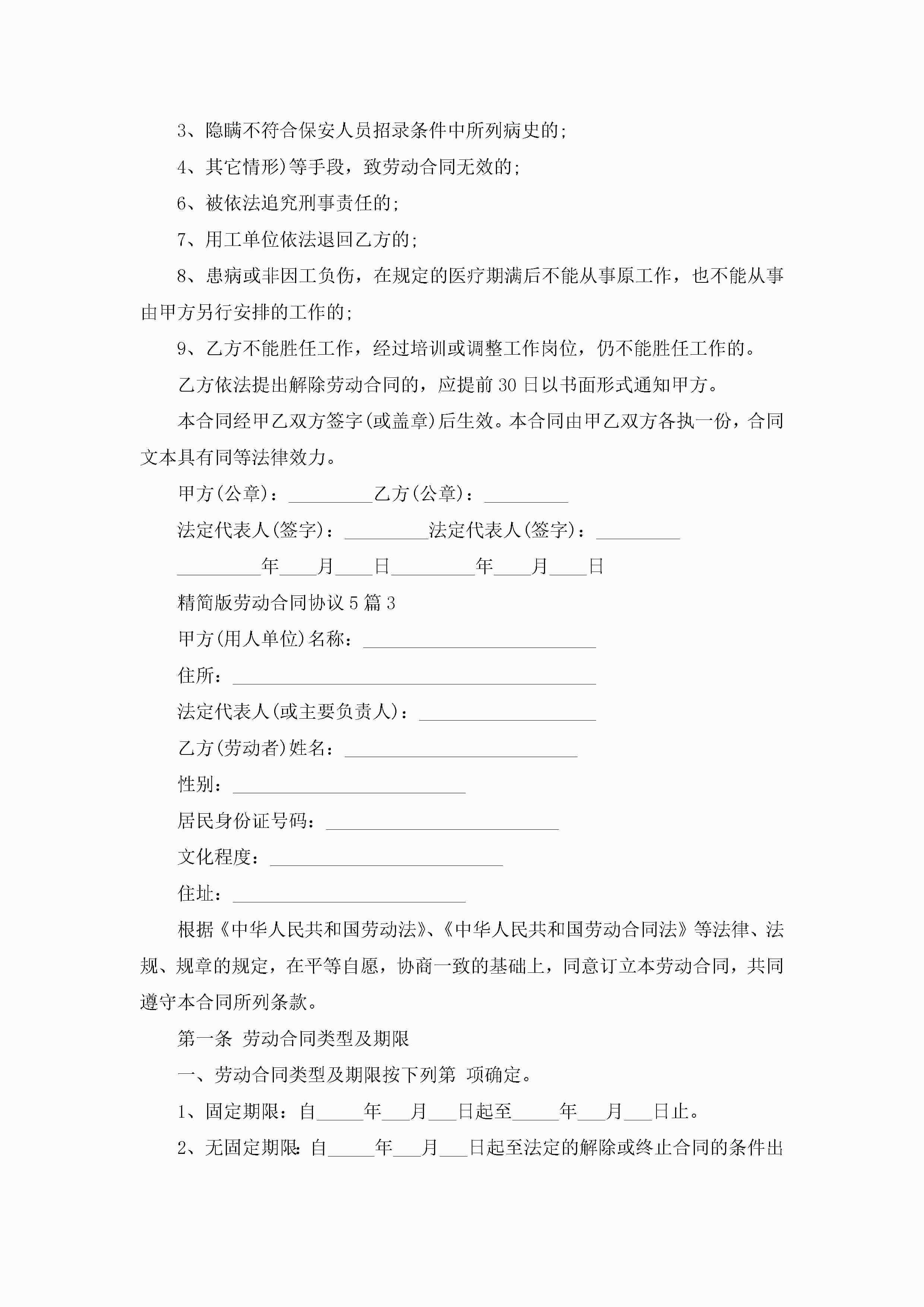 精简版劳动合同协议模板【5篇】_个人劳动合同书简单版jugei3月23日 01:44发布关注238 精简版劳动合同协议模板【5篇】_个人劳动合同书简单版此内容为付费资源,请付费后查看¥10.9 单篇文档限时特惠¥15个人会员开通企业会员开通立即下载无需登陆!可直接快捷下载单个模板付费资源© 版权声明THE ENDWord模板# 实用文档# 实用模板# 合同模板# 劳动合同 如有问题,可点击最底部“联系我们”联系客服 分享QQ空间微博QQ好友海报分享复制链接收藏