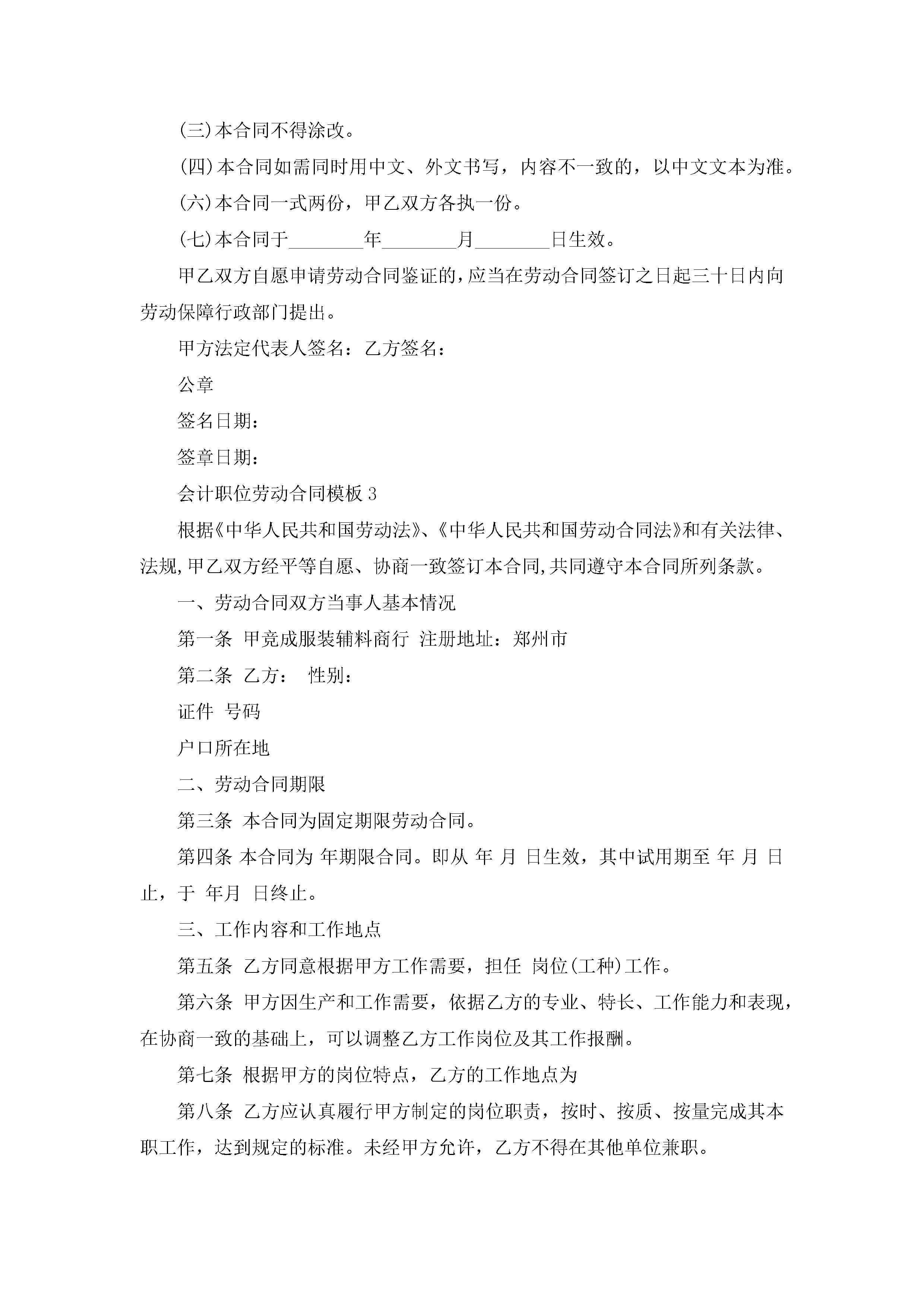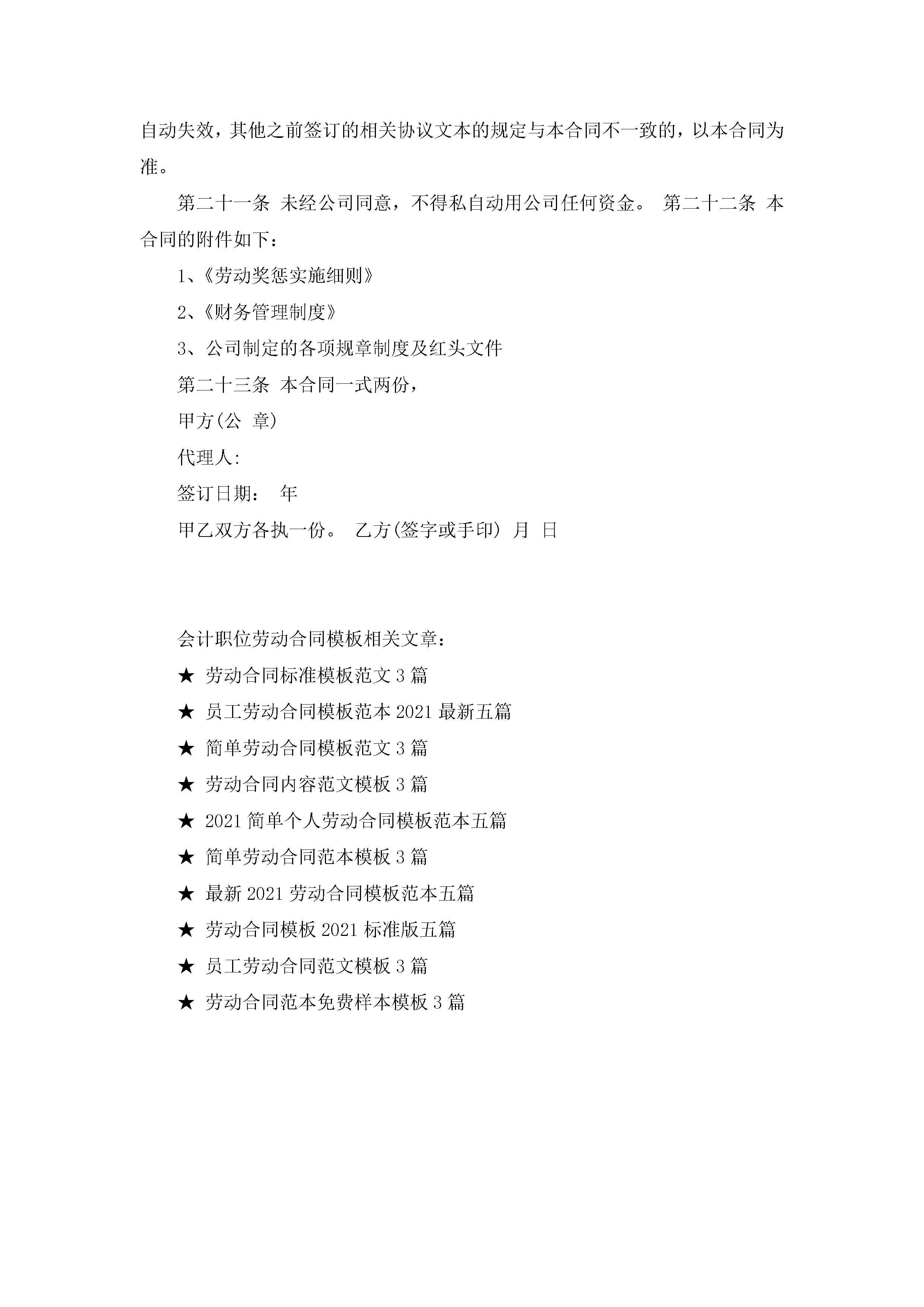 会计职位劳动合同模板【3篇】jugei3月23日 01:44发布关注242 会计职位劳动合同模板【3篇】此内容为付费资源,请付费后查看¥10.9 单篇文档限时特惠¥15个人会员开通企业会员开通立即下载无需登陆!可直接快捷下载单个模板付费资源© 版权声明THE ENDWord模板# 实用文档# 实用模板# 合同模板# 劳动合同 如有问题,可点击最底部“联系我们”联系客服 分享QQ空间微博QQ好友海报分享复制链接收藏