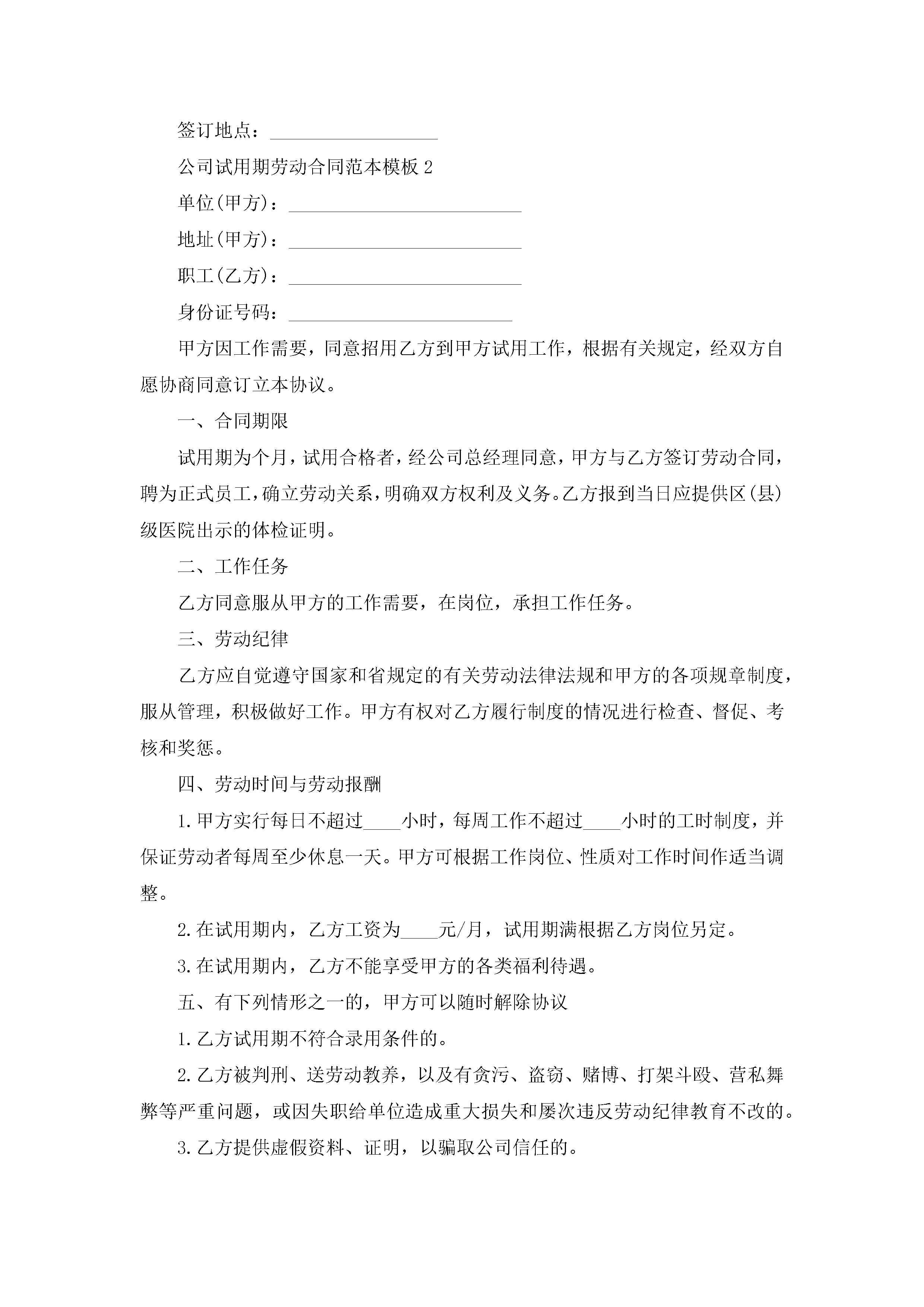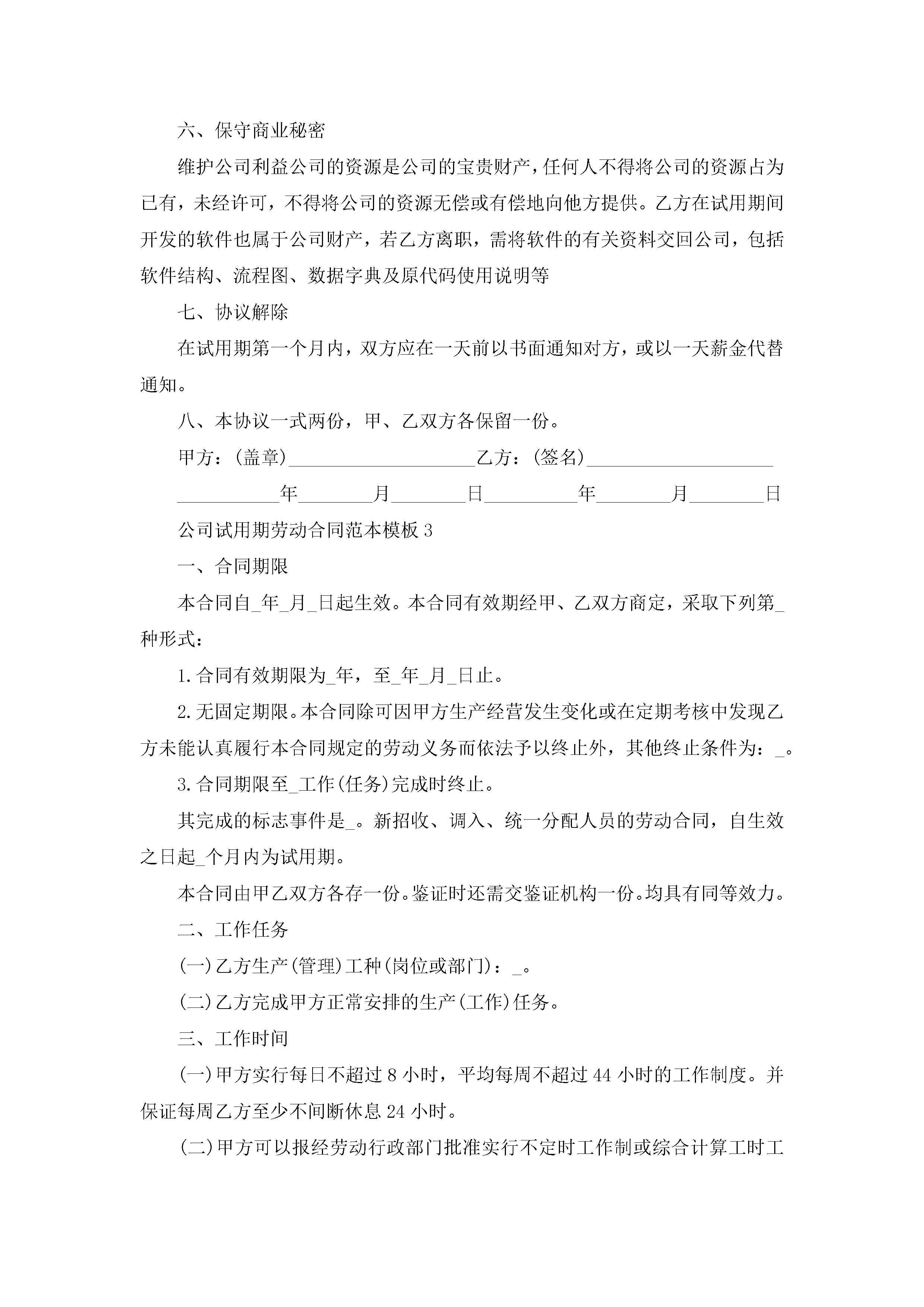 公司试用期劳动合同范本模板【3篇】jugei3月23日 01:44发布关注185 公司试用期劳动合同范本模板【3篇】此内容为付费资源,请付费后查看¥10.9 单篇文档限时特惠¥15个人会员开通企业会员开通立即下载无需登陆!可直接快捷下载单个模板付费资源© 版权声明THE ENDWord模板# 实用文档# 实用模板# 合同模板# 劳动合同 如有问题,可点击最底部“联系我们”联系客服 分享QQ空间微博QQ好友海报分享复制链接收藏