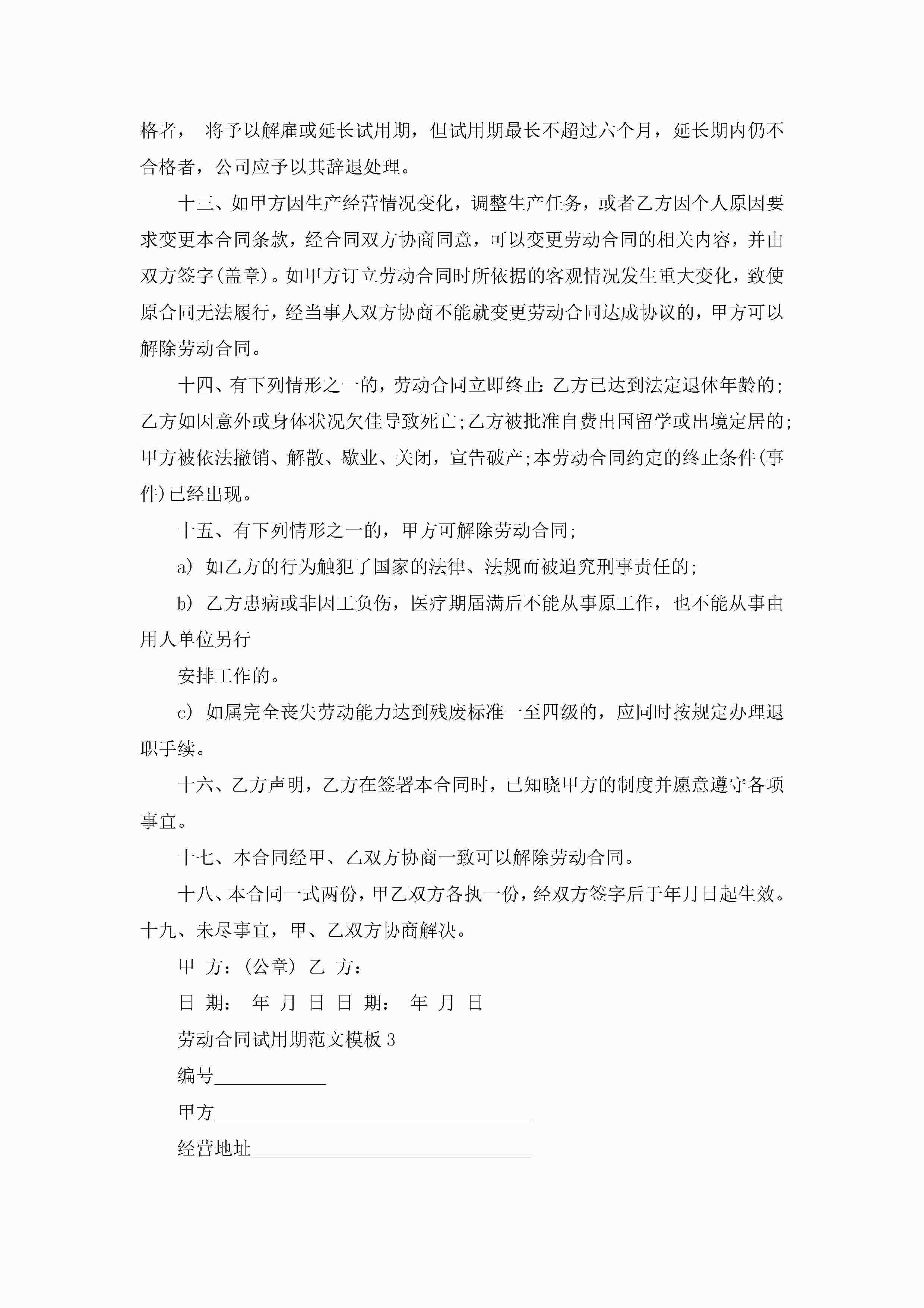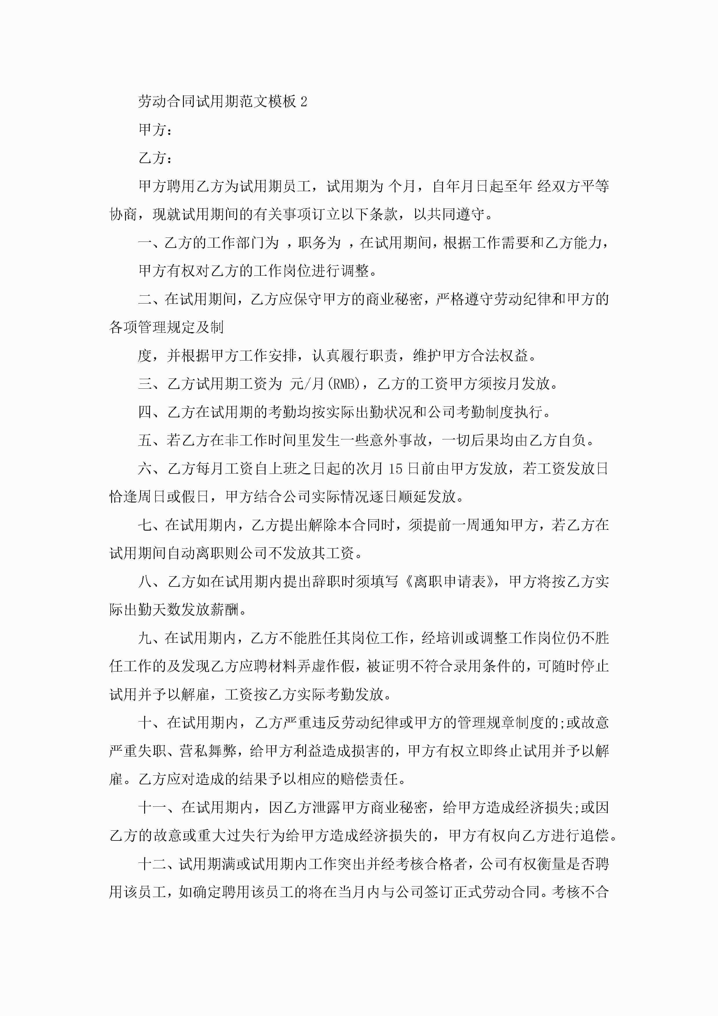 劳动合同试用期范文模板【3篇】jugei3月23日 01:44发布关注196 劳动合同试用期范文模板【3篇】此内容为付费资源,请付费后查看¥10.9 单篇文档限时特惠¥15个人会员开通企业会员开通立即下载无需登陆!可直接快捷下载单个模板付费资源© 版权声明THE ENDWord模板# 实用文档# 实用模板# 合同模板# 劳动合同 如有问题,可点击最底部“联系我们”联系客服 分享QQ空间微博QQ好友海报分享复制链接收藏