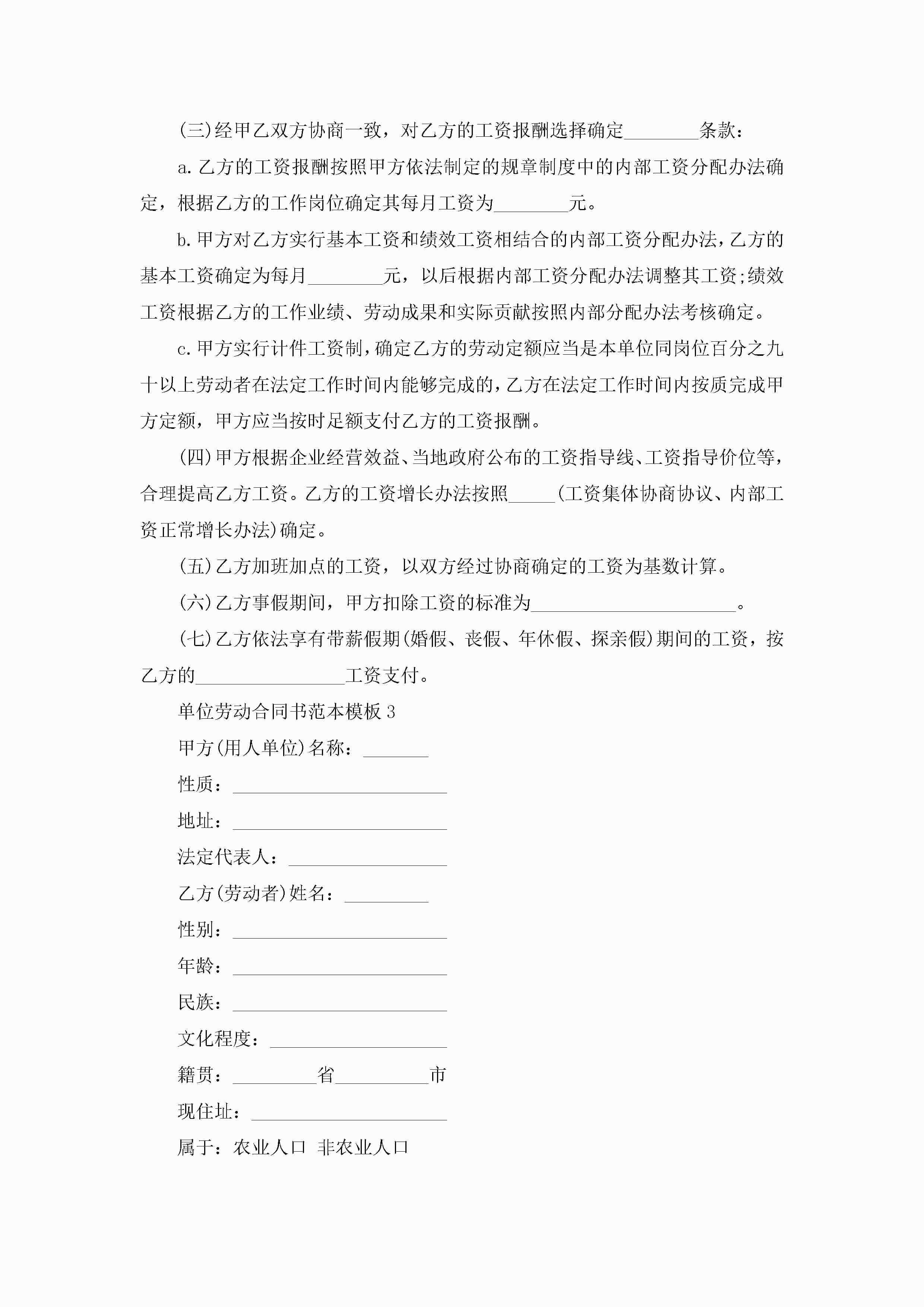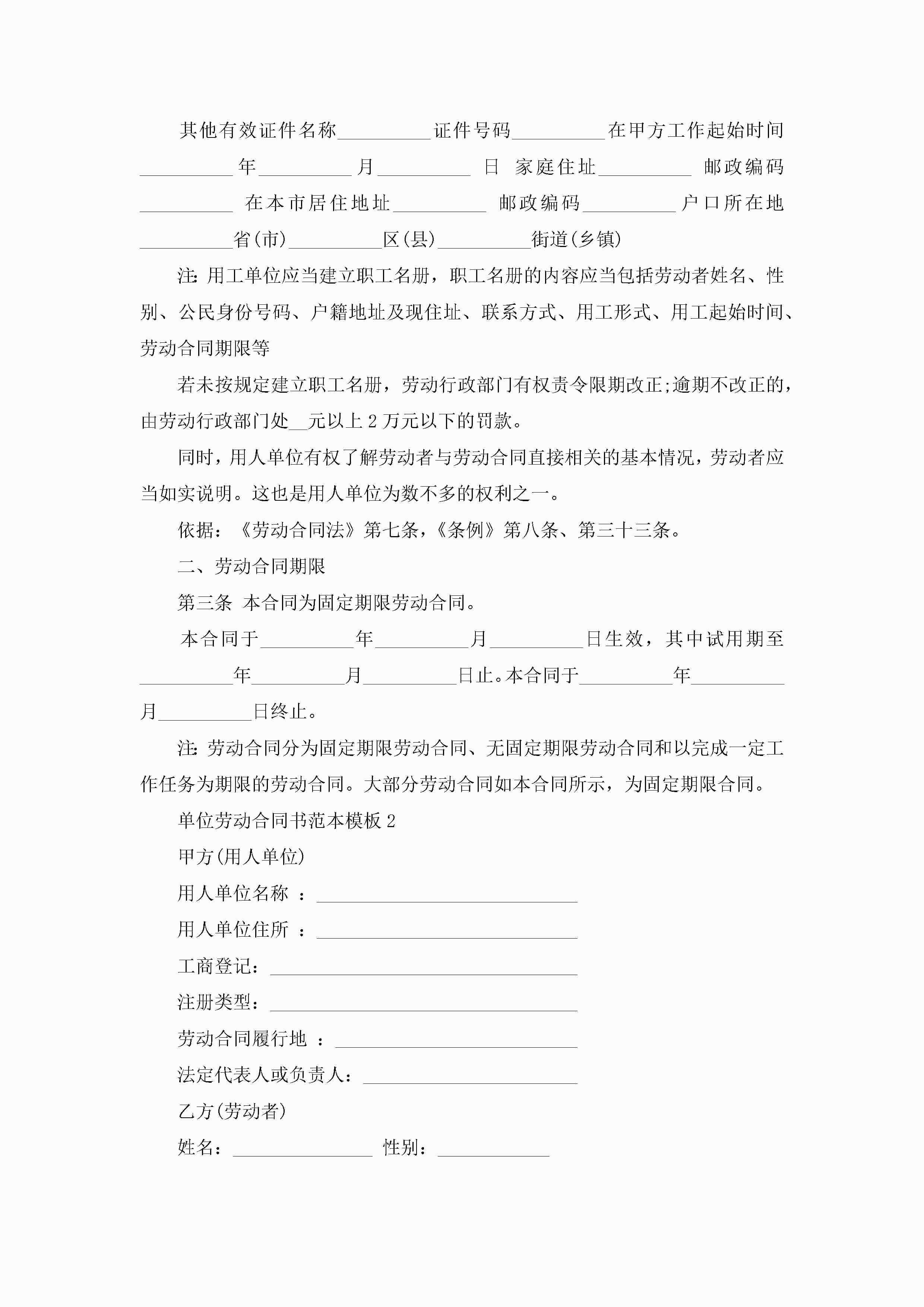 单位劳动合同书范本模板【3篇】jugei3月23日 01:44发布关注214 单位劳动合同书范本模板【3篇】此内容为付费资源,请付费后查看¥10.9 单篇文档限时特惠¥15个人会员开通企业会员开通立即下载无需登陆!可直接快捷下载单个模板付费资源© 版权声明THE ENDWord模板# 实用文档# 实用模板# 合同模板# 劳动合同 如有问题,可点击最底部“联系我们”联系客服 分享QQ空间微博QQ好友海报分享复制链接收藏