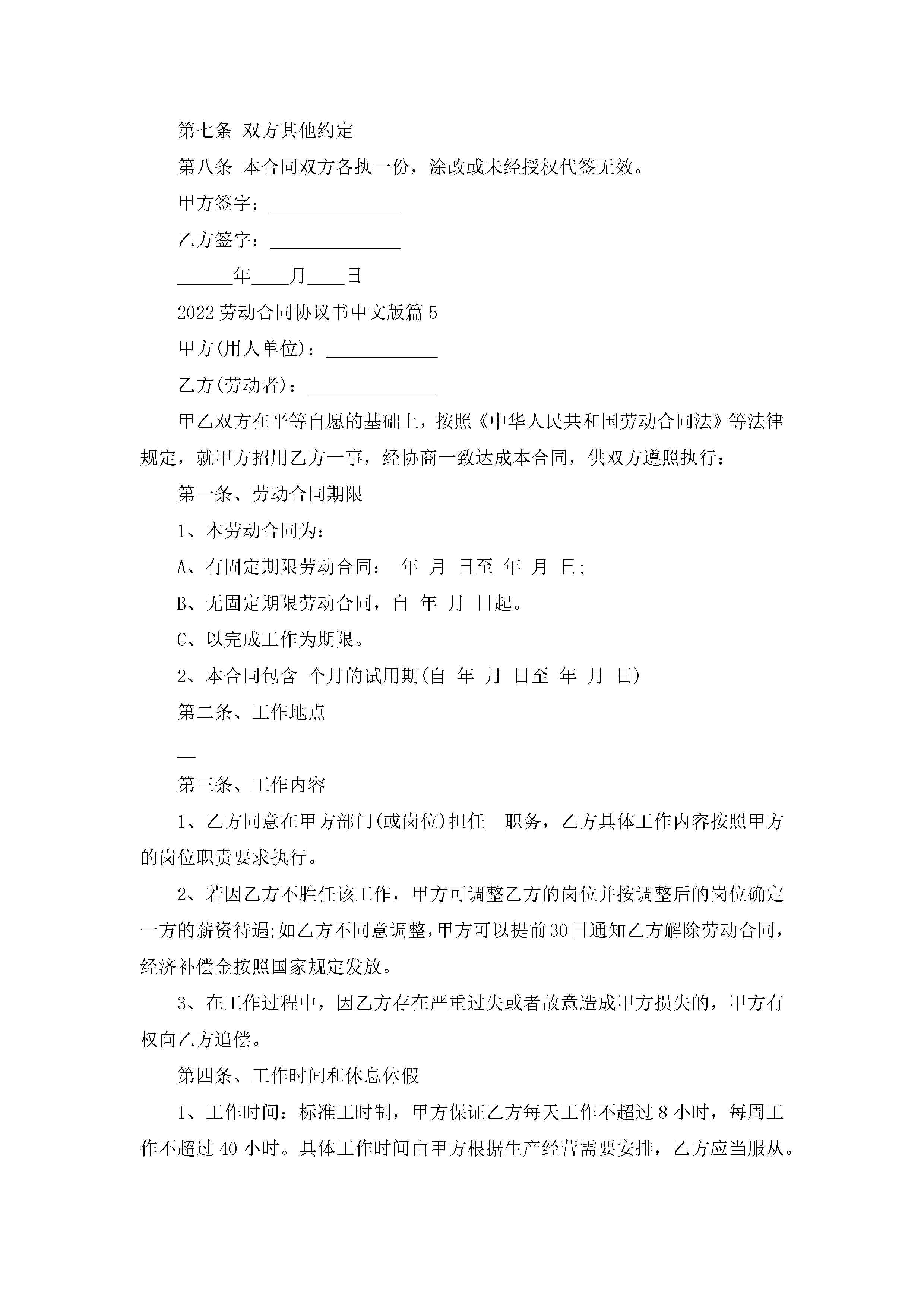 2022劳动合同协议书中文版(8篇)jugei3月23日 01:45发布关注191 2022劳动合同协议书中文版(8篇)此内容为付费资源,请付费后查看¥10.9 单篇文档限时特惠¥15个人会员开通企业会员开通立即下载无需登陆!可直接快捷下载单个模板付费资源© 版权声明THE ENDWord模板# 实用文档# 实用模板# 合同模板# 劳动合同 如有问题,可点击最底部“联系我们”联系客服 分享QQ空间微博QQ好友海报分享复制链接收藏