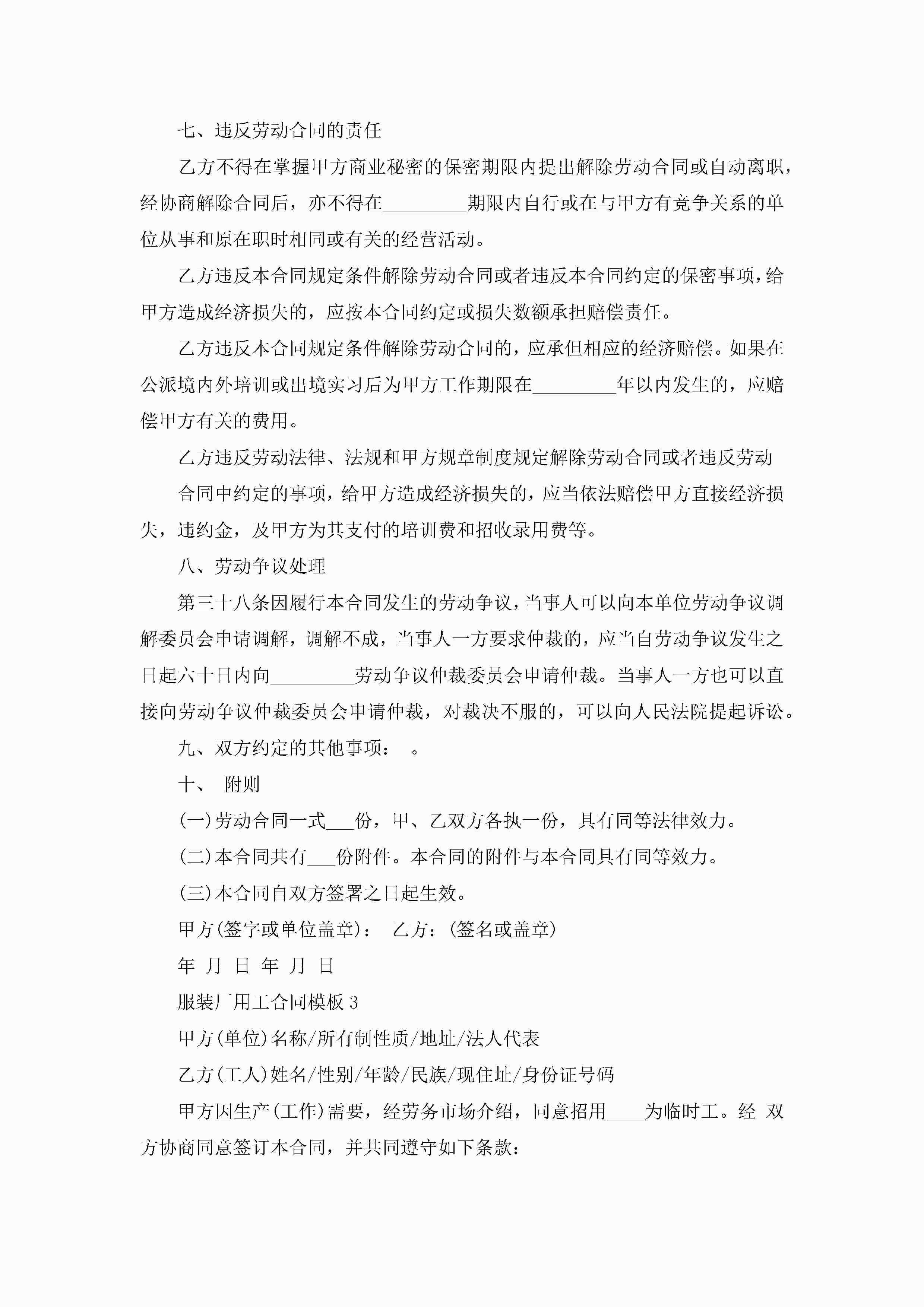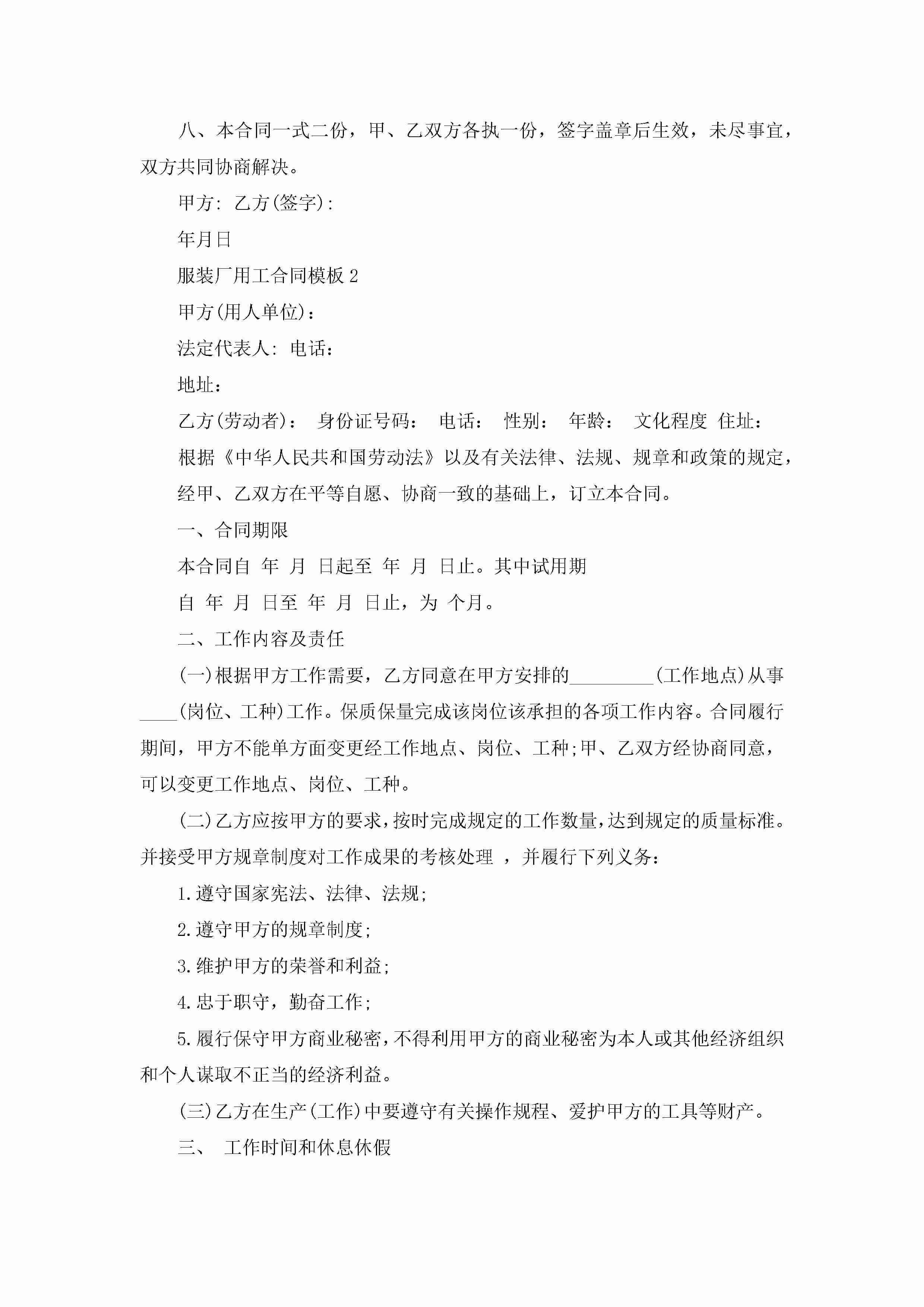 服装厂用工劳动合同模板5篇jugei3月23日 01:45发布关注212 服装厂用工劳动合同模板5篇此内容为付费资源,请付费后查看¥10.9 单篇文档限时特惠¥15个人会员开通企业会员开通立即下载无需登陆!可直接快捷下载单个模板付费资源© 版权声明THE ENDWord模板# 实用文档# 实用模板# 合同模板# 劳动合同 如有问题,可点击最底部“联系我们”联系客服 分享QQ空间微博QQ好友海报分享复制链接收藏