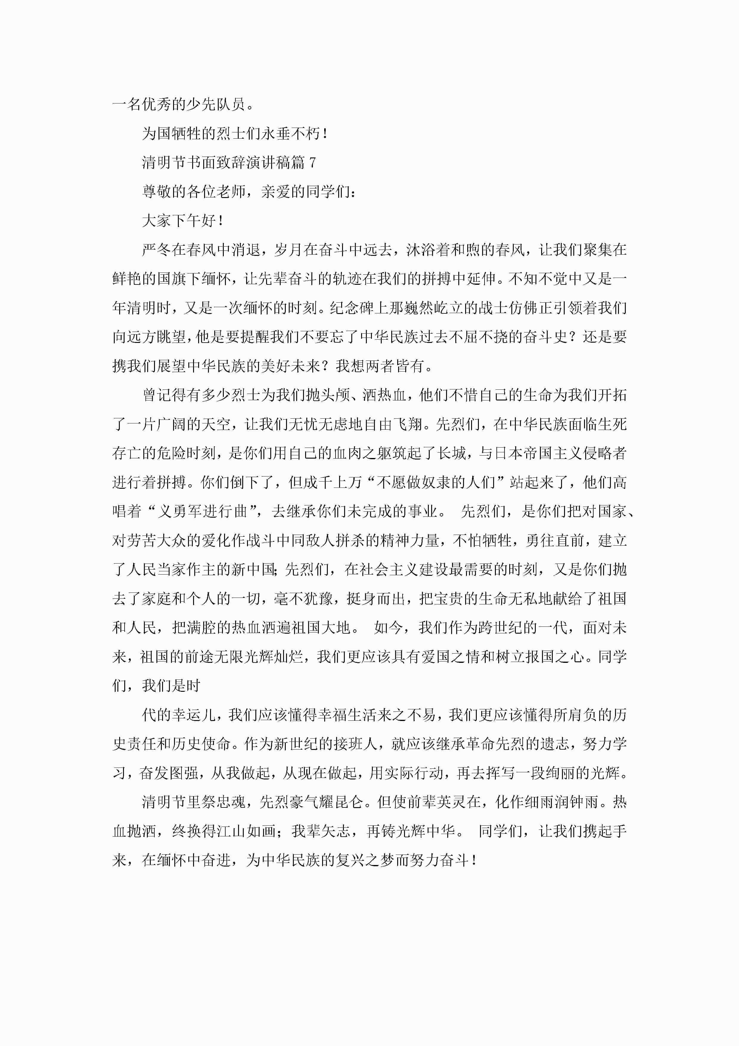 2023清明节书面致辞演讲稿7篇精选jugei3月23日 01:45发布关注307 2023清明节书面致辞演讲稿7篇精选此内容为付费资源,请付费后查看¥10.9 单篇文档限时特惠¥15个人会员开通企业会员开通立即下载无需登陆!可直接快捷下载单个模板付费资源© 版权声明THE ENDWord模板# 实用文档# 演讲稿# 经典演讲稿# 实用写作# 清明节书面致辞演讲稿7篇精选 如有问题,可点击最底部“联系我们”联系客服 分享QQ空间微博QQ好友海报分享复制链接收藏