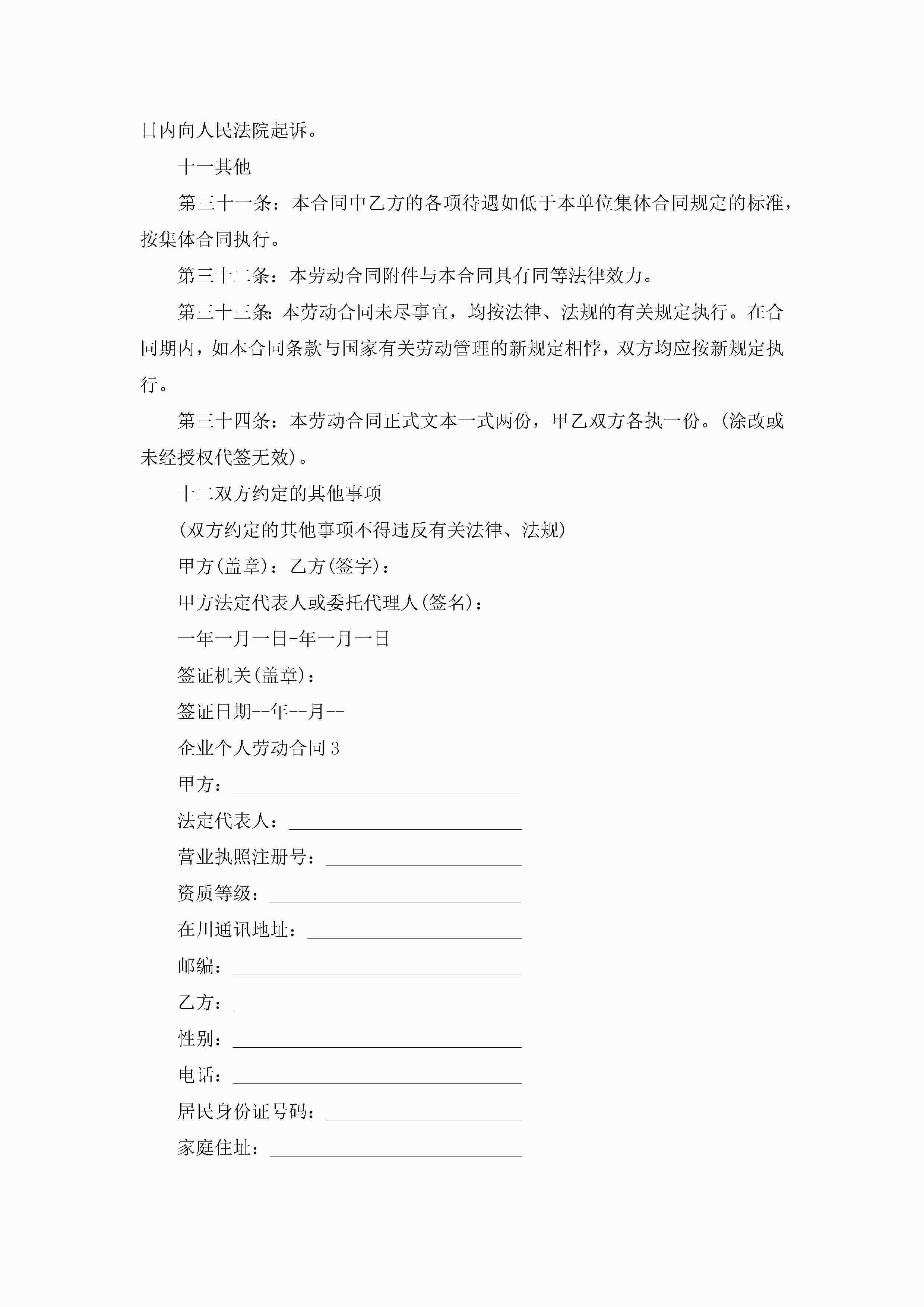 企业个人劳动合同5篇范文jugei3月23日 01:45发布关注196 企业个人劳动合同5篇范文此内容为付费资源,请付费后查看¥10.9 单篇文档限时特惠¥15个人会员开通企业会员开通立即下载无需登陆!可直接快捷下载单个模板付费资源© 版权声明THE ENDWord模板# 实用文档# 实用模板# 合同模板# 劳动合同 如有问题,可点击最底部“联系我们”联系客服 分享QQ空间微博QQ好友海报分享复制链接收藏