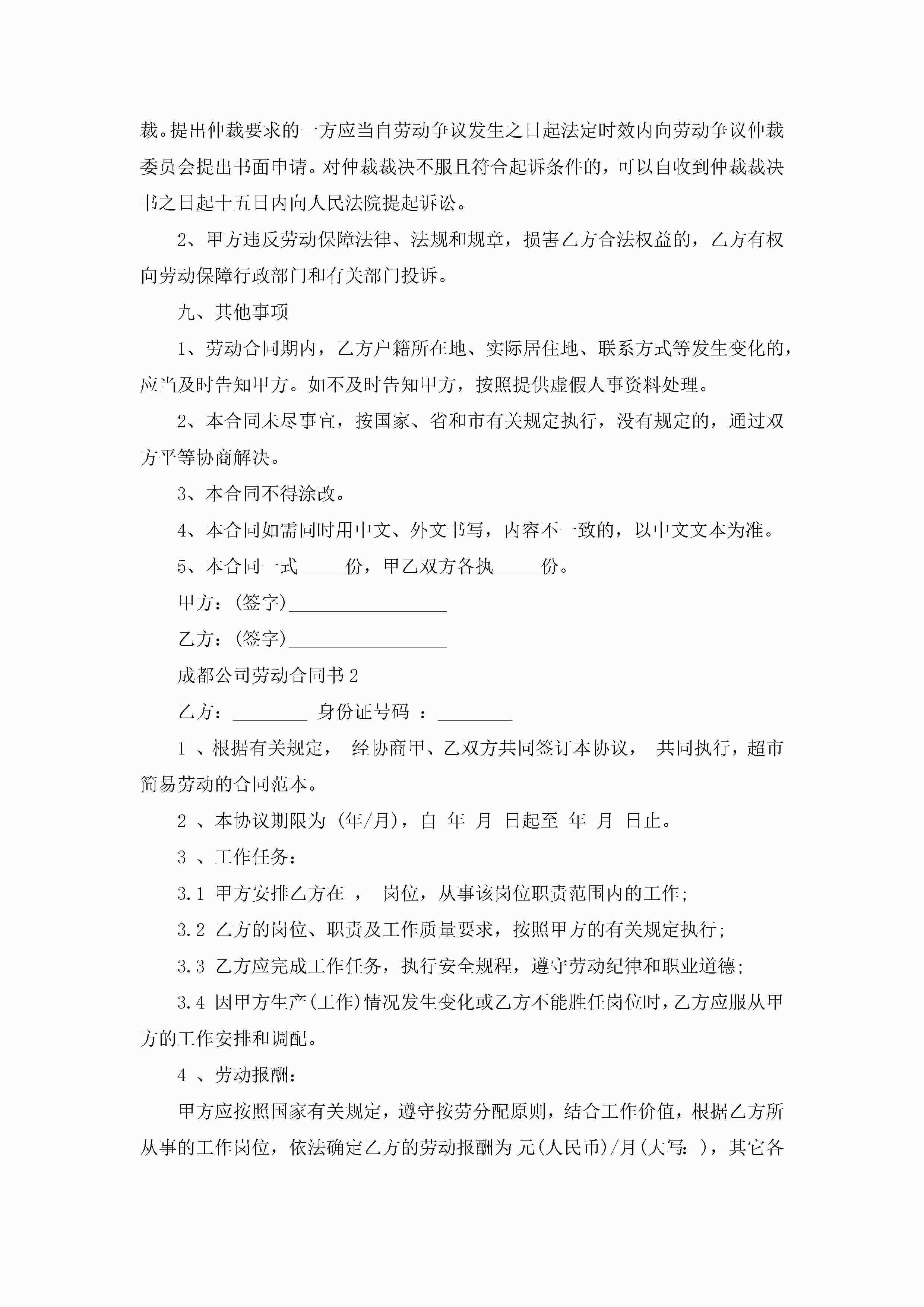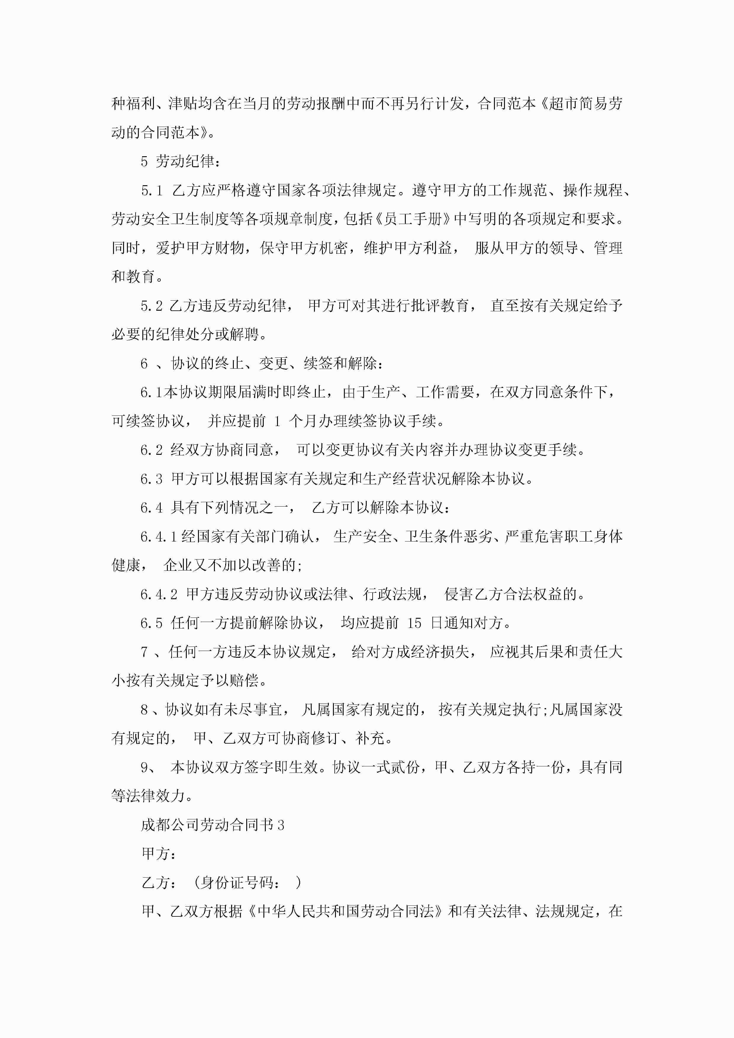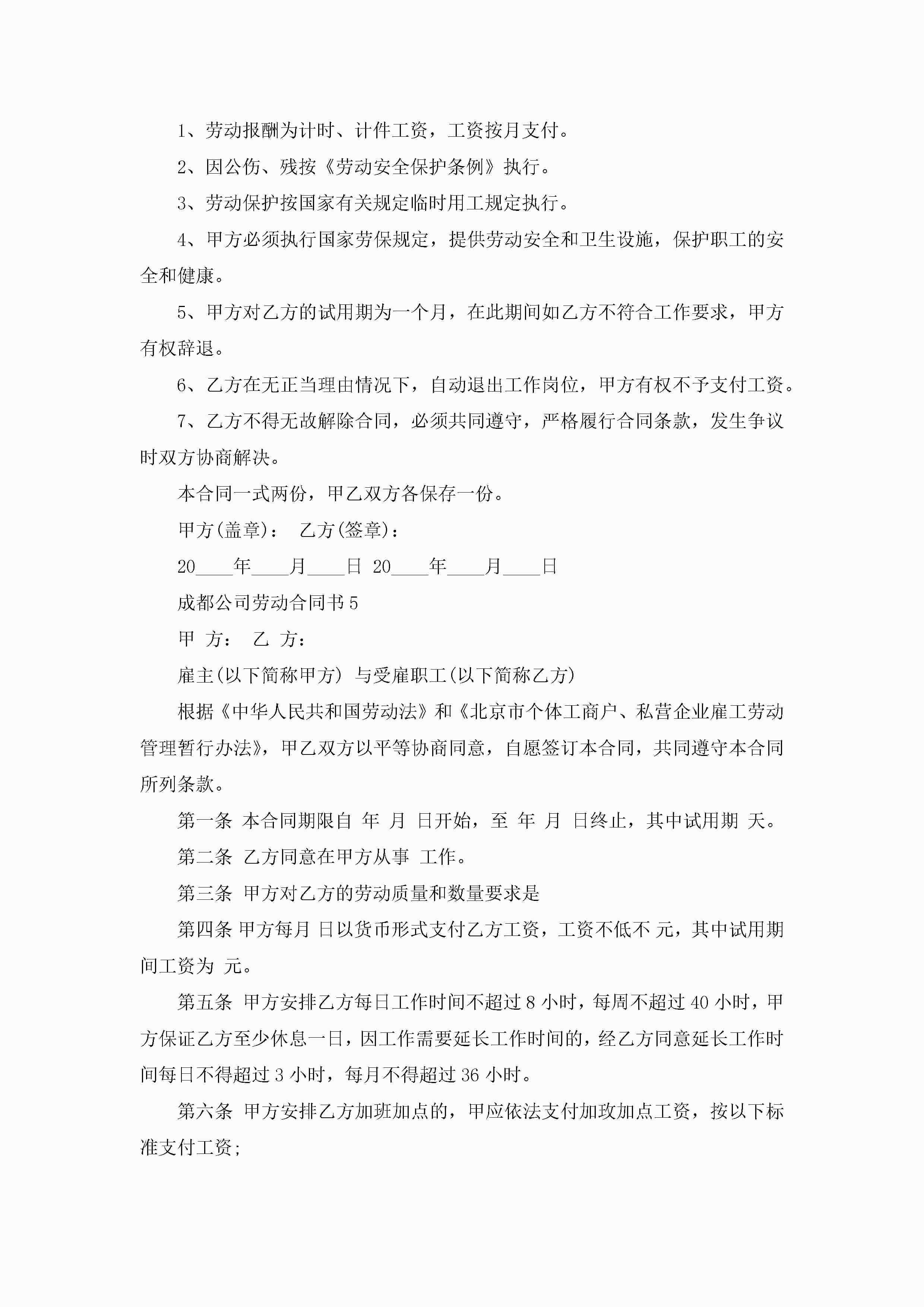成都公司劳动合同书5篇怎么写jugei3月23日 01:46发布关注200 成都公司劳动合同书5篇怎么写此内容为付费资源,请付费后查看¥10.9 单篇文档限时特惠¥15个人会员开通企业会员开通立即下载无需登陆!可直接快捷下载单个模板付费资源© 版权声明THE ENDWord模板# 实用文档# 实用模板# 合同模板# 劳动合同 如有问题,可点击最底部“联系我们”联系客服 分享QQ空间微博QQ好友海报分享复制链接收藏