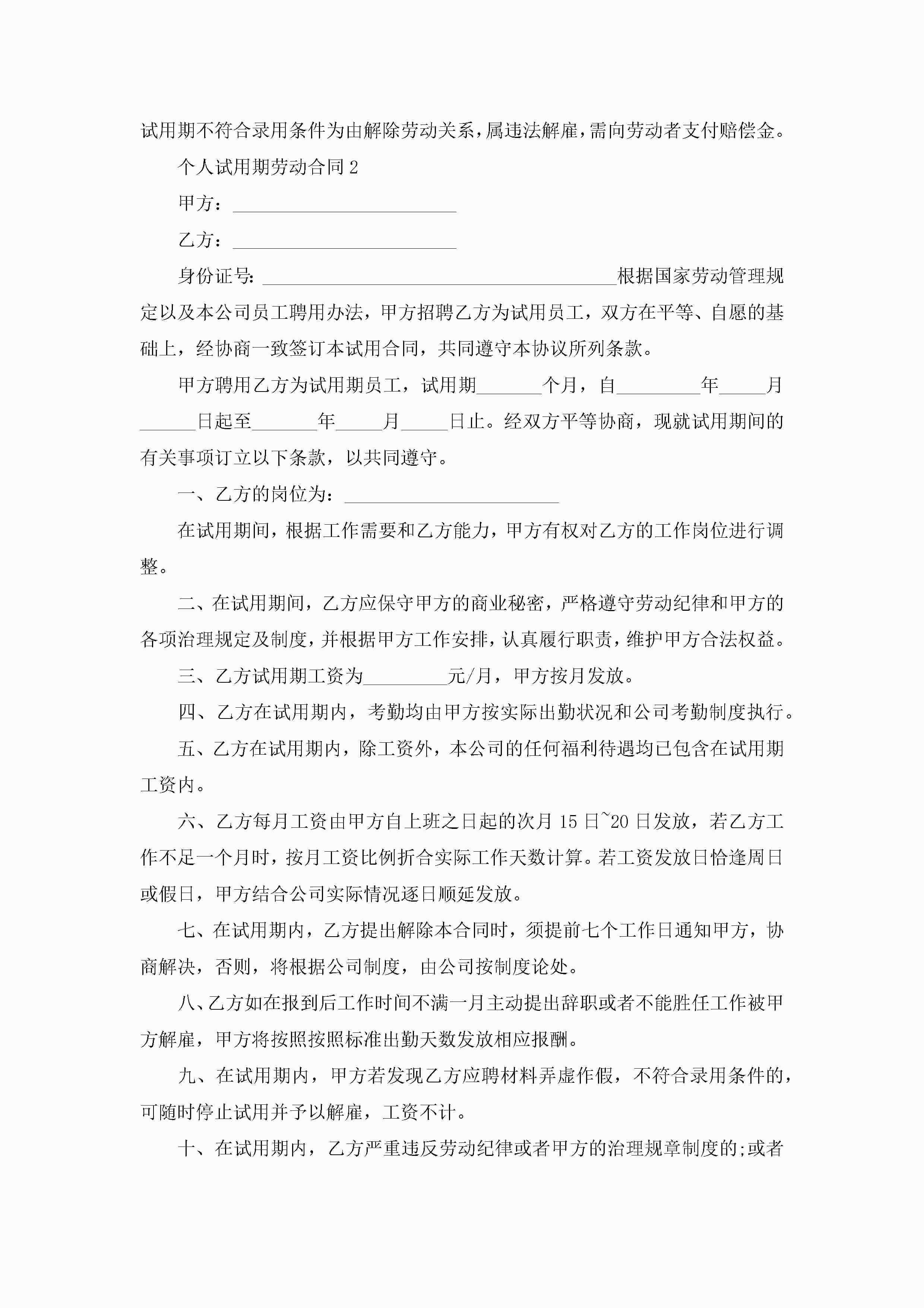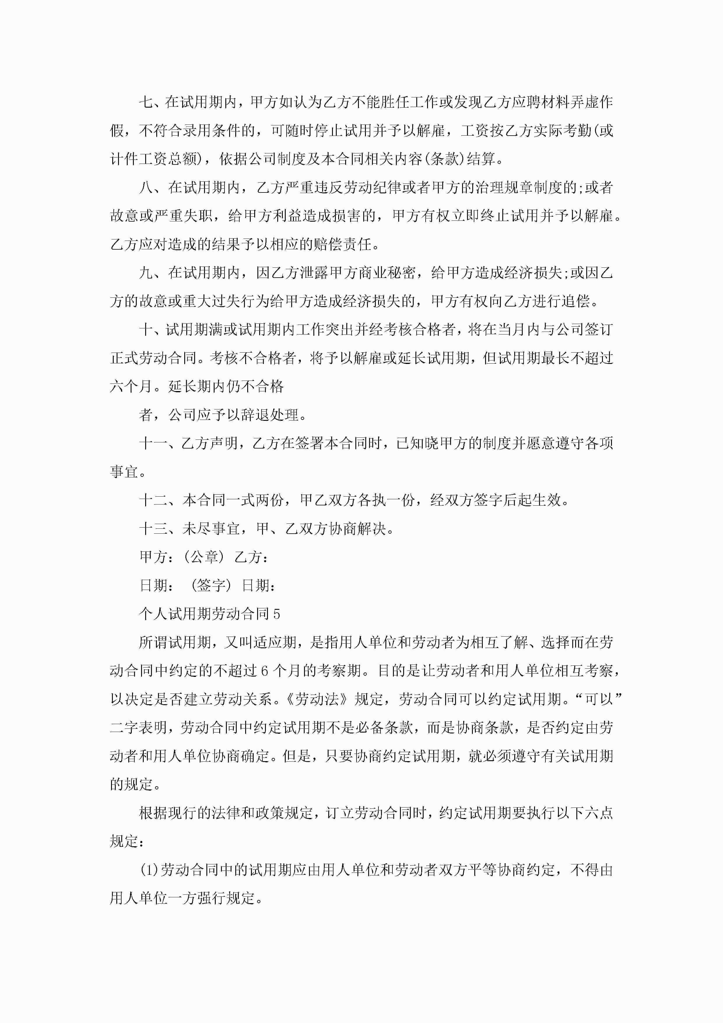 最新个人试用期劳动合同5篇jugei3月23日 01:46发布关注186 最新个人试用期劳动合同5篇此内容为付费资源,请付费后查看¥10.9 单篇文档限时特惠¥15个人会员开通企业会员开通立即下载无需登陆!可直接快捷下载单个模板付费资源© 版权声明THE ENDWord模板# 实用文档# 实用模板# 合同模板# 劳动合同 如有问题,可点击最底部“联系我们”联系客服 分享QQ空间微博QQ好友海报分享复制链接收藏