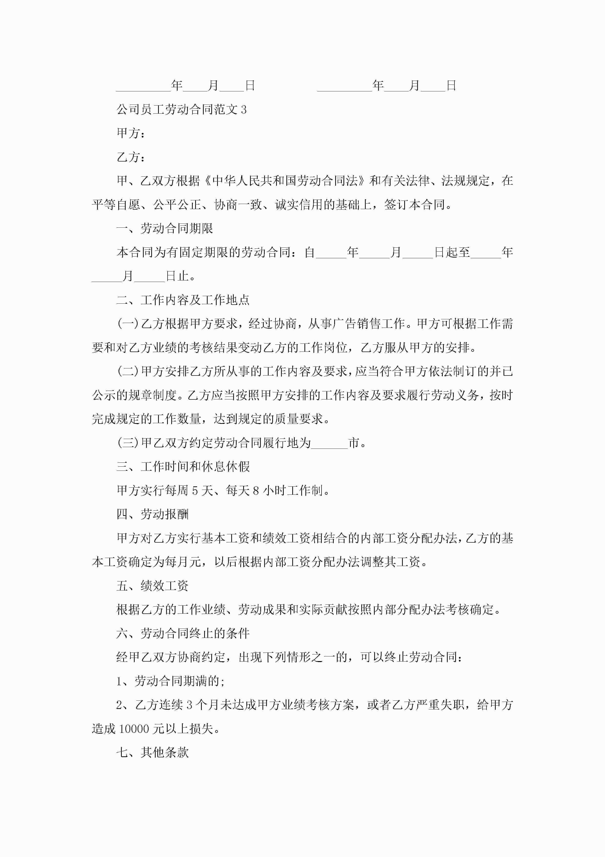 关于公司员工劳动合同范文5篇jugei3月23日 01:46发布关注200 关于公司员工劳动合同范文5篇此内容为付费资源,请付费后查看¥10.9 单篇文档限时特惠¥15个人会员开通企业会员开通立即下载无需登陆!可直接快捷下载单个模板付费资源© 版权声明THE ENDWord模板# 实用文档# 实用模板# 合同模板# 劳动合同 如有问题,可点击最底部“联系我们”联系客服 分享QQ空间微博QQ好友海报分享复制链接收藏