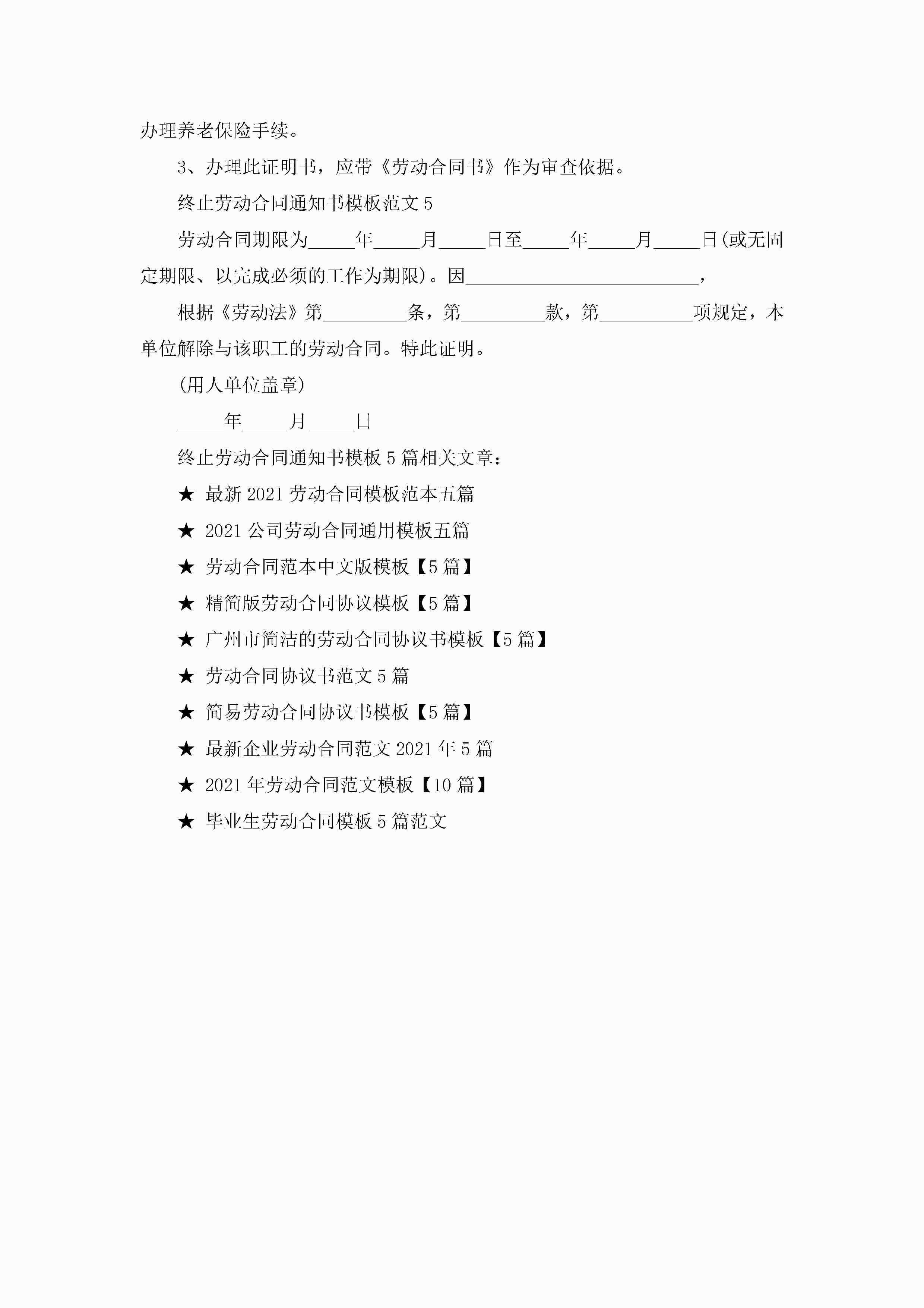 终止劳动合同通知书模板范文5篇jugei3月23日 01:46发布关注208 终止劳动合同通知书模板范文5篇此内容为付费资源,请付费后查看¥10.9 单篇文档限时特惠¥15个人会员开通企业会员开通立即下载无需登陆!可直接快捷下载单个模板付费资源© 版权声明THE ENDWord模板# 实用文档# 实用模板# 合同模板# 劳动合同 如有问题,可点击最底部“联系我们”联系客服 分享QQ空间微博QQ好友海报分享复制链接收藏