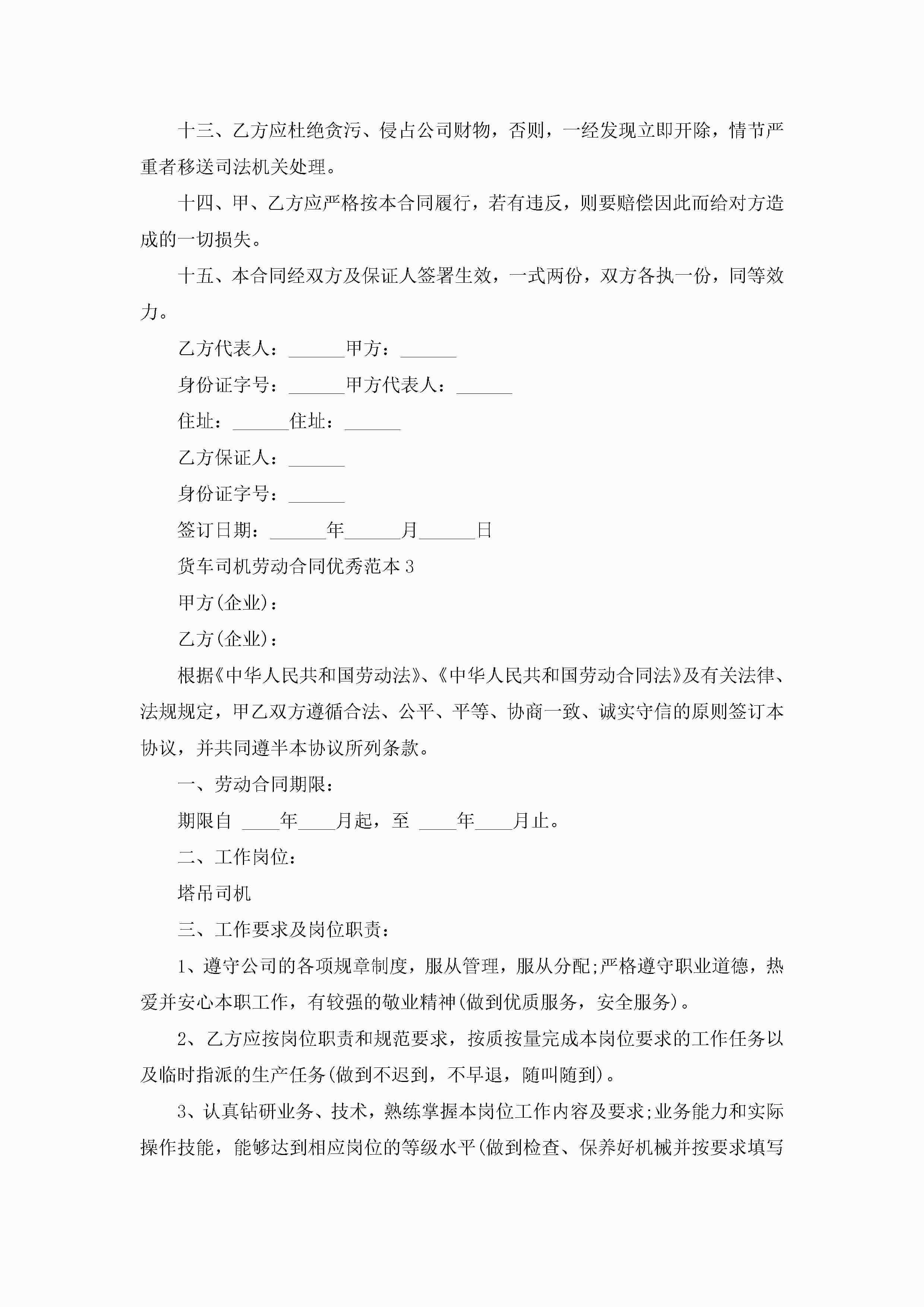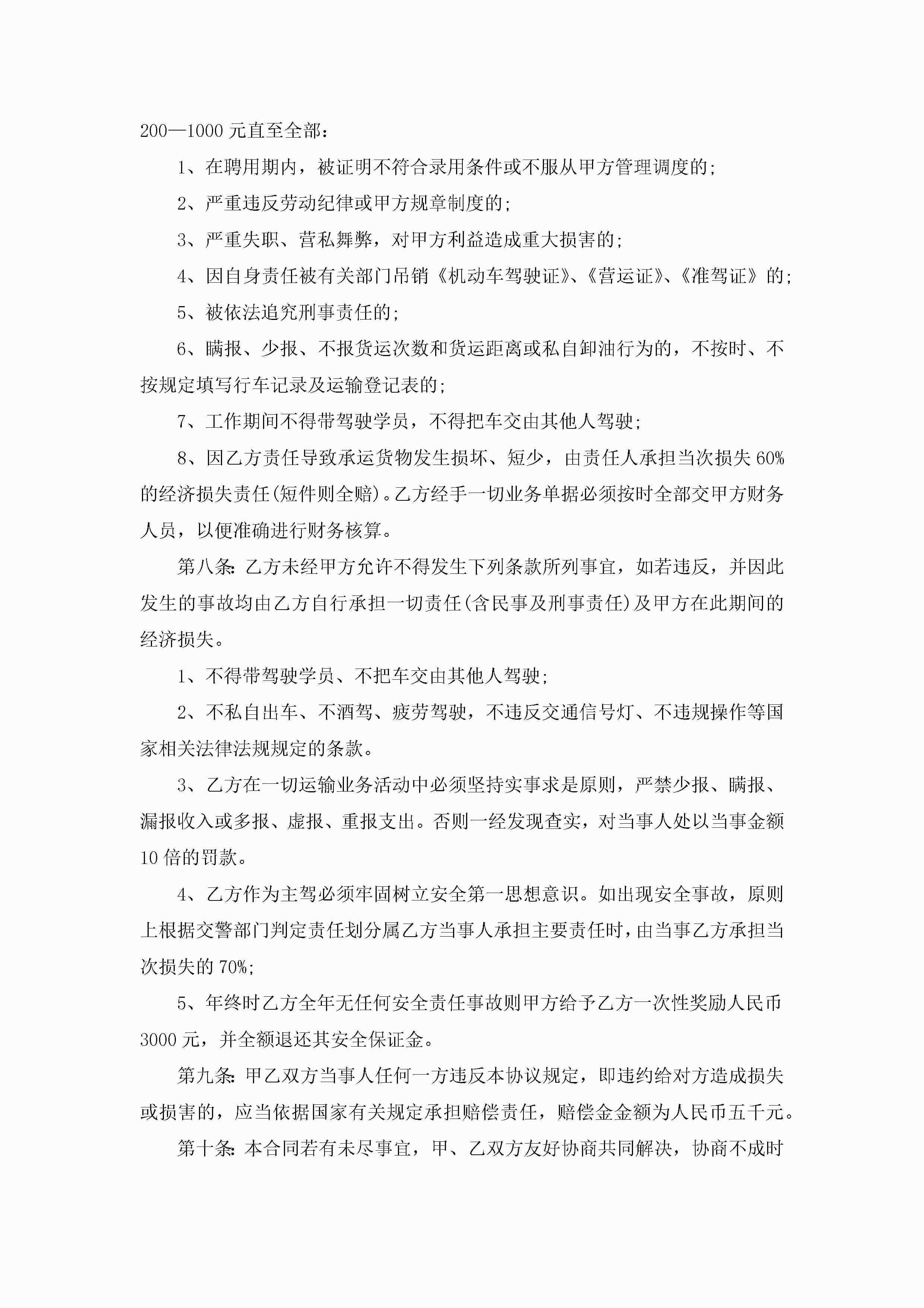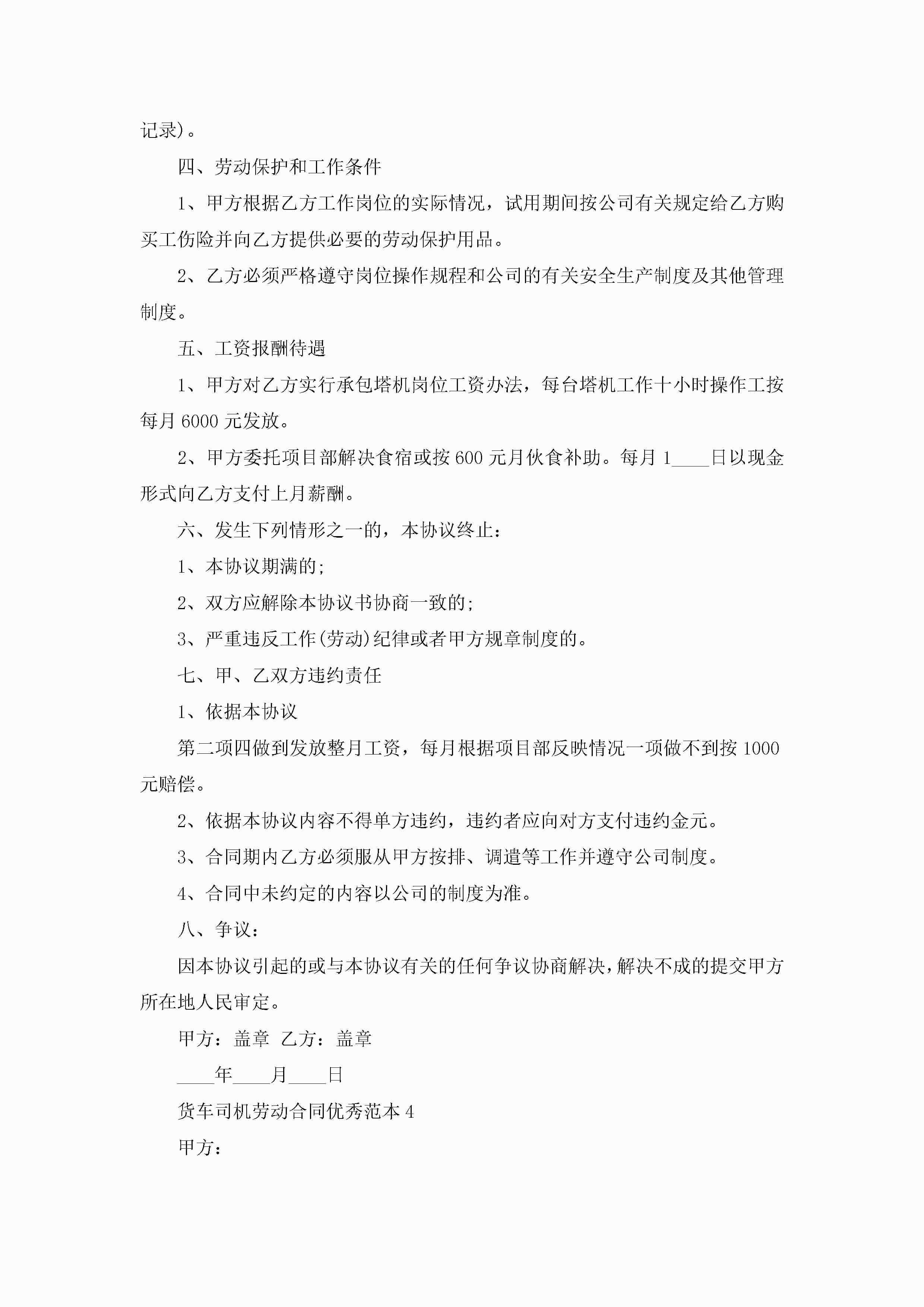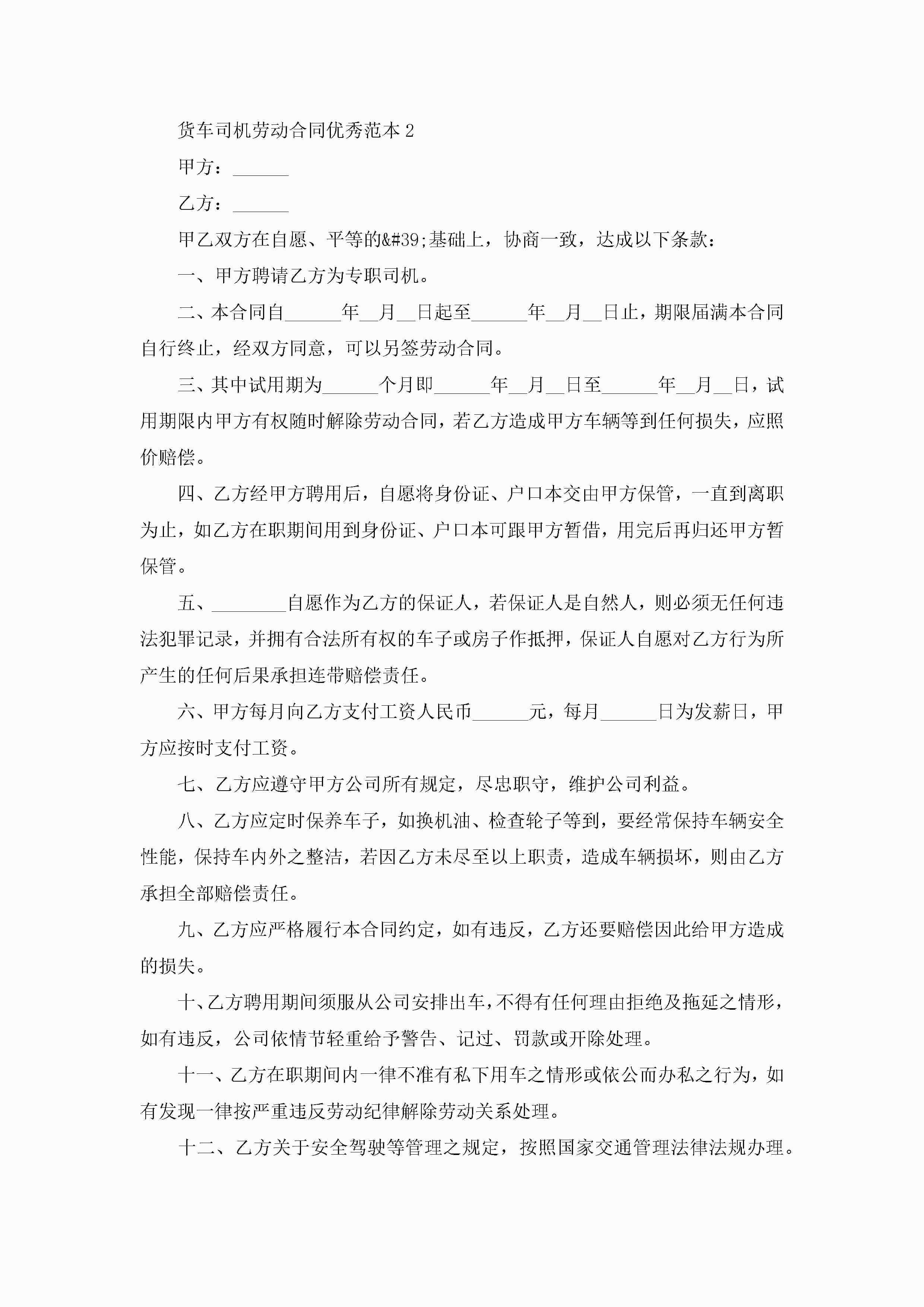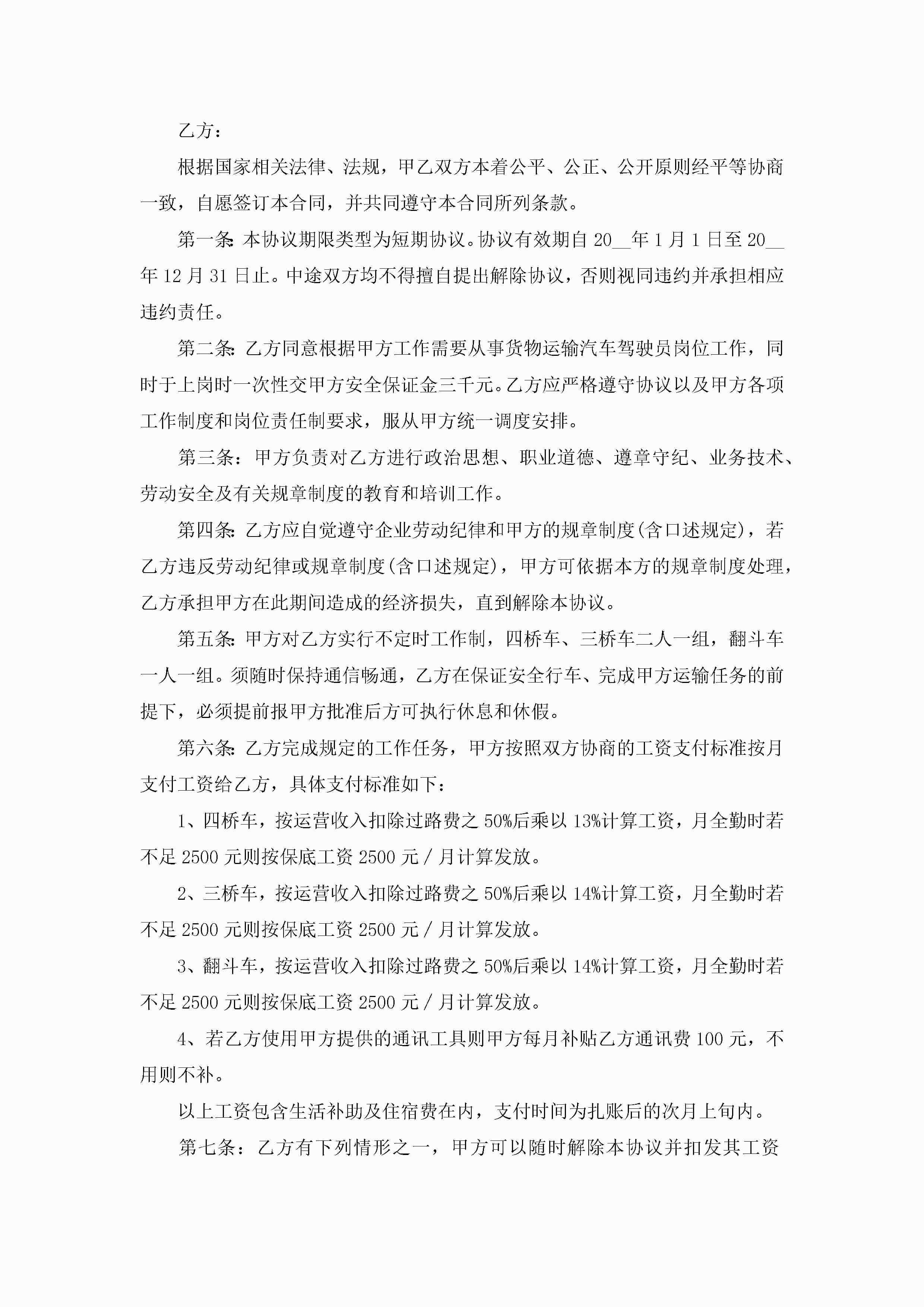 货车司机劳动合同优秀范本5篇jugei3月23日 01:46发布关注184 货车司机劳动合同优秀范本5篇此内容为付费资源,请付费后查看¥10.9 单篇文档限时特惠¥15个人会员开通企业会员开通立即下载无需登陆!可直接快捷下载单个模板付费资源© 版权声明THE ENDWord模板# 实用文档# 实用模板# 合同模板# 劳动合同 如有问题,可点击最底部“联系我们”联系客服 分享QQ空间微博QQ好友海报分享复制链接收藏