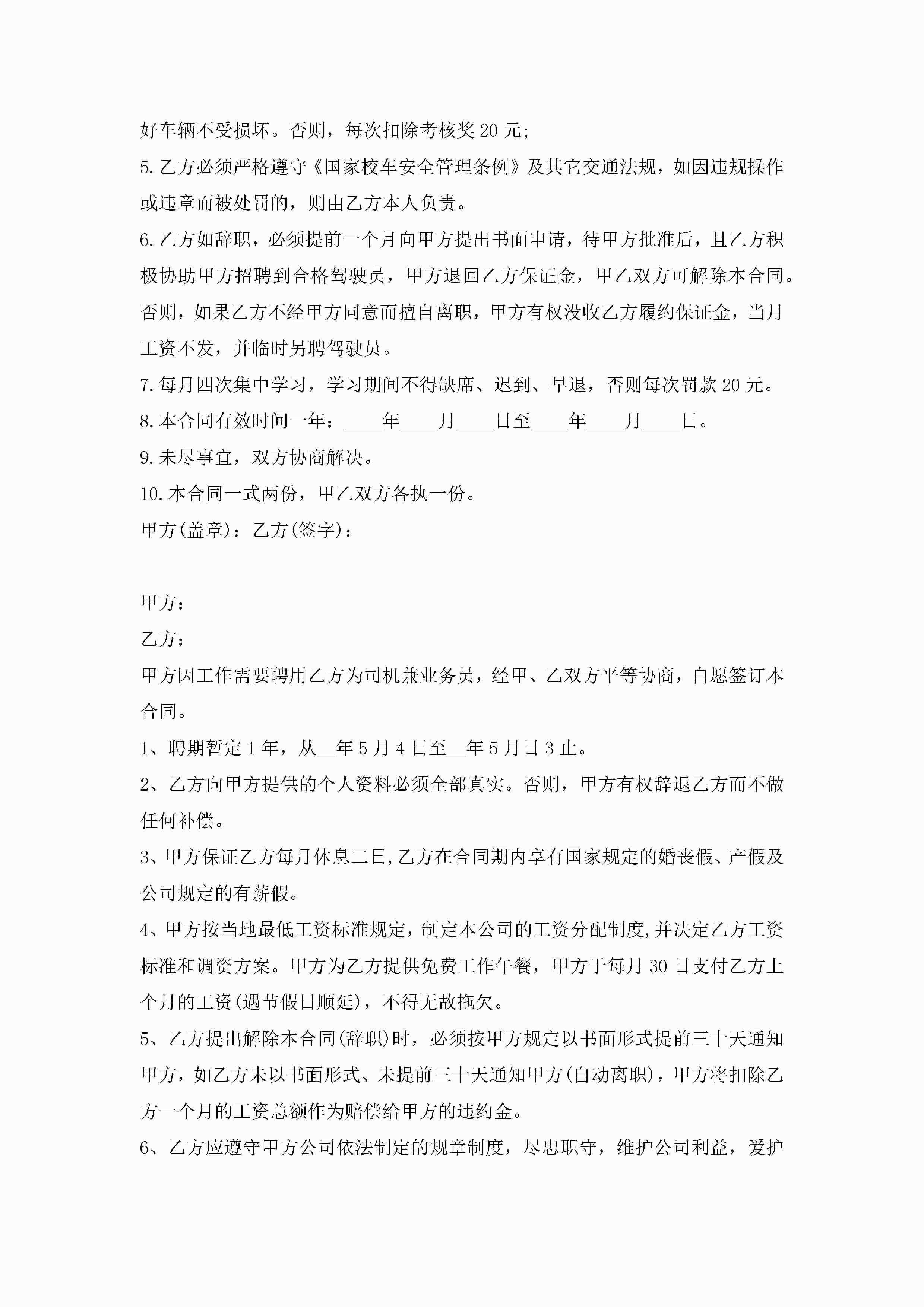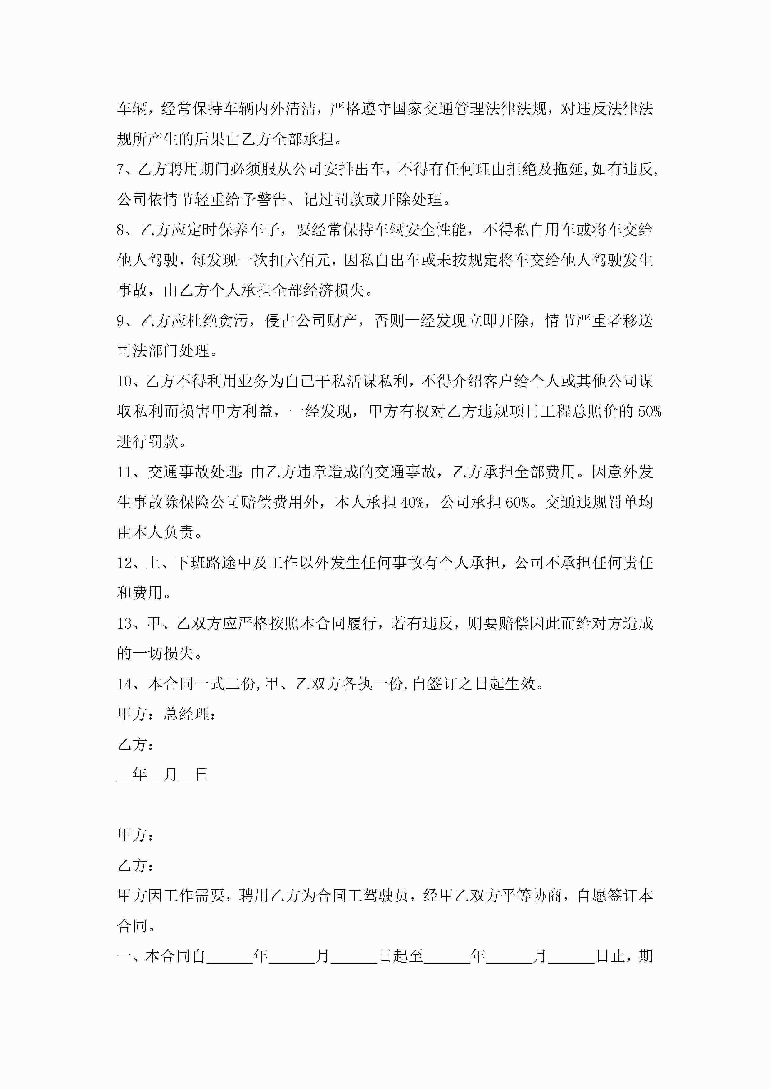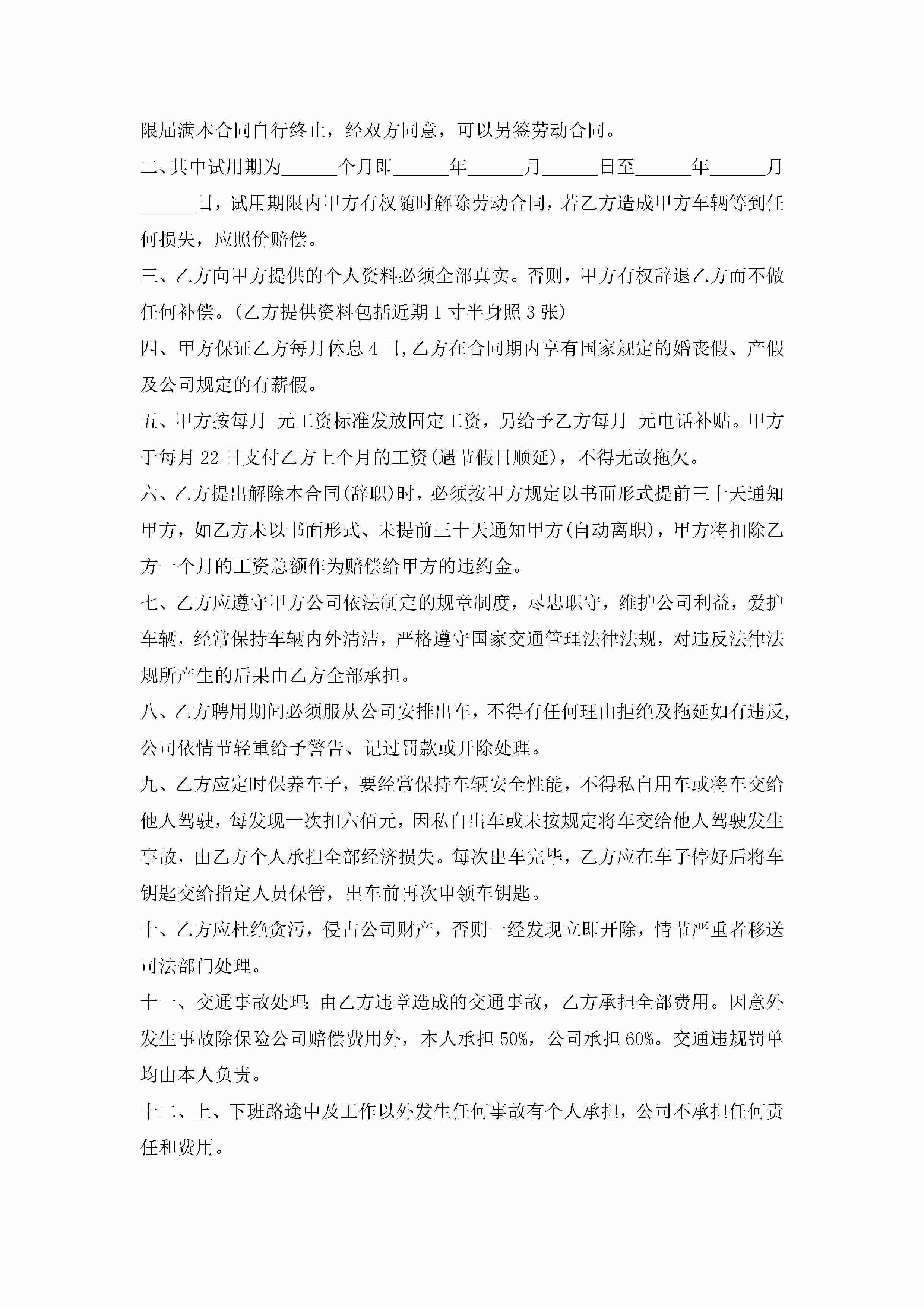 自带车司机劳动合同范文5篇jugei3月23日 01:46发布关注268 自带车司机劳动合同范文5篇此内容为付费资源,请付费后查看¥10.9 单篇文档限时特惠¥15个人会员开通企业会员开通立即下载无需登陆!可直接快捷下载单个模板付费资源© 版权声明THE ENDWord模板# 实用文档# 实用模板# 合同模板# 劳动合同 如有问题,可点击最底部“联系我们”联系客服 分享QQ空间微博QQ好友海报分享复制链接收藏