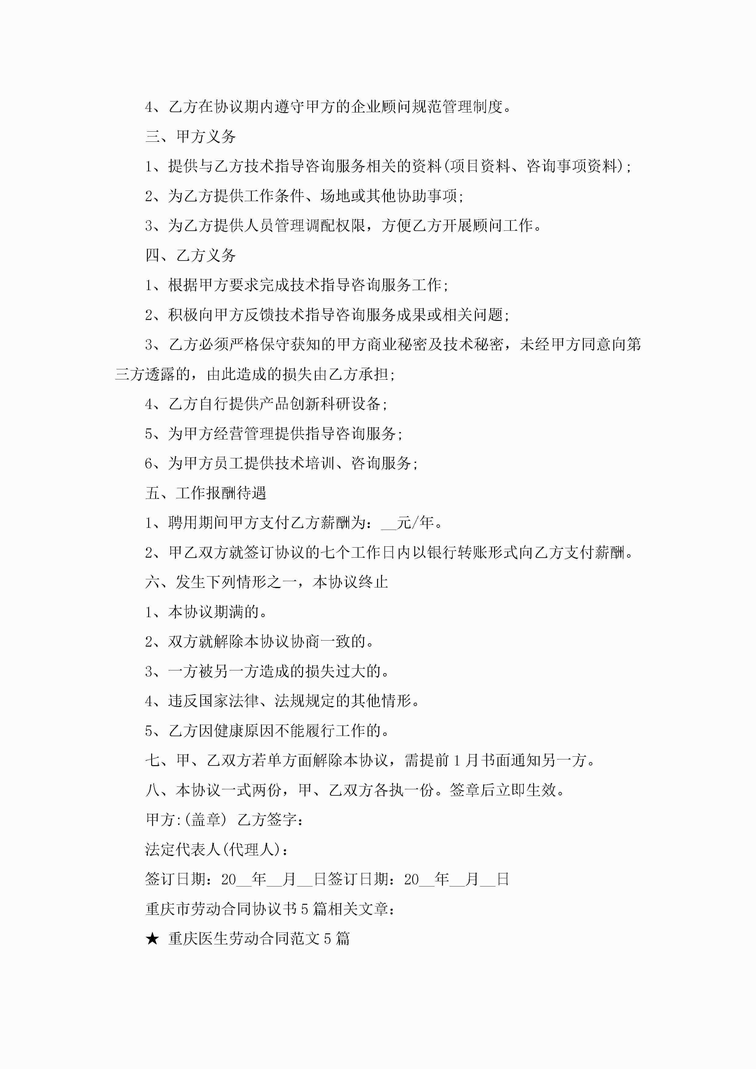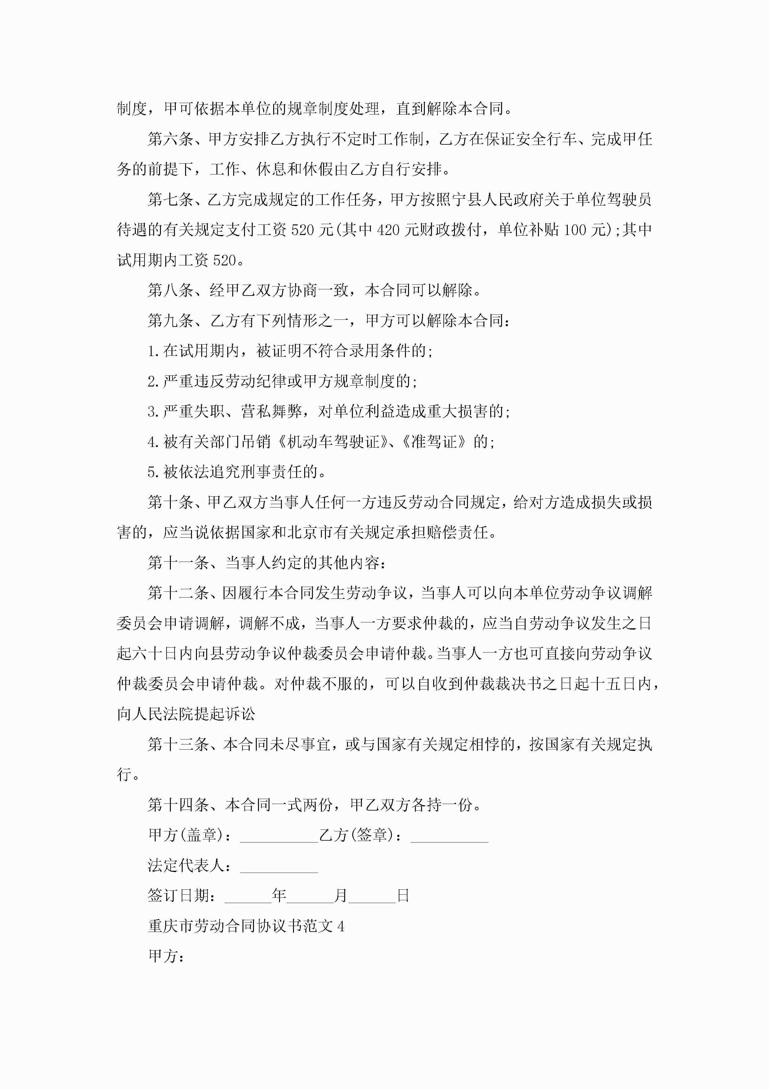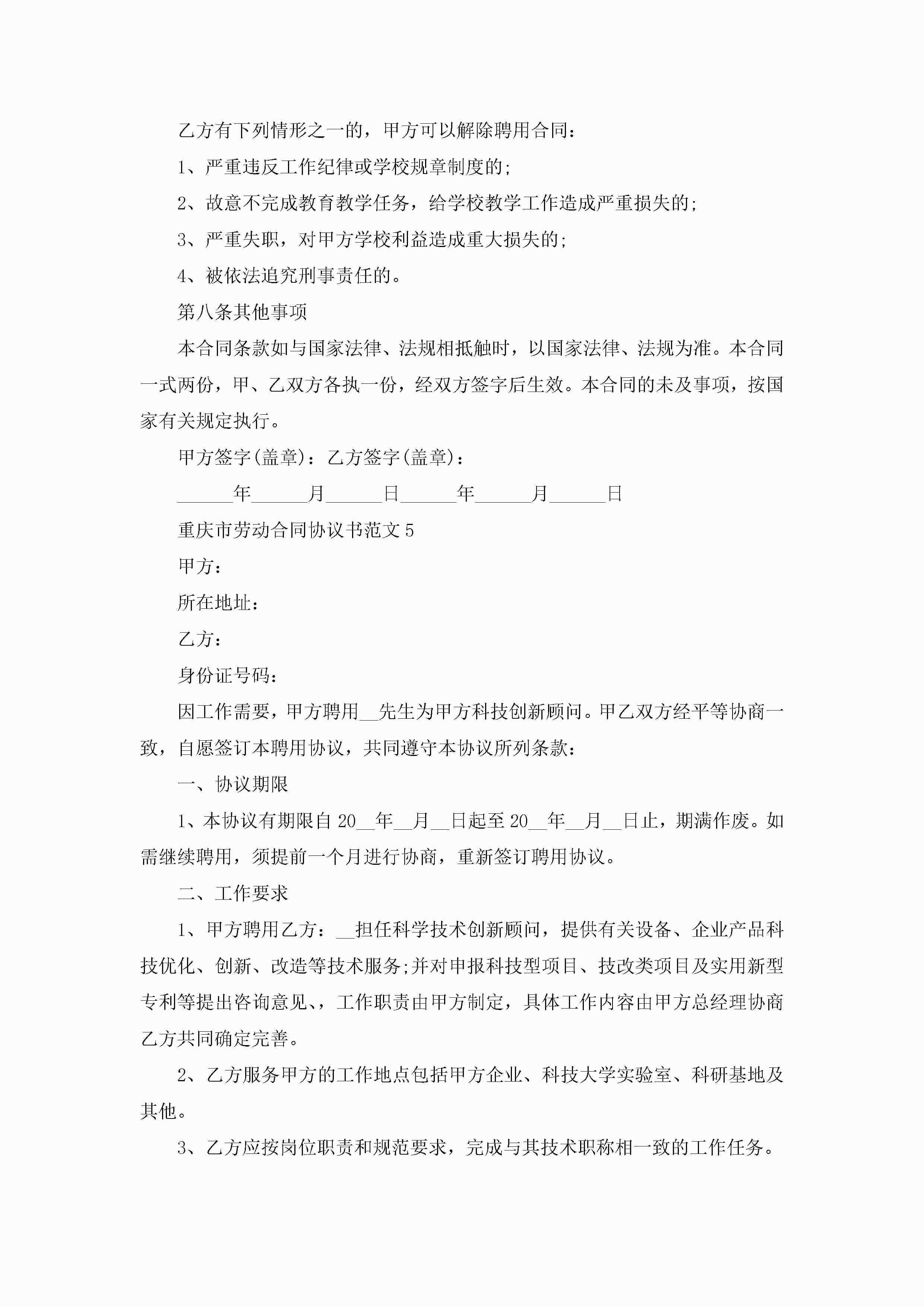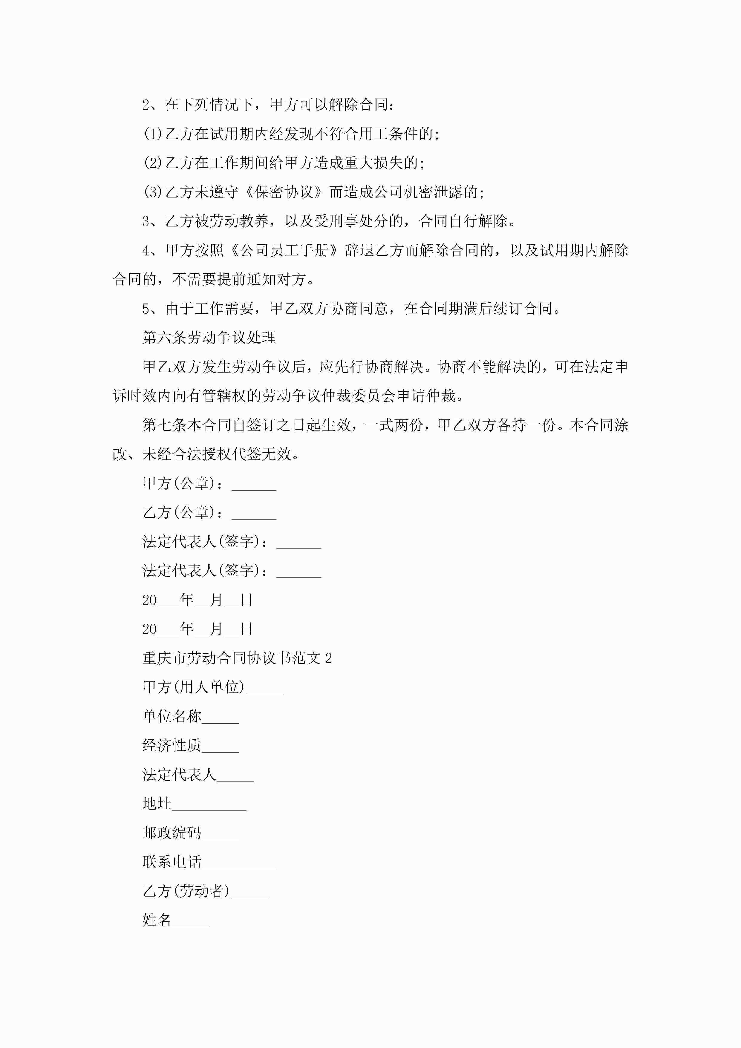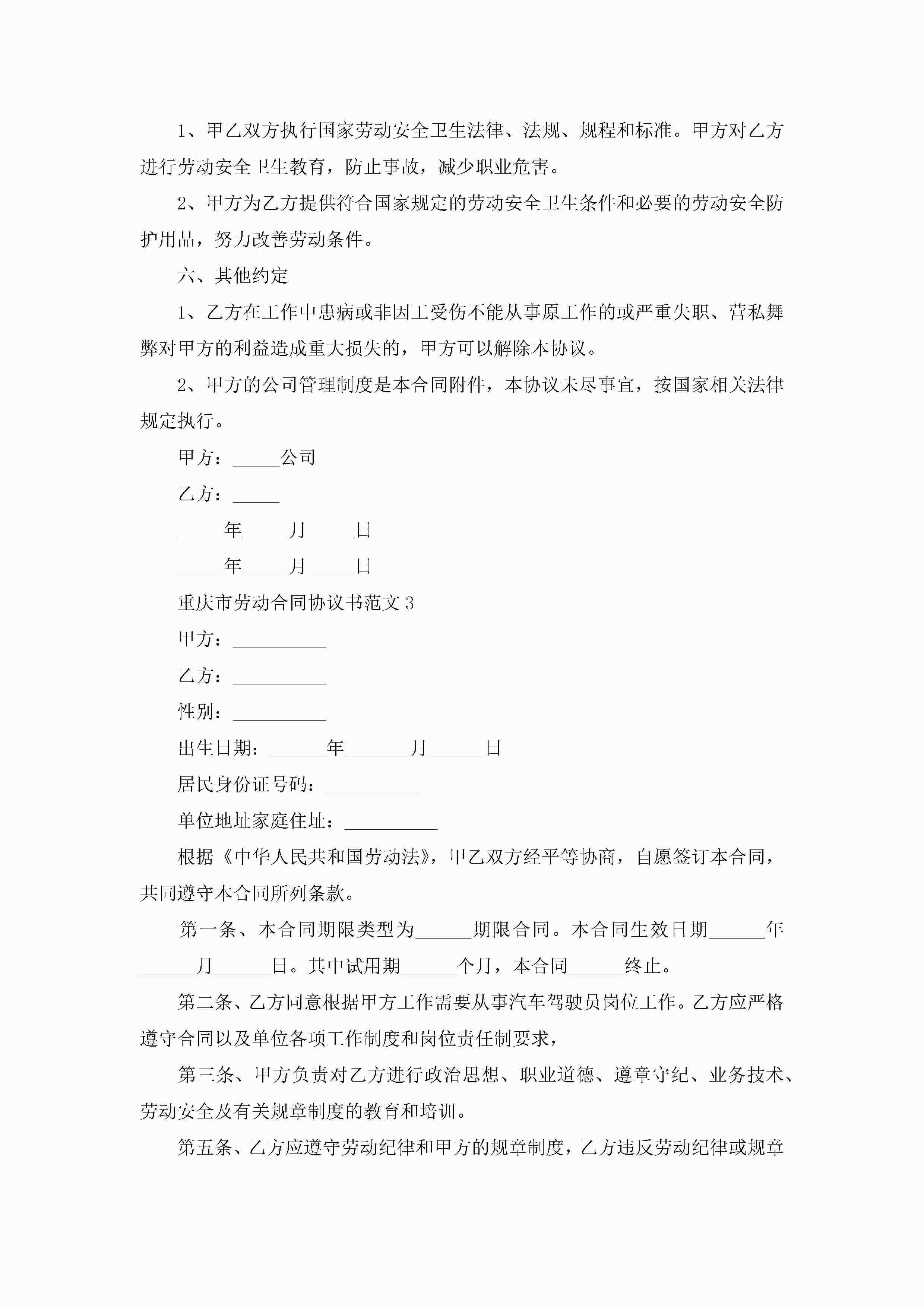 重庆市劳动合同协议书范文5篇jugei3月23日 01:46发布关注184 重庆市劳动合同协议书范文5篇此内容为付费资源,请付费后查看¥10.9 单篇文档限时特惠¥15个人会员开通企业会员开通立即下载无需登陆!可直接快捷下载单个模板付费资源© 版权声明THE ENDWord模板# 实用文档# 实用模板# 合同模板# 劳动合同 如有问题,可点击最底部“联系我们”联系客服 分享QQ空间微博QQ好友海报分享复制链接收藏