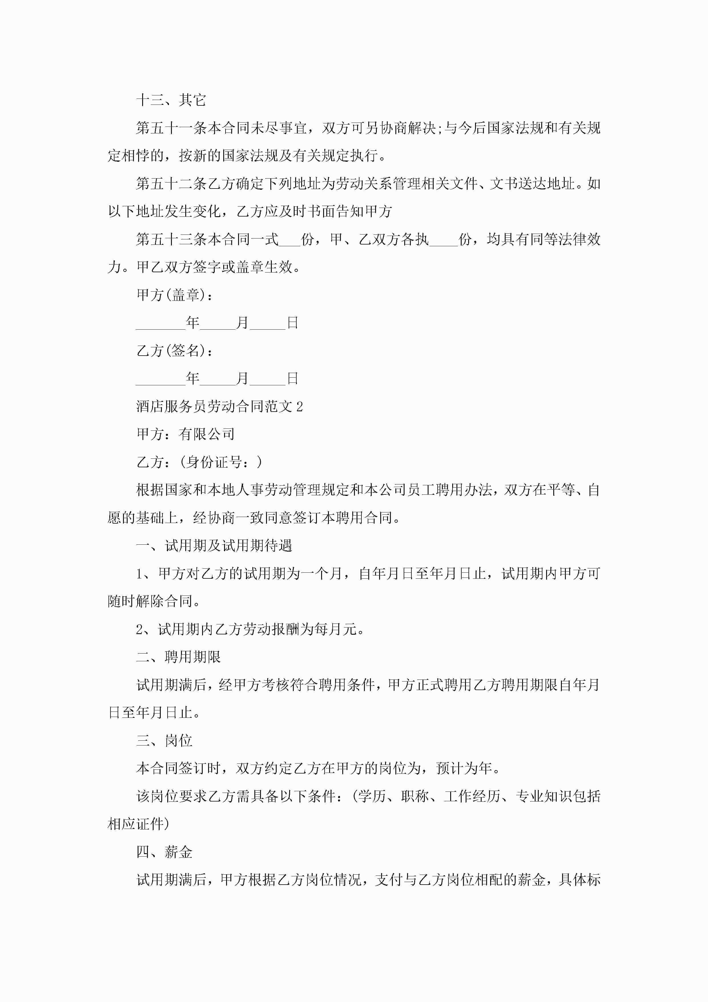 酒店服务员劳动合同范文5篇jugei3月23日 01:46发布关注186 酒店服务员劳动合同范文5篇此内容为付费资源,请付费后查看¥10.9 单篇文档限时特惠¥15个人会员开通企业会员开通立即下载无需登陆!可直接快捷下载单个模板付费资源© 版权声明THE ENDWord模板# 实用文档# 实用模板# 合同模板# 劳动合同 如有问题,可点击最底部“联系我们”联系客服 分享QQ空间微博QQ好友海报分享复制链接收藏