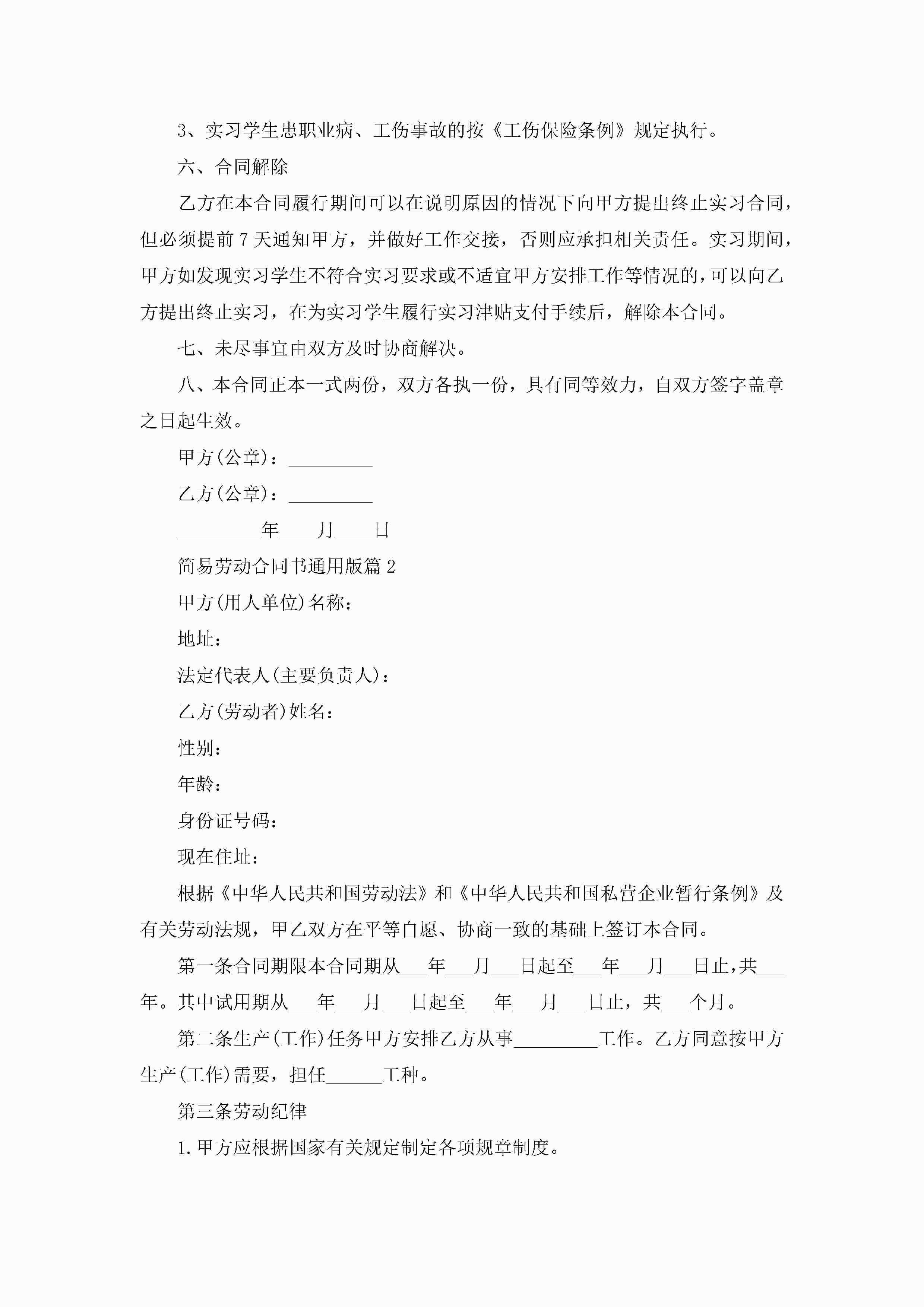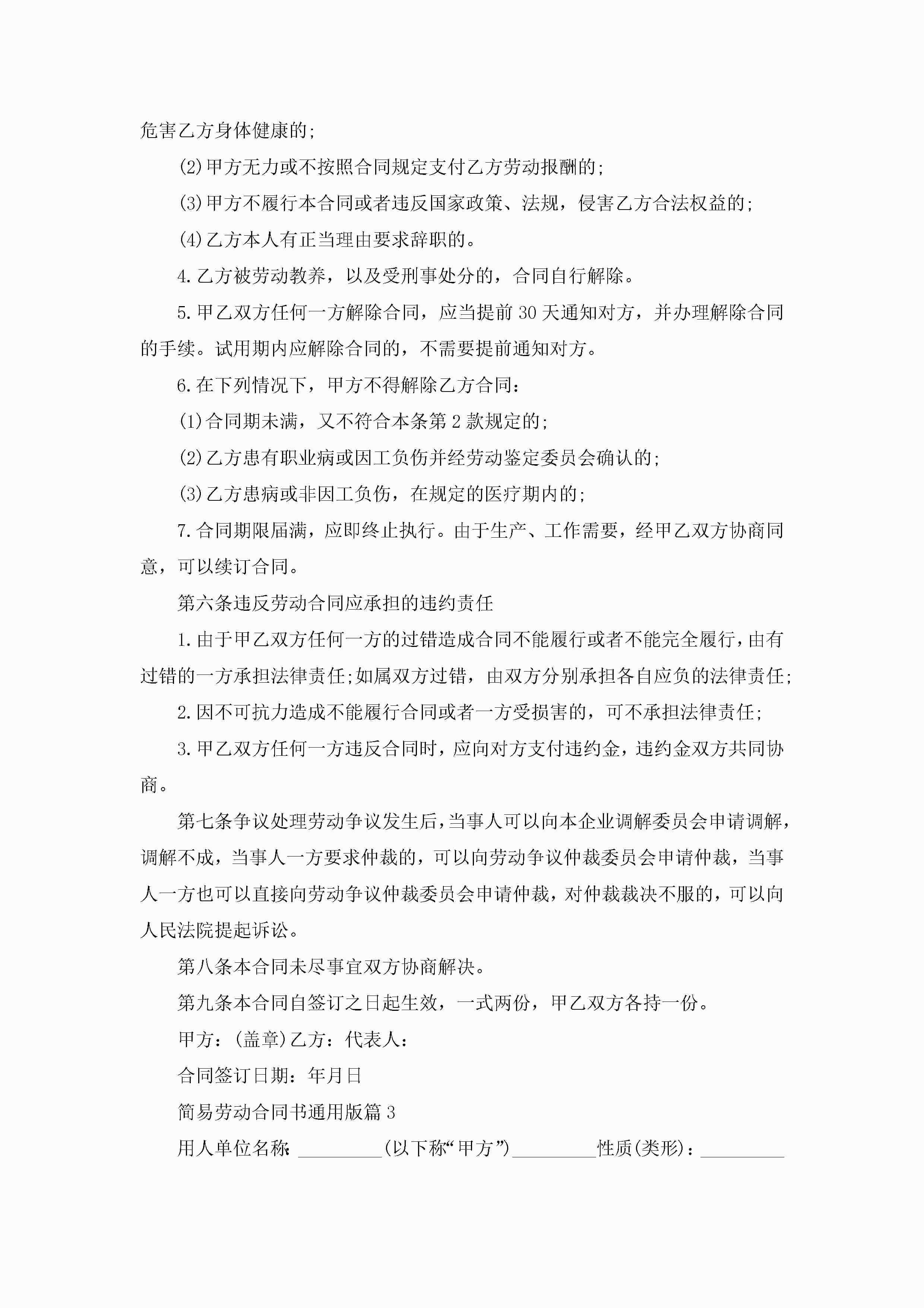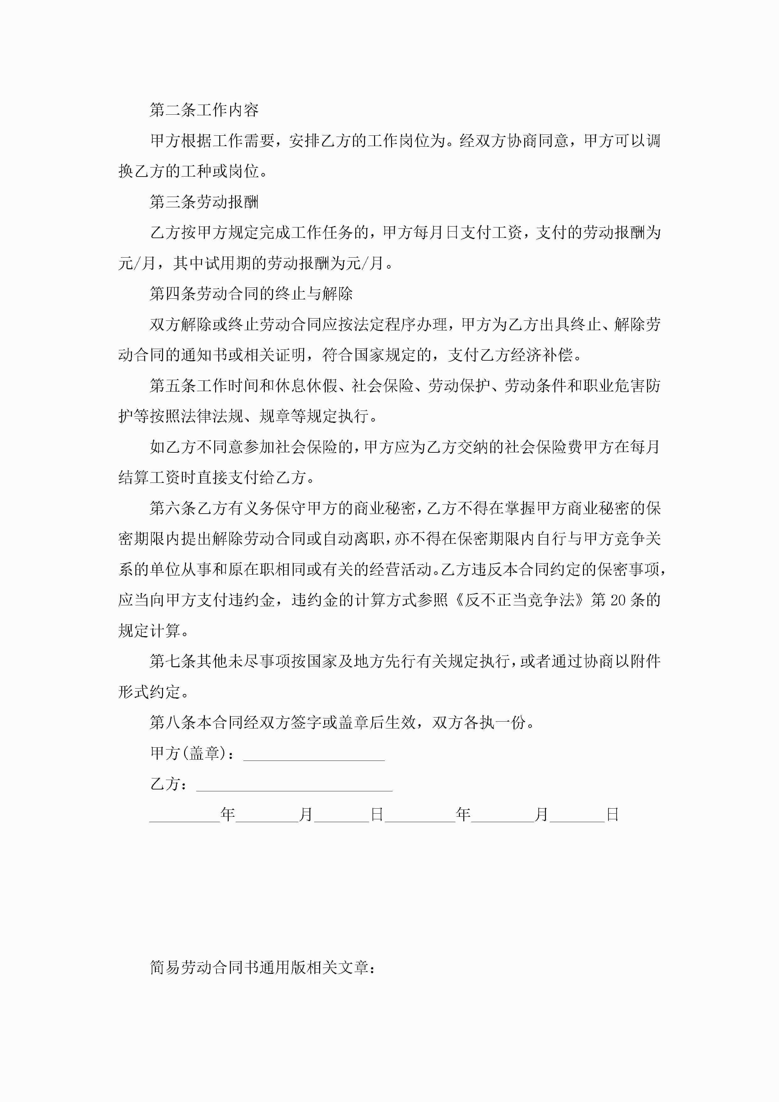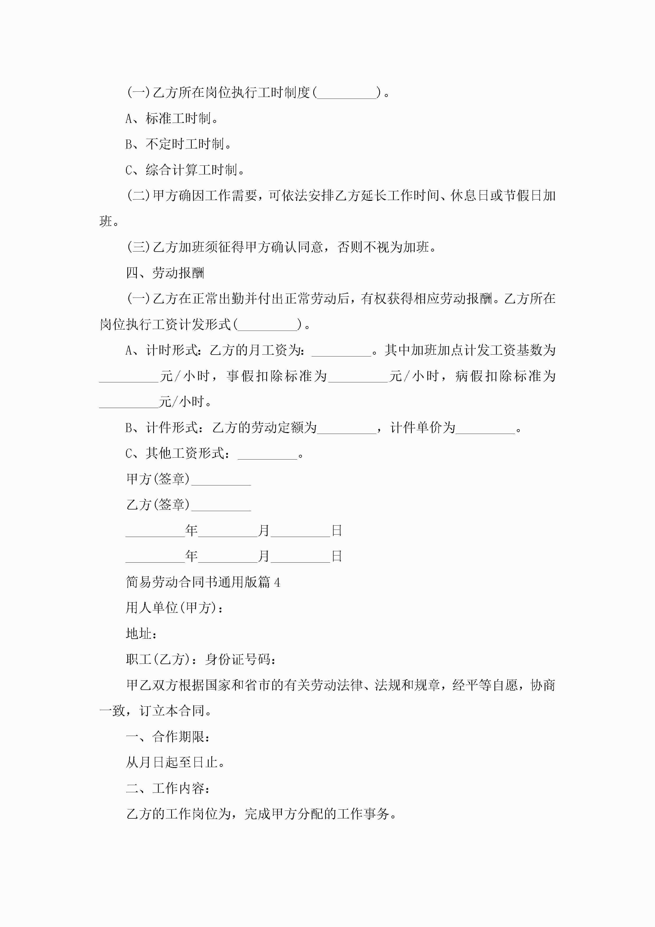 简易劳动合同书最新通用版jugei3月23日 01:46发布关注197 简易劳动合同书最新通用版此内容为付费资源,请付费后查看¥10.9 单篇文档限时特惠¥15个人会员开通企业会员开通立即下载无需登陆!可直接快捷下载单个模板付费资源© 版权声明THE ENDWord模板# 实用文档# 实用模板# 合同模板# 劳动合同 如有问题,可点击最底部“联系我们”联系客服 分享QQ空间微博QQ好友海报分享复制链接收藏