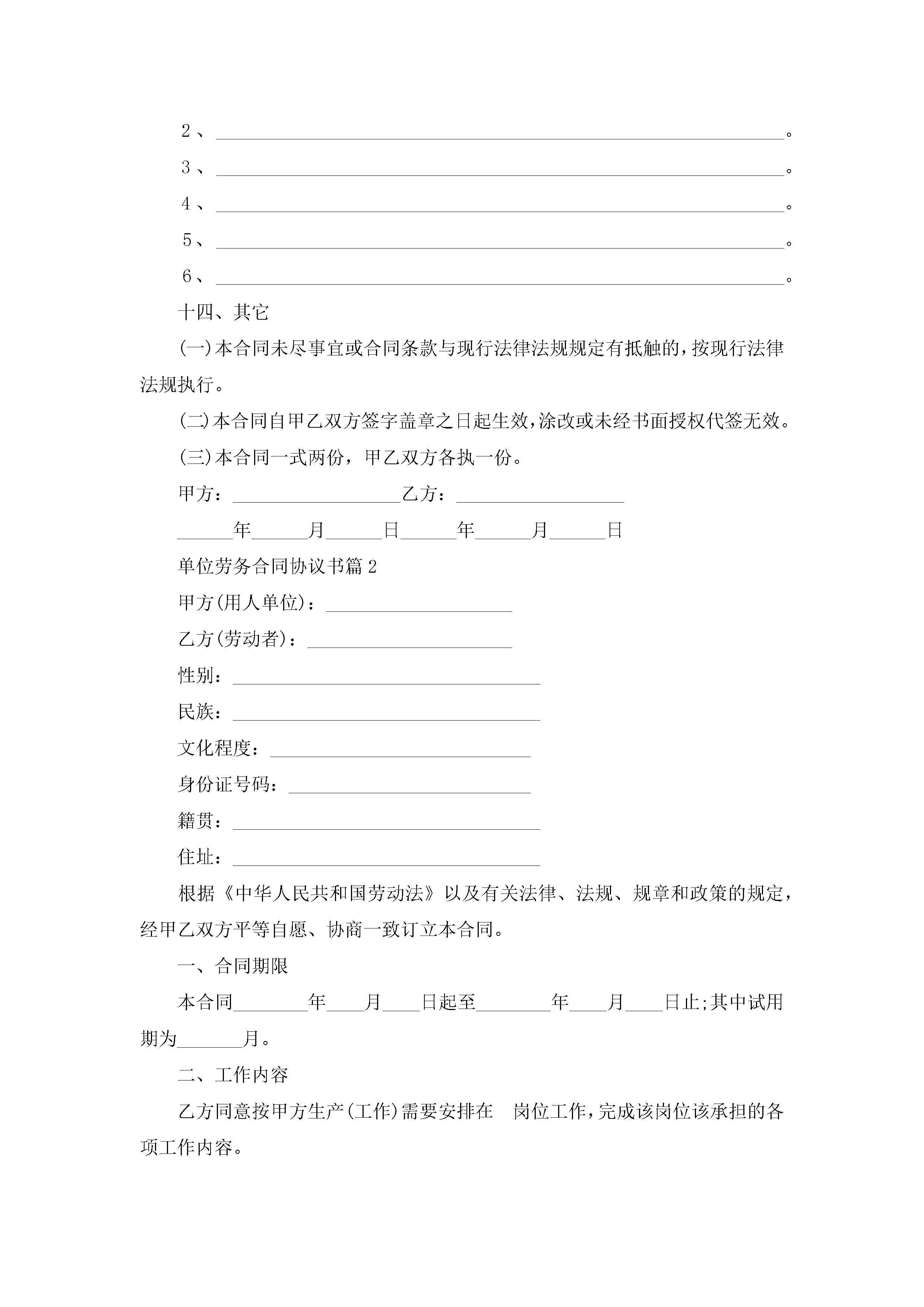 单位劳务合同协议书7篇jugei3月23日 01:46发布关注193 单位劳务合同协议书7篇此内容为付费资源,请付费后查看¥10.9 单篇文档限时特惠¥15个人会员开通企业会员开通立即下载无需登陆!可直接快捷下载单个模板付费资源© 版权声明THE ENDWord模板# 实用文档# 实用模板# 合同模板# 劳动合同 如有问题,可点击最底部“联系我们”联系客服 分享QQ空间微博QQ好友海报分享复制链接收藏