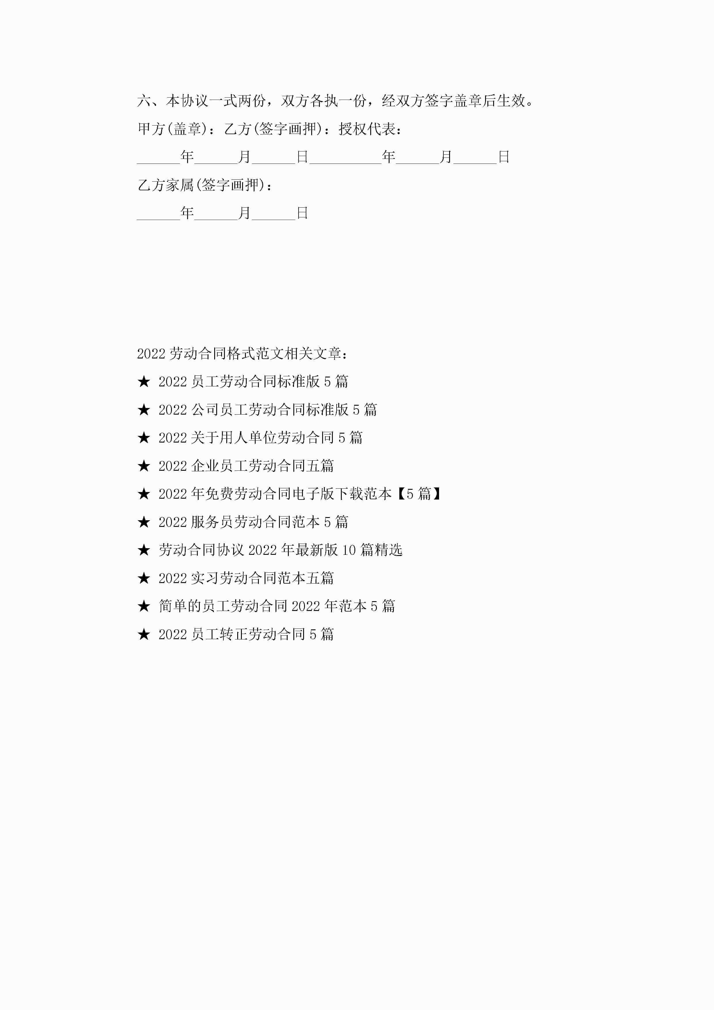 2022劳动合同格式范文模板jugei3月23日 01:46发布关注189 2022劳动合同格式范文模板此内容为付费资源,请付费后查看¥10.9 单篇文档限时特惠¥15个人会员开通企业会员开通立即下载无需登陆!可直接快捷下载单个模板付费资源© 版权声明THE ENDWord模板# 实用文档# 实用模板# 合同模板# 劳动合同 如有问题,可点击最底部“联系我们”联系客服 分享QQ空间微博QQ好友海报分享复制链接收藏