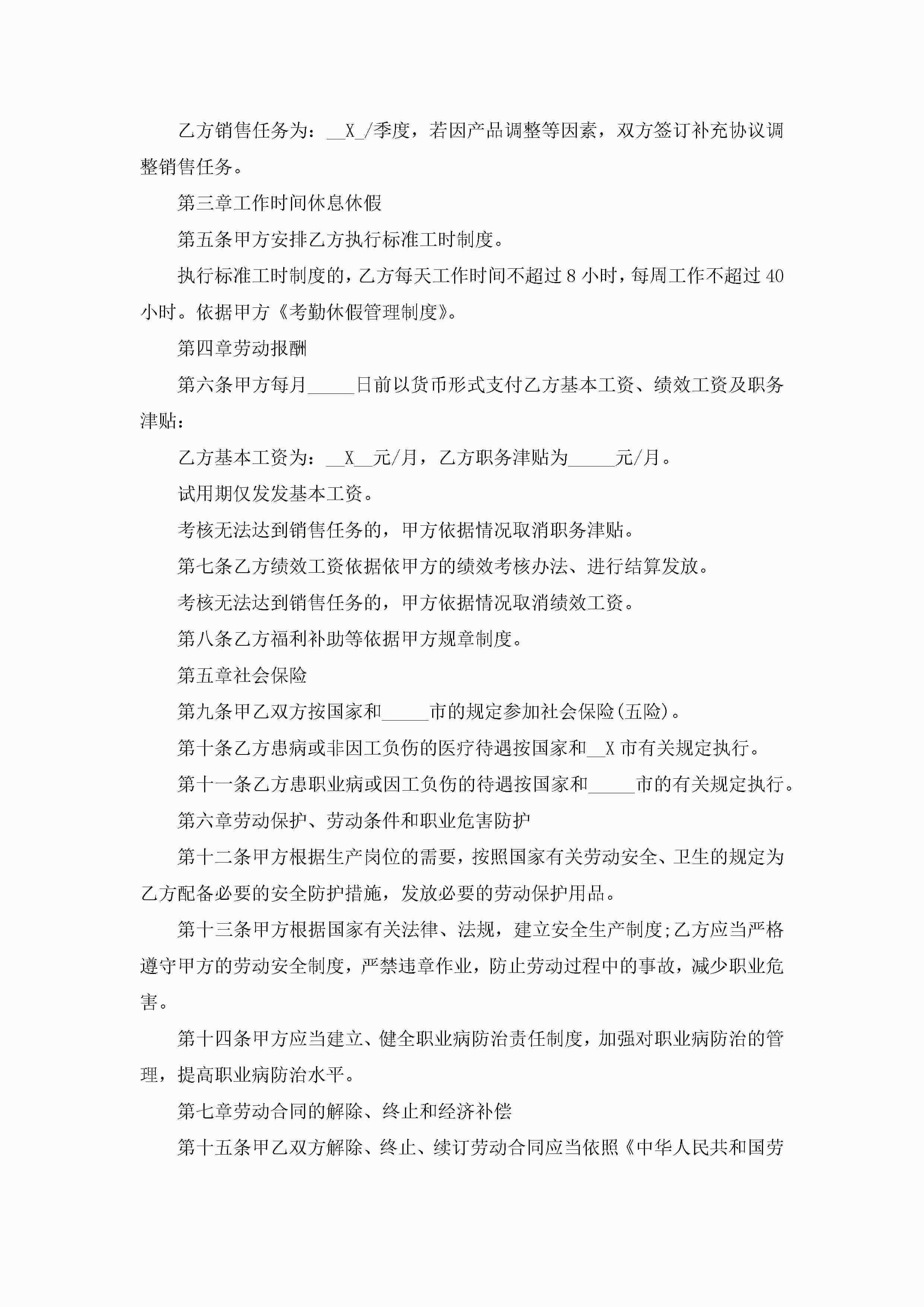 公司销售人员劳动合同精选【7篇】jugei3月23日 01:46发布关注190 公司销售人员劳动合同精选【7篇】此内容为付费资源,请付费后查看¥10.9 单篇文档限时特惠¥15个人会员开通企业会员开通立即下载无需登陆!可直接快捷下载单个模板付费资源© 版权声明THE ENDWord模板# 实用文档# 合同模板# 劳动合同# 公司销售人员劳动合同精选 如有问题,可点击最底部“联系我们”联系客服 分享QQ空间微博QQ好友海报分享复制链接收藏