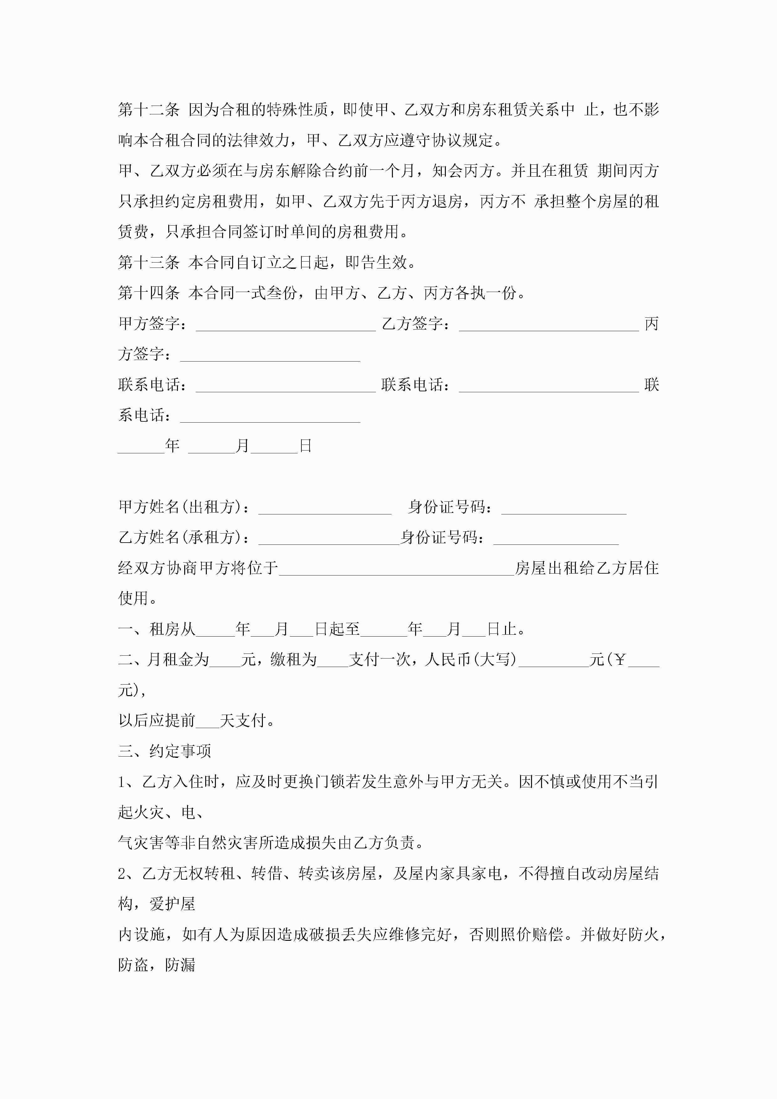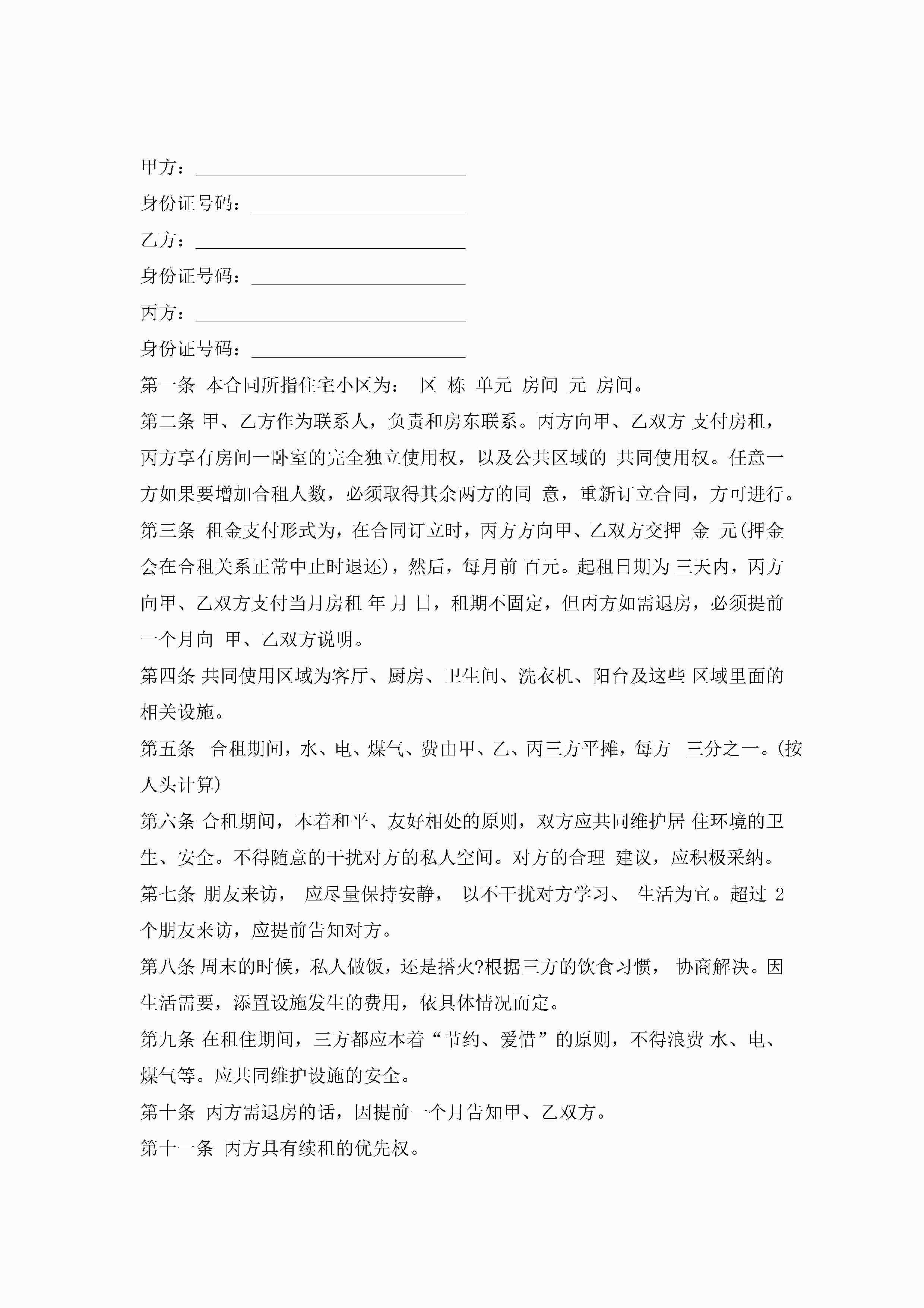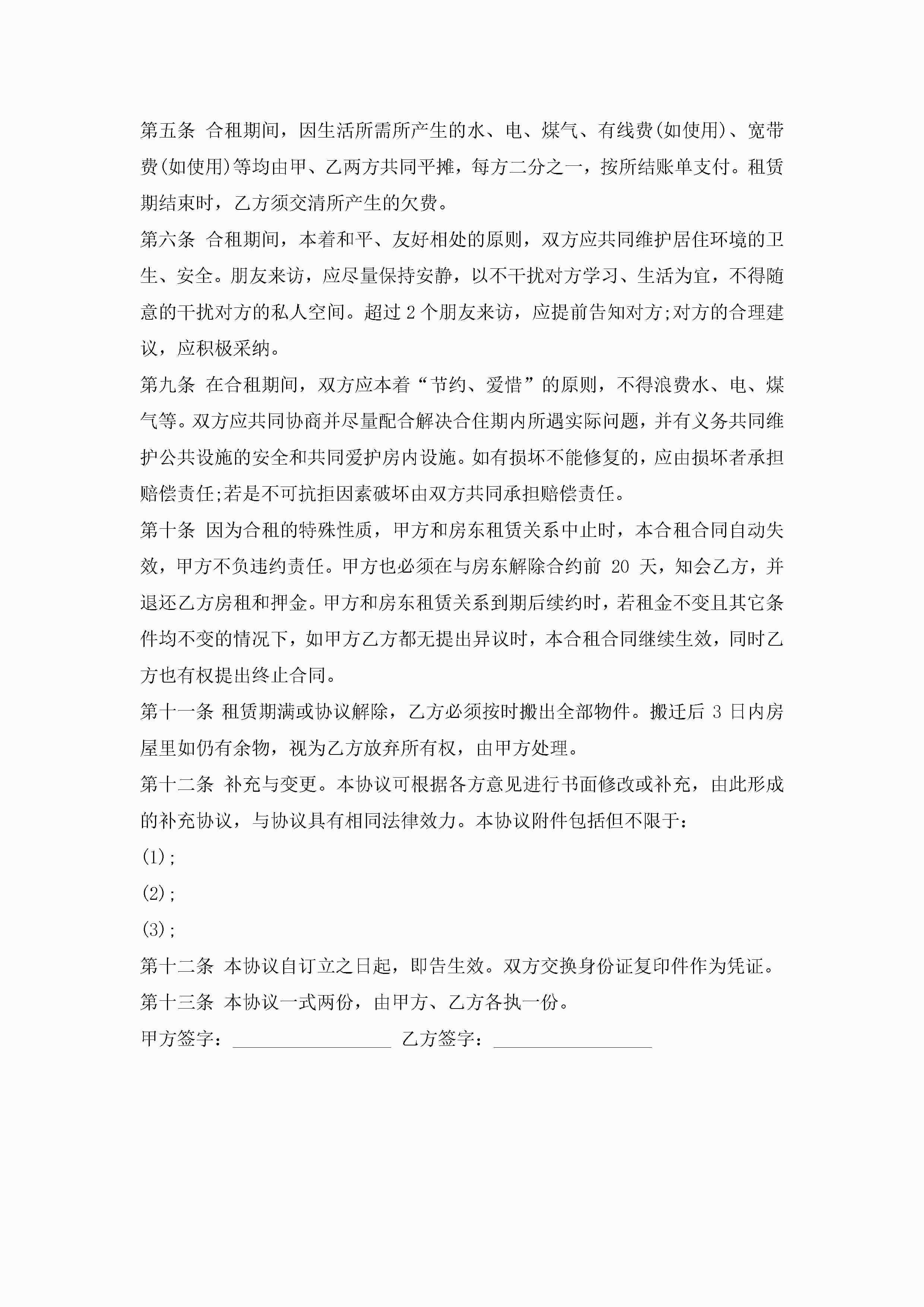 简单的合租租房合同5篇jugei3月23日 01:47发布关注243 简单的合租租房合同5篇此内容为付费资源,请付费后查看¥10.9 单篇文档限时特惠¥15个人会员开通企业会员开通立即下载无需登陆!可直接快捷下载单个模板付费资源© 版权声明THE ENDWord模板# 实用文档# 实用模板# 合同模板# 租房合同 如有问题,可点击最底部“联系我们”联系客服 分享QQ空间微博QQ好友海报分享复制链接收藏