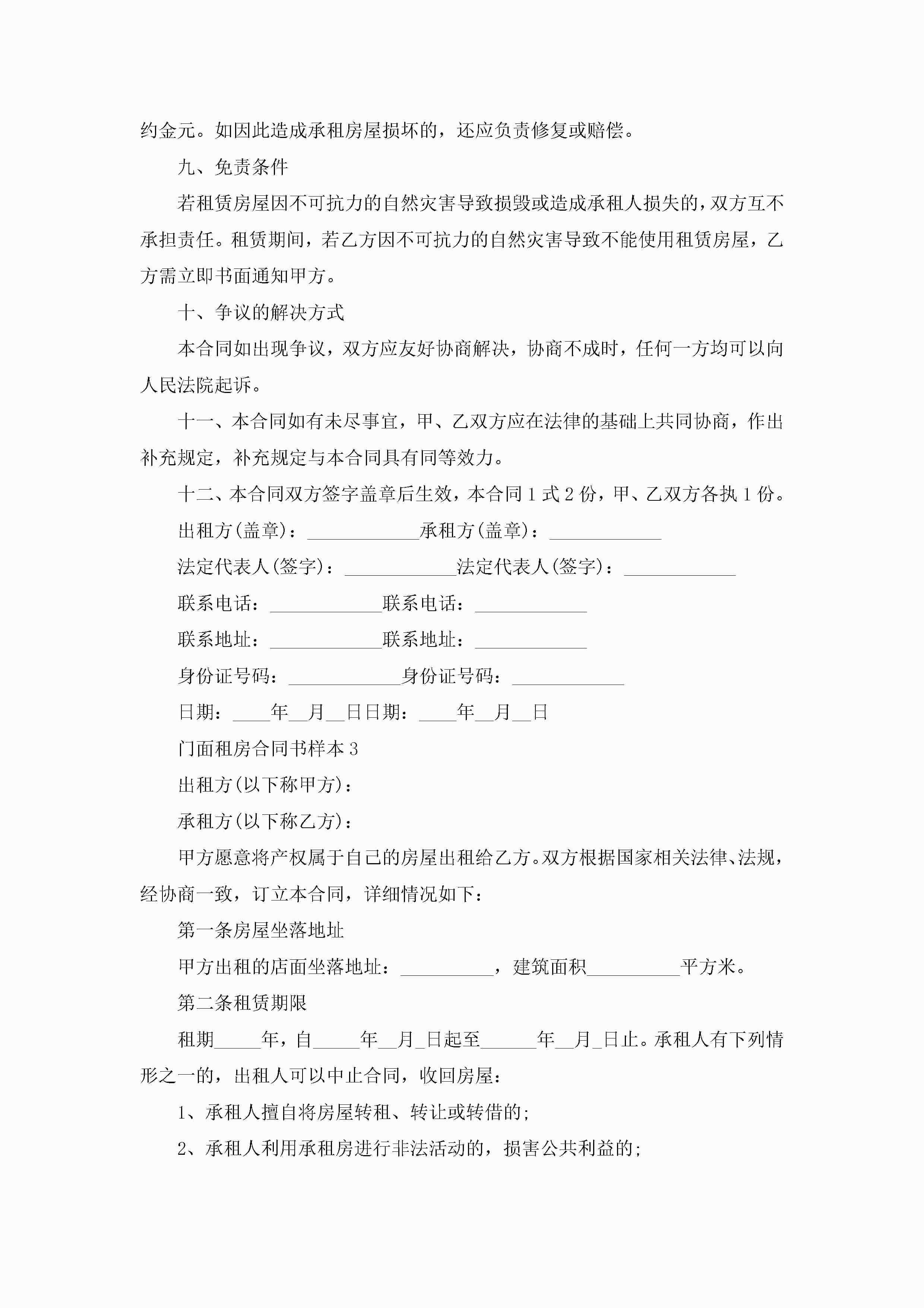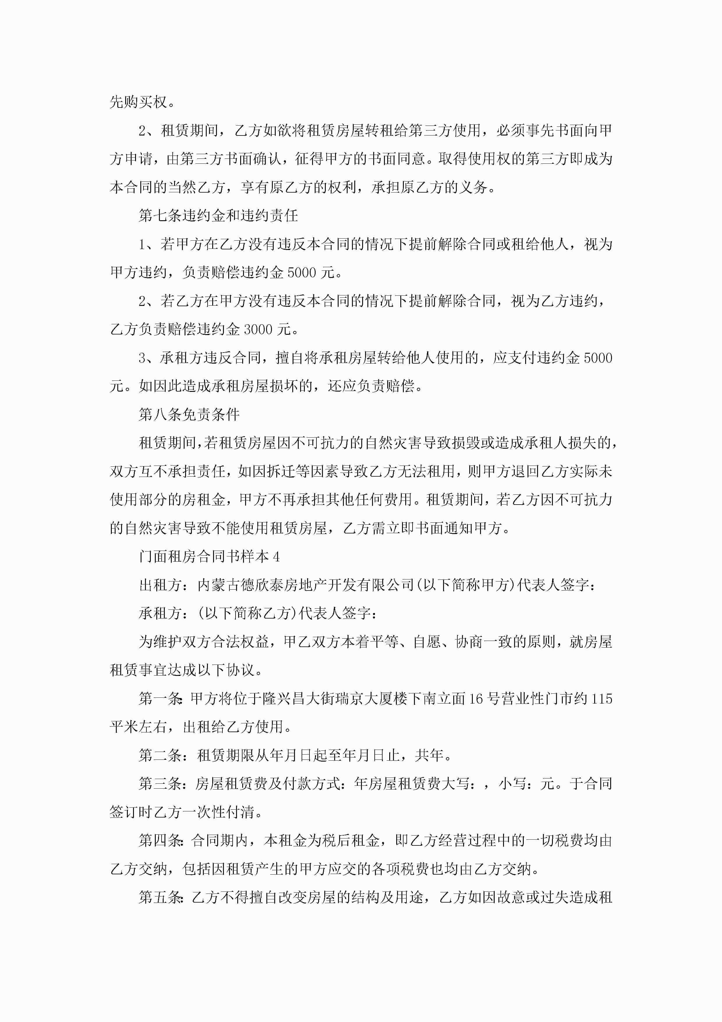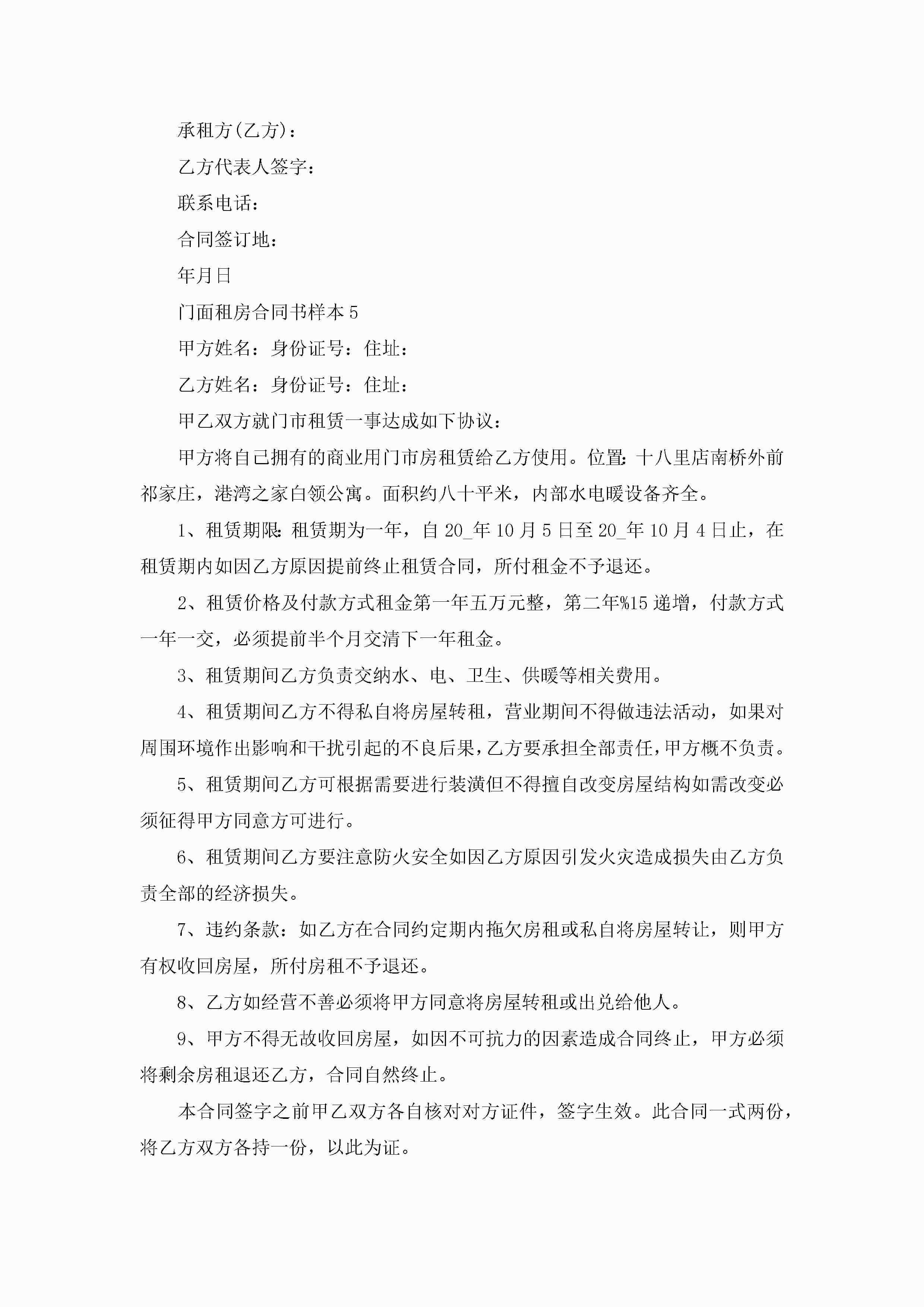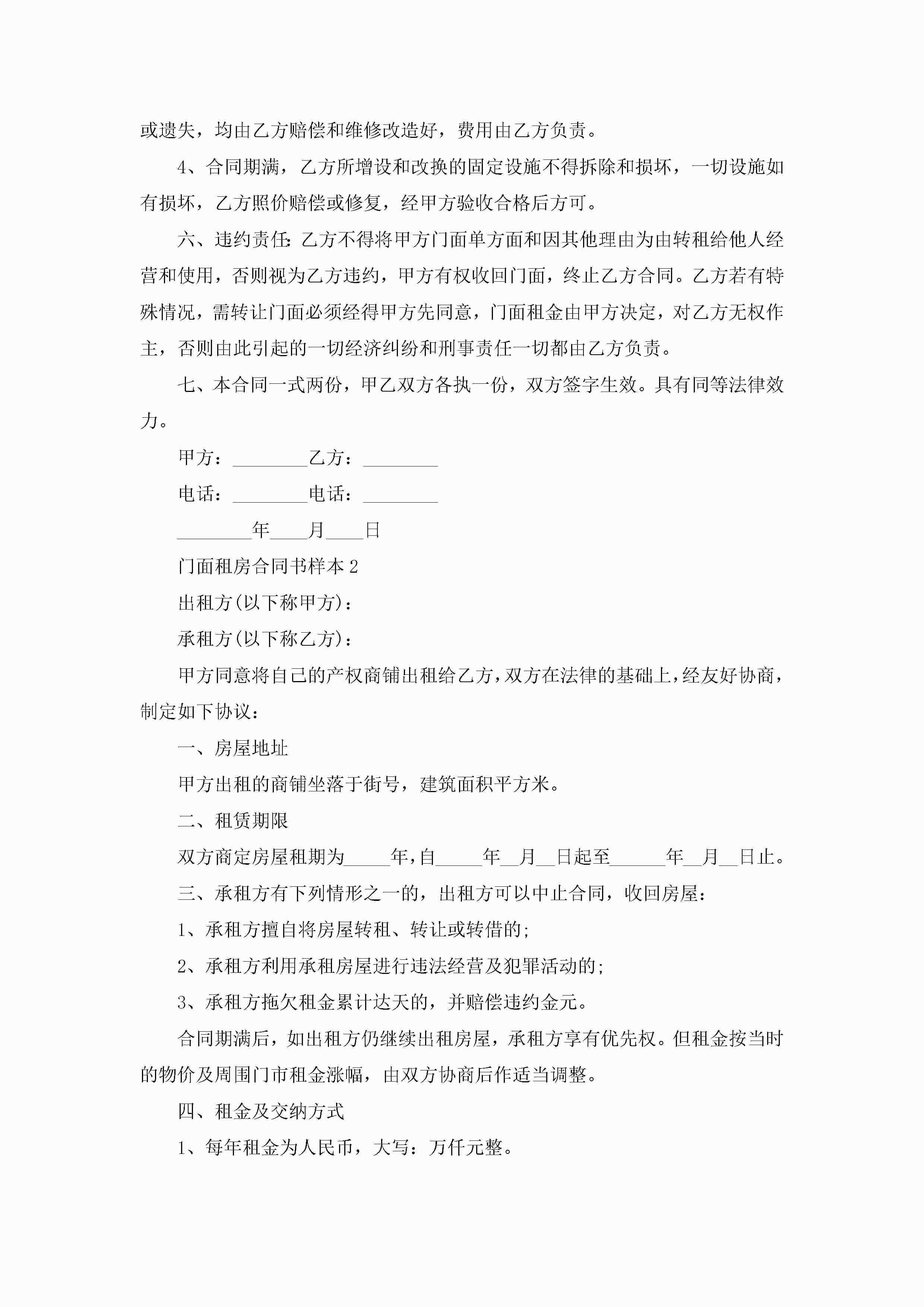 门面租房合同书样本5篇jugei3月23日 01:47发布关注216 门面租房合同书样本5篇此内容为付费资源,请付费后查看¥10.9 单篇文档限时特惠¥15个人会员开通企业会员开通立即下载无需登陆!可直接快捷下载单个模板付费资源© 版权声明THE ENDWord模板# 实用文档# 实用模板# 合同模板# 租房合同 如有问题,可点击最底部“联系我们”联系客服 分享QQ空间微博QQ好友海报分享复制链接收藏
