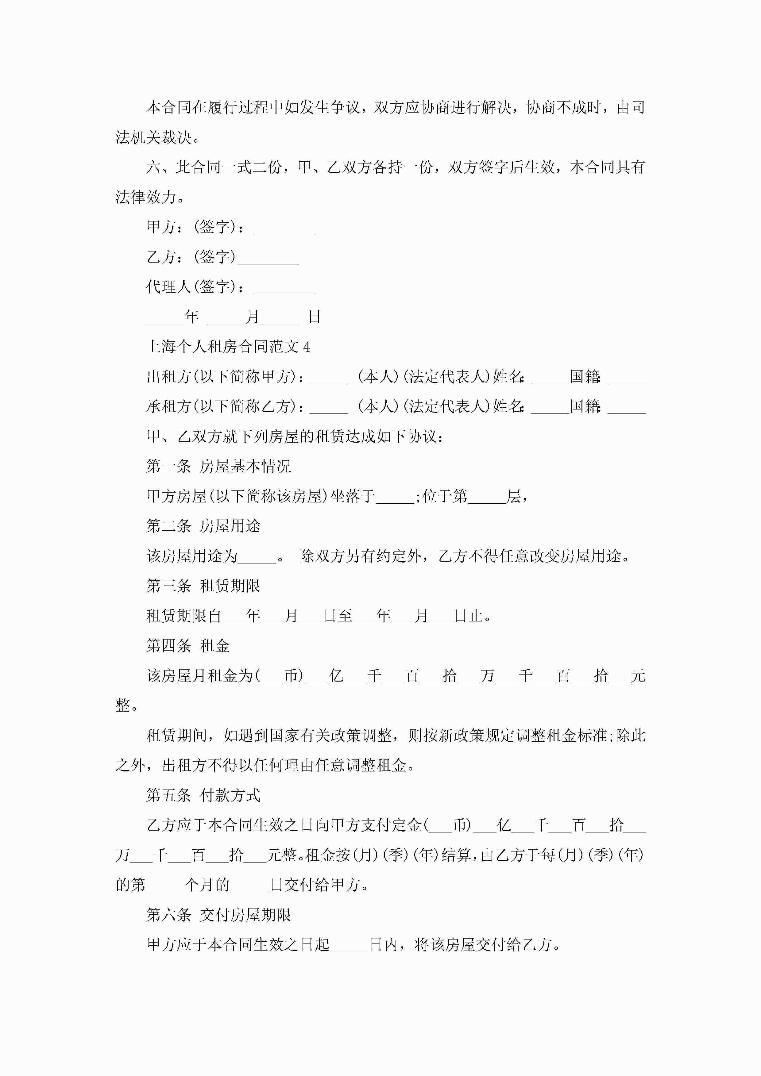 上海个人租房合同范文5篇jugei3月23日 01:48发布关注191 上海个人租房合同范文5篇此内容为付费资源,请付费后查看¥10.9 单篇文档限时特惠¥15个人会员开通企业会员开通立即下载无需登陆!可直接快捷下载单个模板付费资源© 版权声明THE ENDWord模板# 实用文档# 实用模板# 合同模板# 租房合同 如有问题,可点击最底部“联系我们”联系客服 分享QQ空间微博QQ好友海报分享复制链接收藏