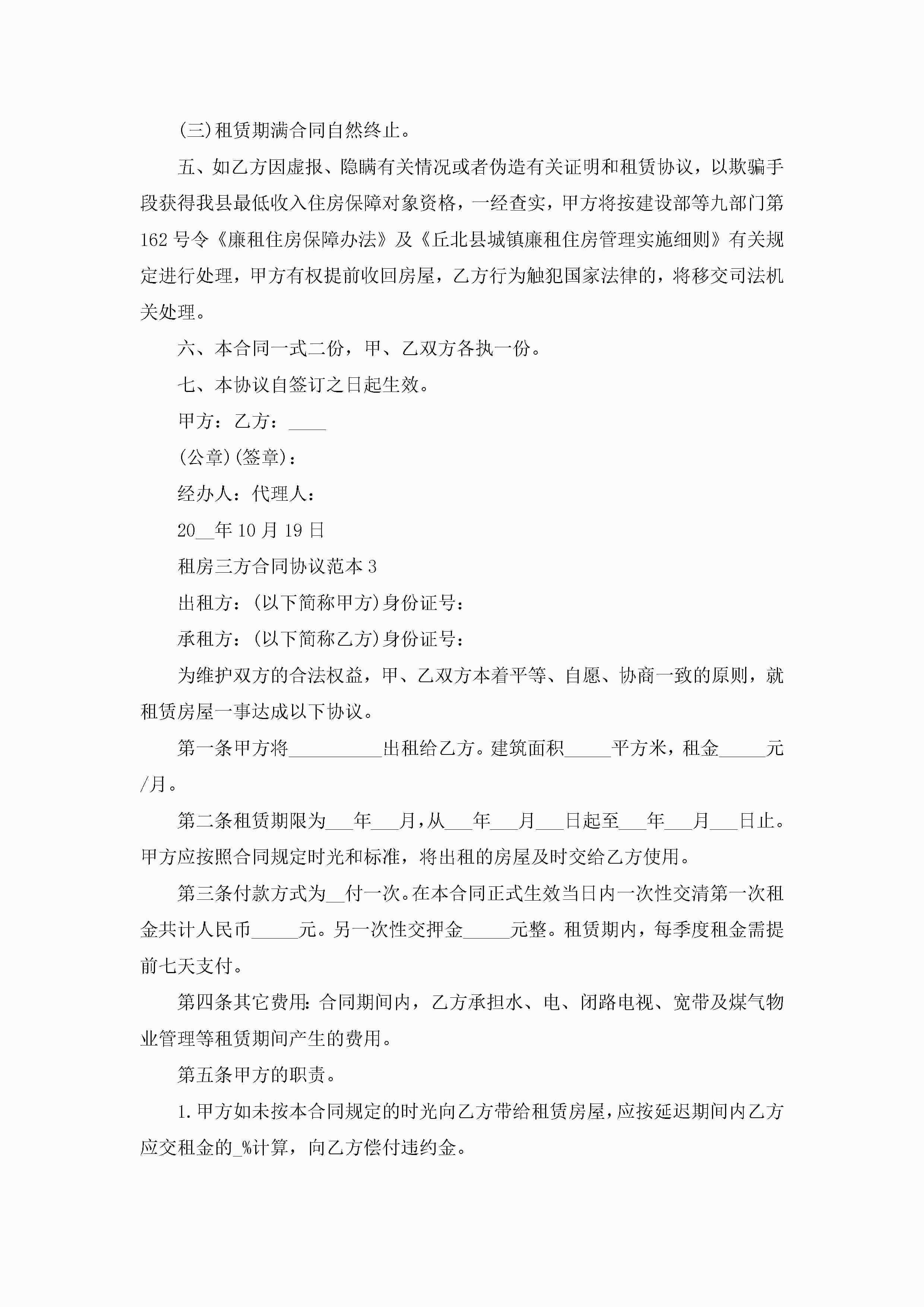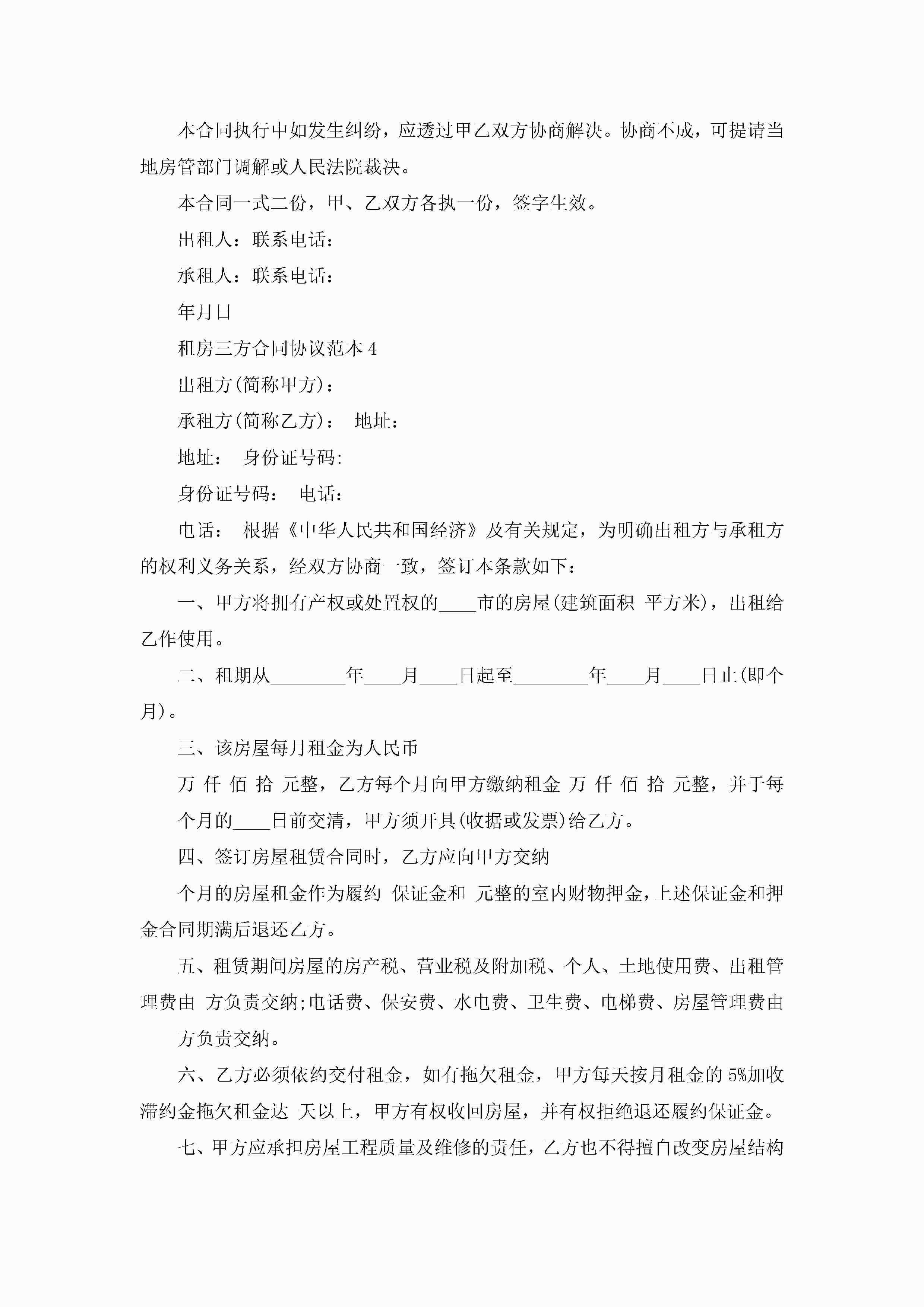 租房三方合同协议范本5篇jugei3月23日 01:48发布关注223 租房三方合同协议范本5篇此内容为付费资源,请付费后查看¥10.9 单篇文档限时特惠¥15个人会员开通企业会员开通立即下载无需登陆!可直接快捷下载单个模板付费资源© 版权声明THE ENDWord模板# 实用文档# 实用模板# 合同模板# 租房合同 如有问题,可点击最底部“联系我们”联系客服 分享QQ空间微博QQ好友海报分享复制链接收藏