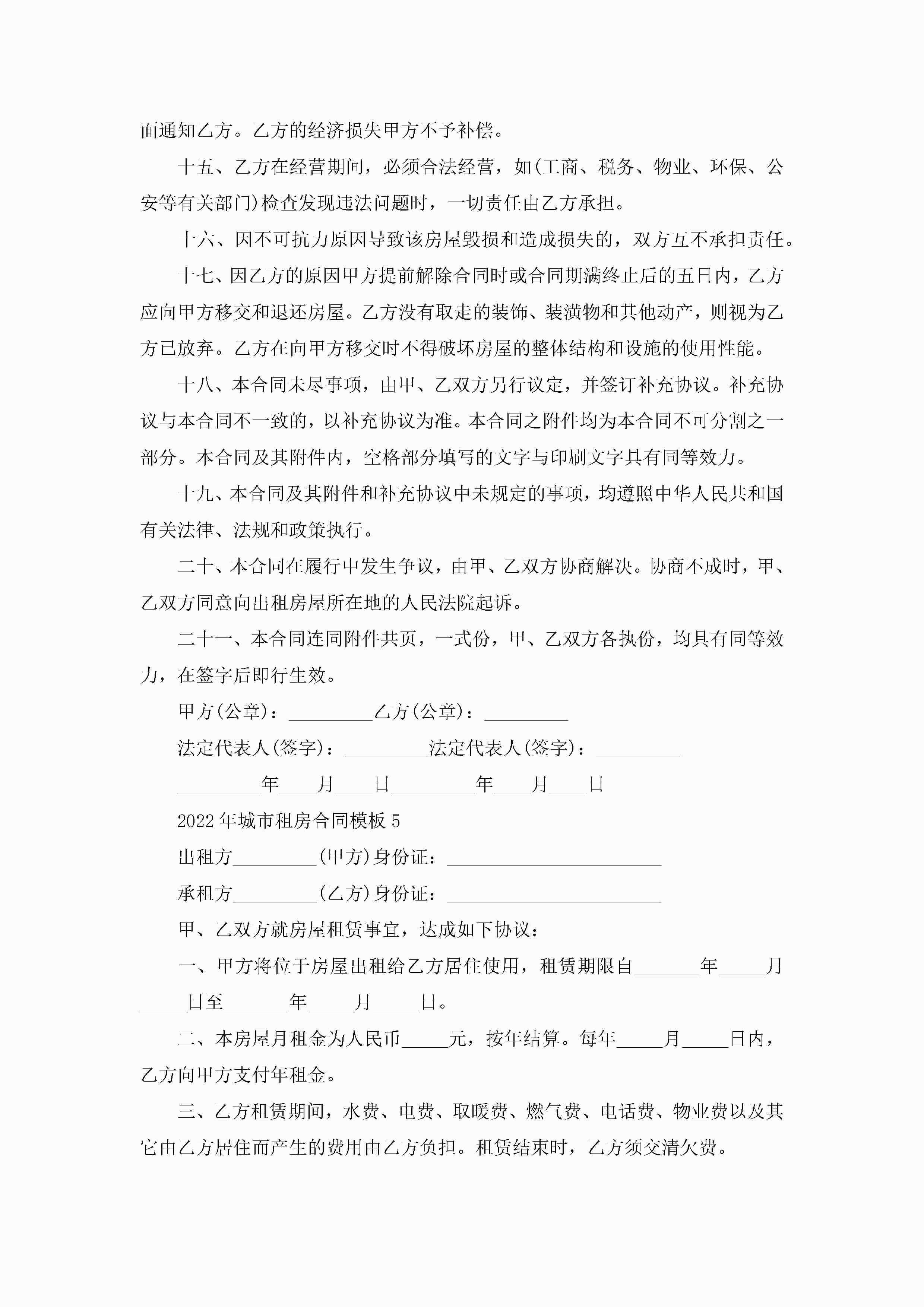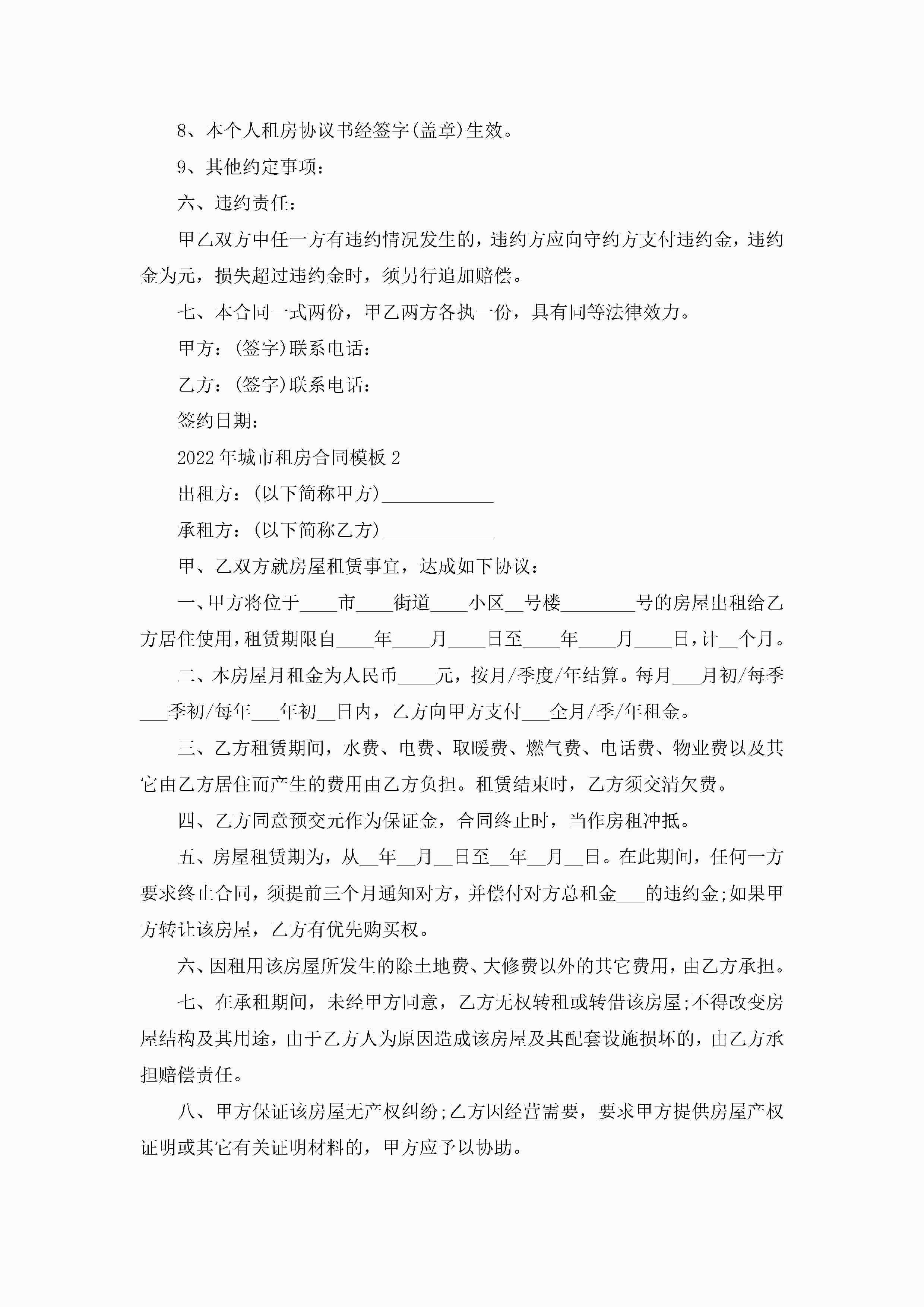 2022年城市租房合同模板5篇jugei3月23日 01:48发布关注216 2022年城市租房合同模板5篇此内容为付费资源,请付费后查看¥10.9 单篇文档限时特惠¥15个人会员开通企业会员开通立即下载无需登陆!可直接快捷下载单个模板付费资源© 版权声明THE ENDWord模板# 实用文档# 实用模板# 合同模板# 租房合同 如有问题,可点击最底部“联系我们”联系客服 分享QQ空间微博QQ好友海报分享复制链接收藏