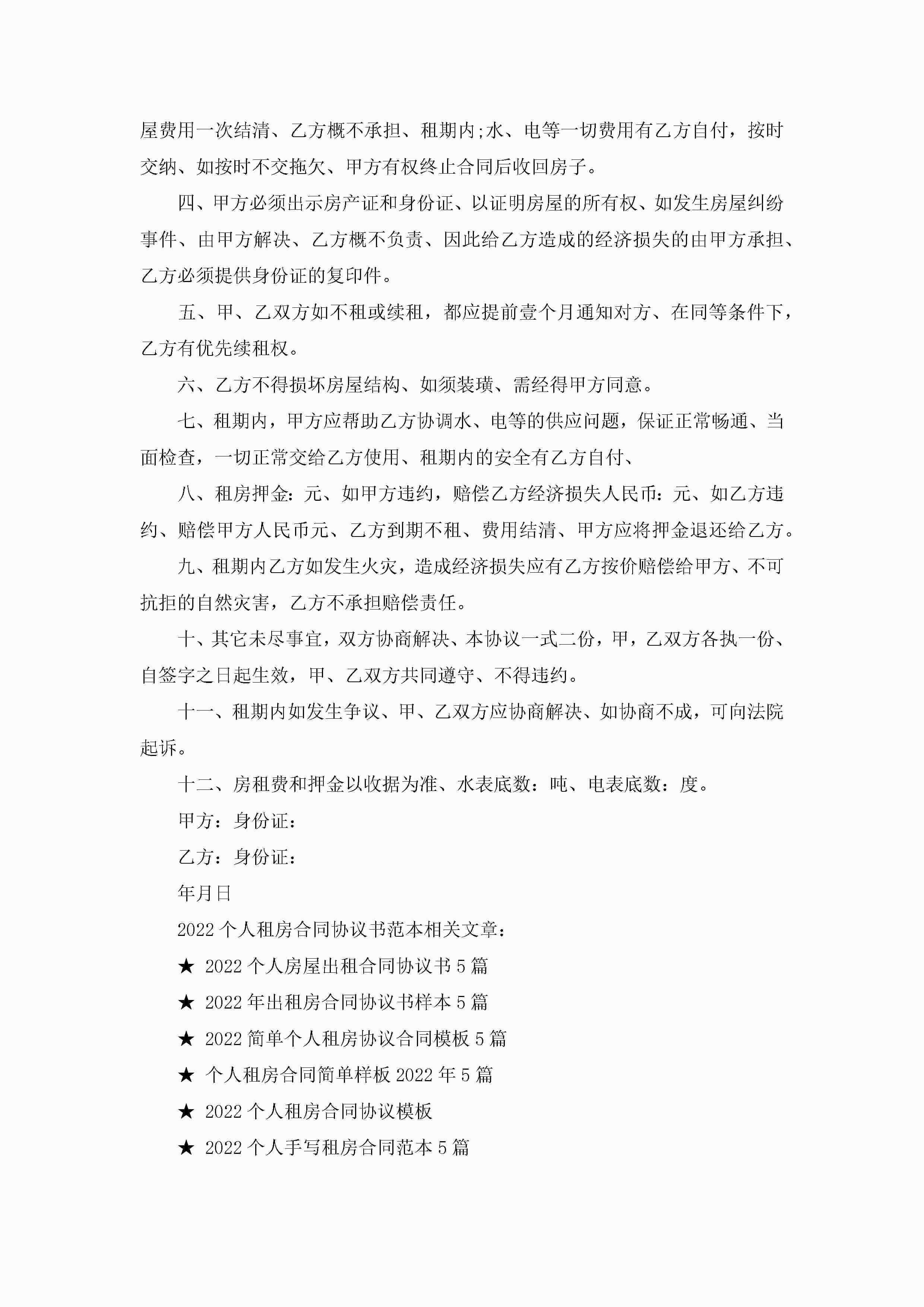 2022个人租房合同协议书范本5篇jugei3月23日 01:48发布关注223 2022个人租房合同协议书范本5篇此内容为付费资源,请付费后查看¥10.9 单篇文档限时特惠¥15个人会员开通企业会员开通立即下载无需登陆!可直接快捷下载单个模板付费资源© 版权声明THE ENDWord模板# 实用文档# 实用模板# 合同模板# 租房合同 如有问题,可点击最底部“联系我们”联系客服 分享QQ空间微博QQ好友海报分享复制链接收藏