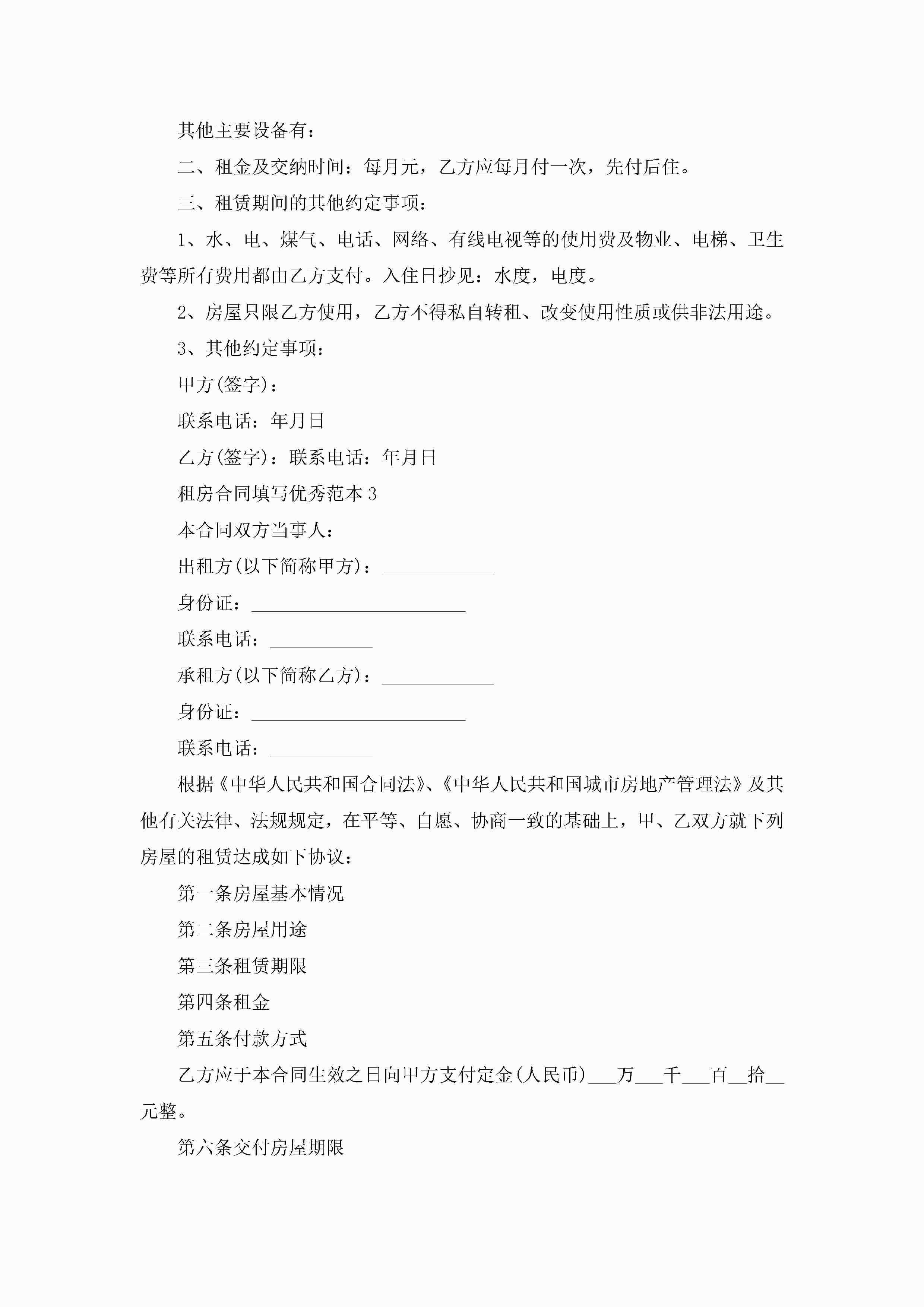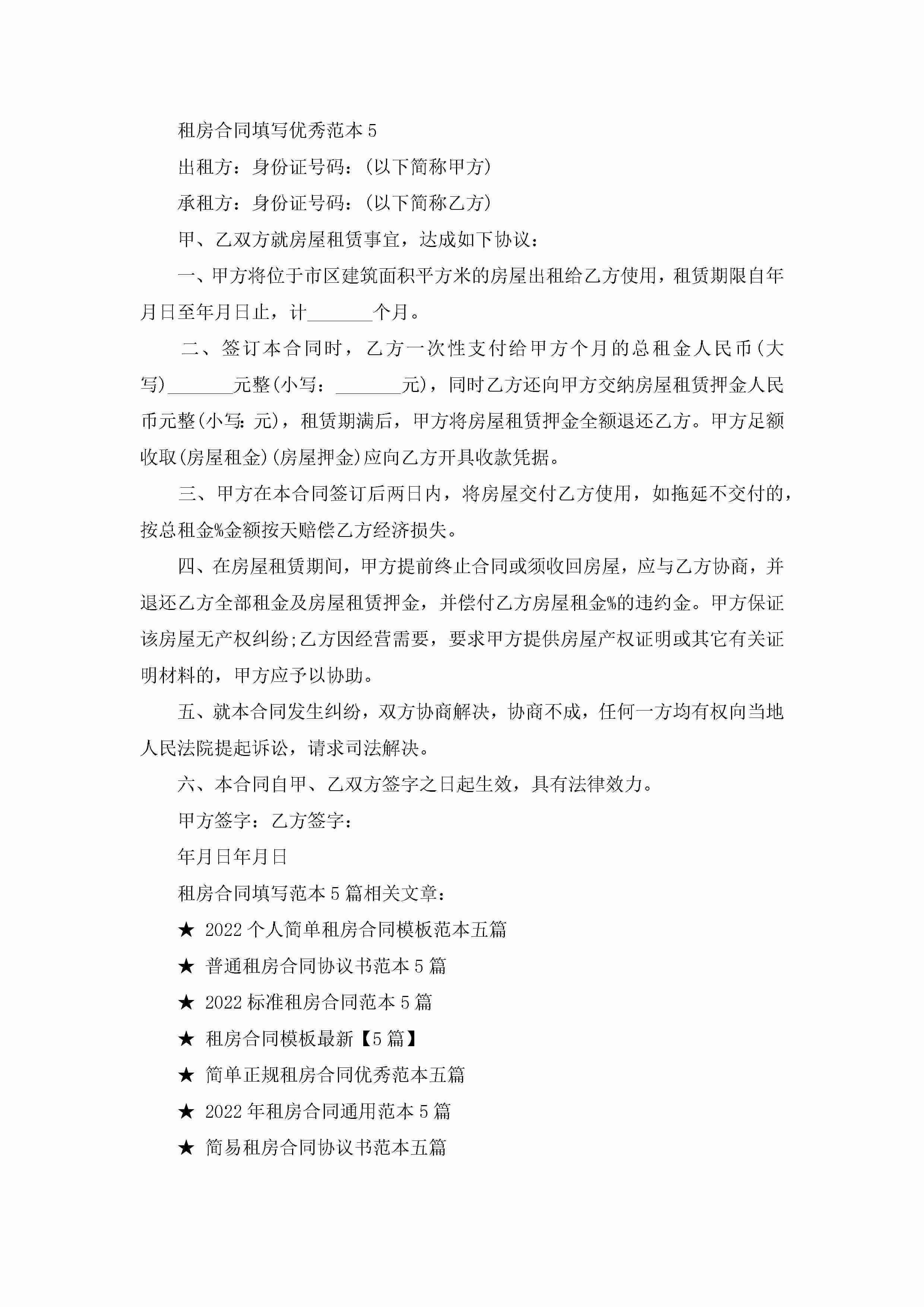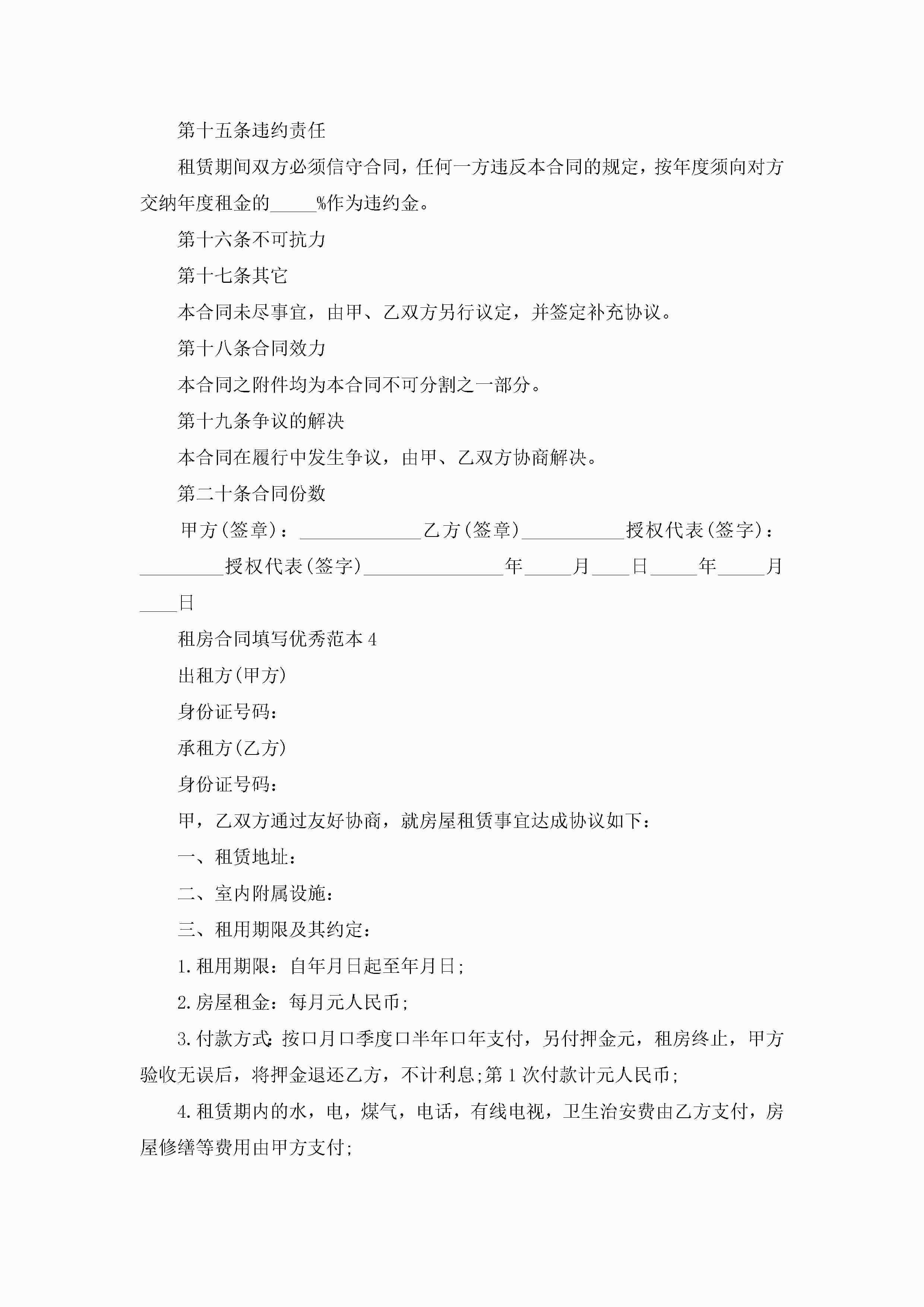 租房合同填写优秀范本5篇jugei3月23日 01:48发布关注249 租房合同填写优秀范本5篇此内容为付费资源,请付费后查看¥10.9 单篇文档限时特惠¥15个人会员开通企业会员开通立即下载无需登陆!可直接快捷下载单个模板付费资源© 版权声明THE ENDWord模板# 实用文档# 实用模板# 合同模板# 租房合同 如有问题,可点击最底部“联系我们”联系客服 分享QQ空间微博QQ好友海报分享复制链接收藏