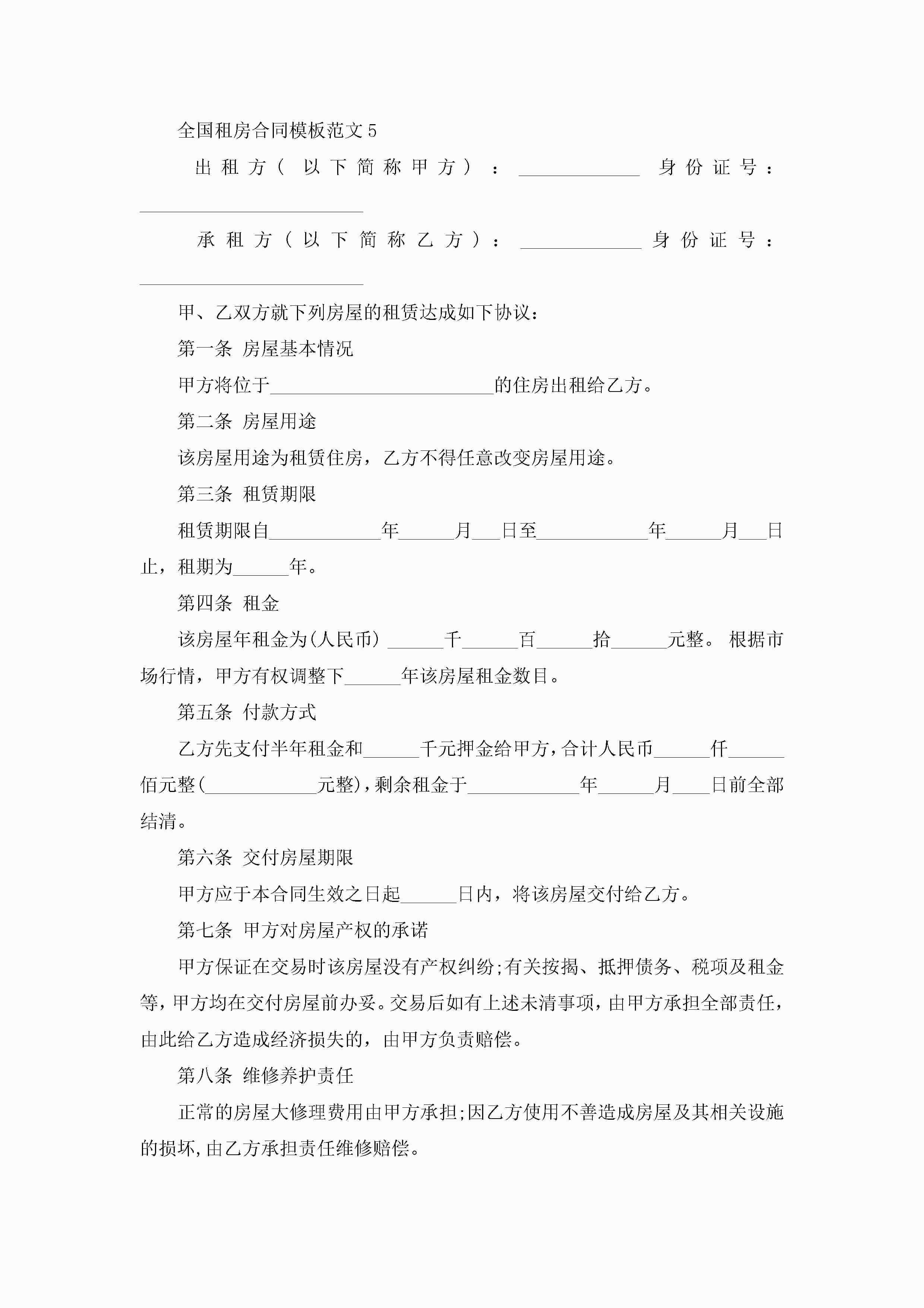 全国租房合同模板范文5篇jugei3月23日 01:48发布关注235 全国租房合同模板范文5篇此内容为付费资源,请付费后查看¥10.9 单篇文档限时特惠¥15个人会员开通企业会员开通立即下载无需登陆!可直接快捷下载单个模板付费资源© 版权声明THE ENDWord模板# 实用文档# 实用模板# 合同模板# 租房合同 如有问题,可点击最底部“联系我们”联系客服 分享QQ空间微博QQ好友海报分享复制链接收藏