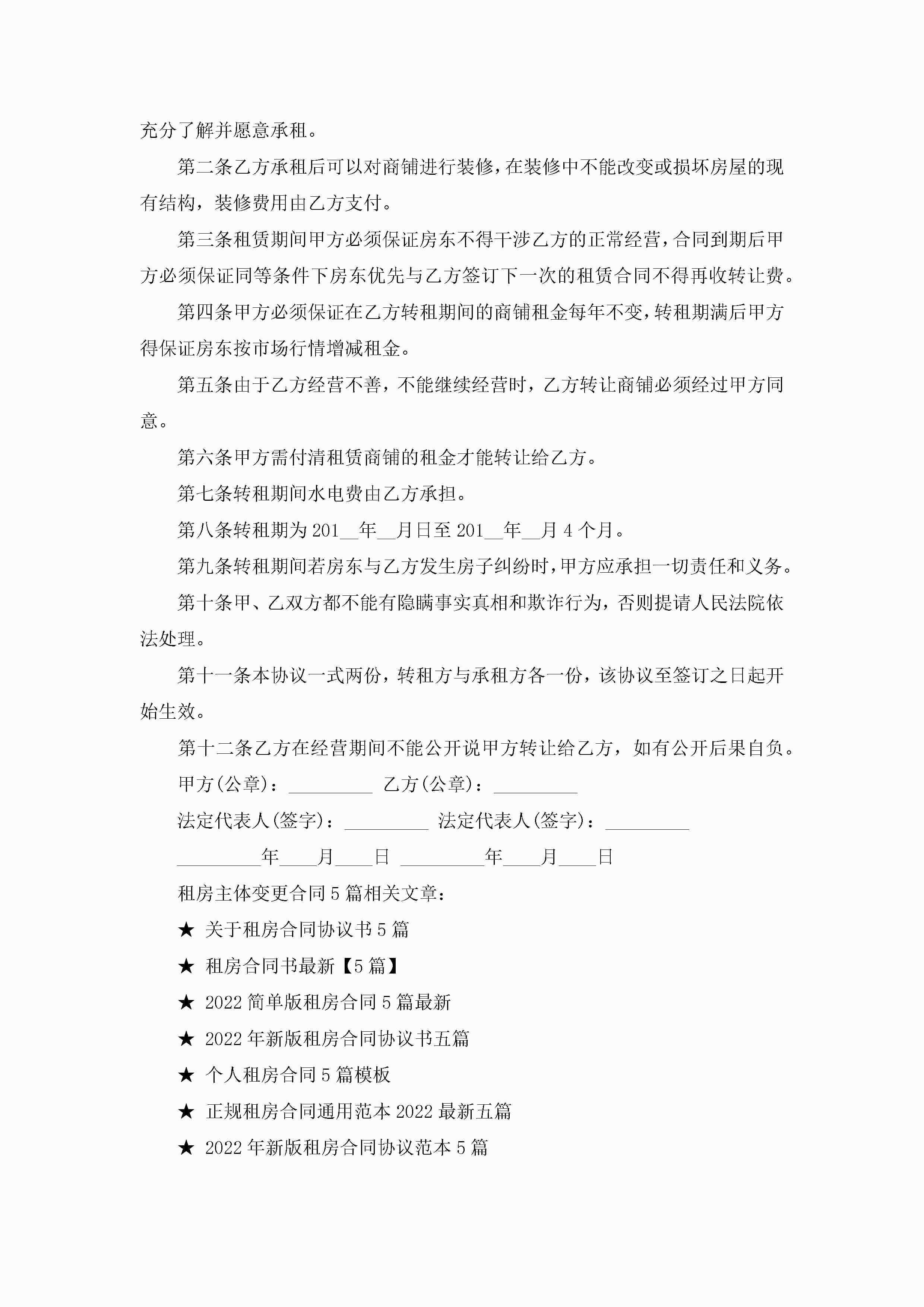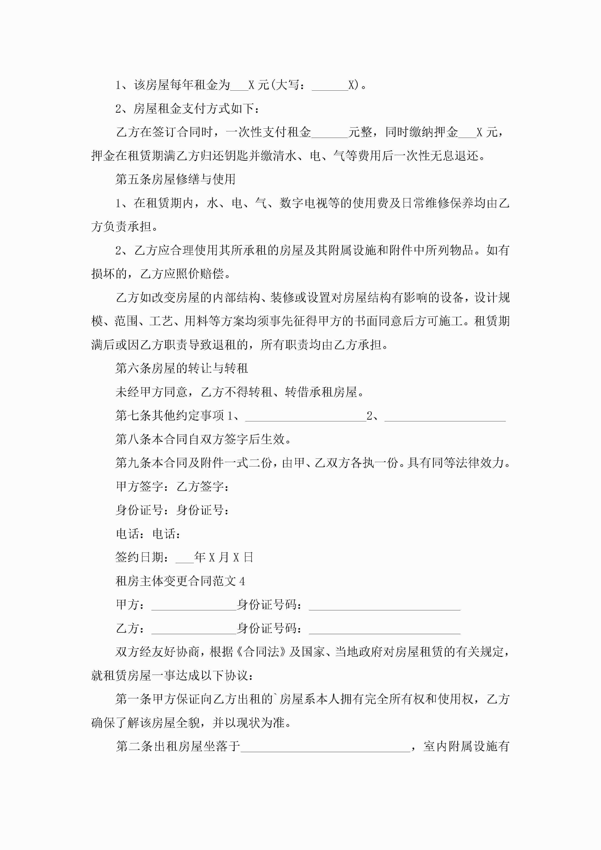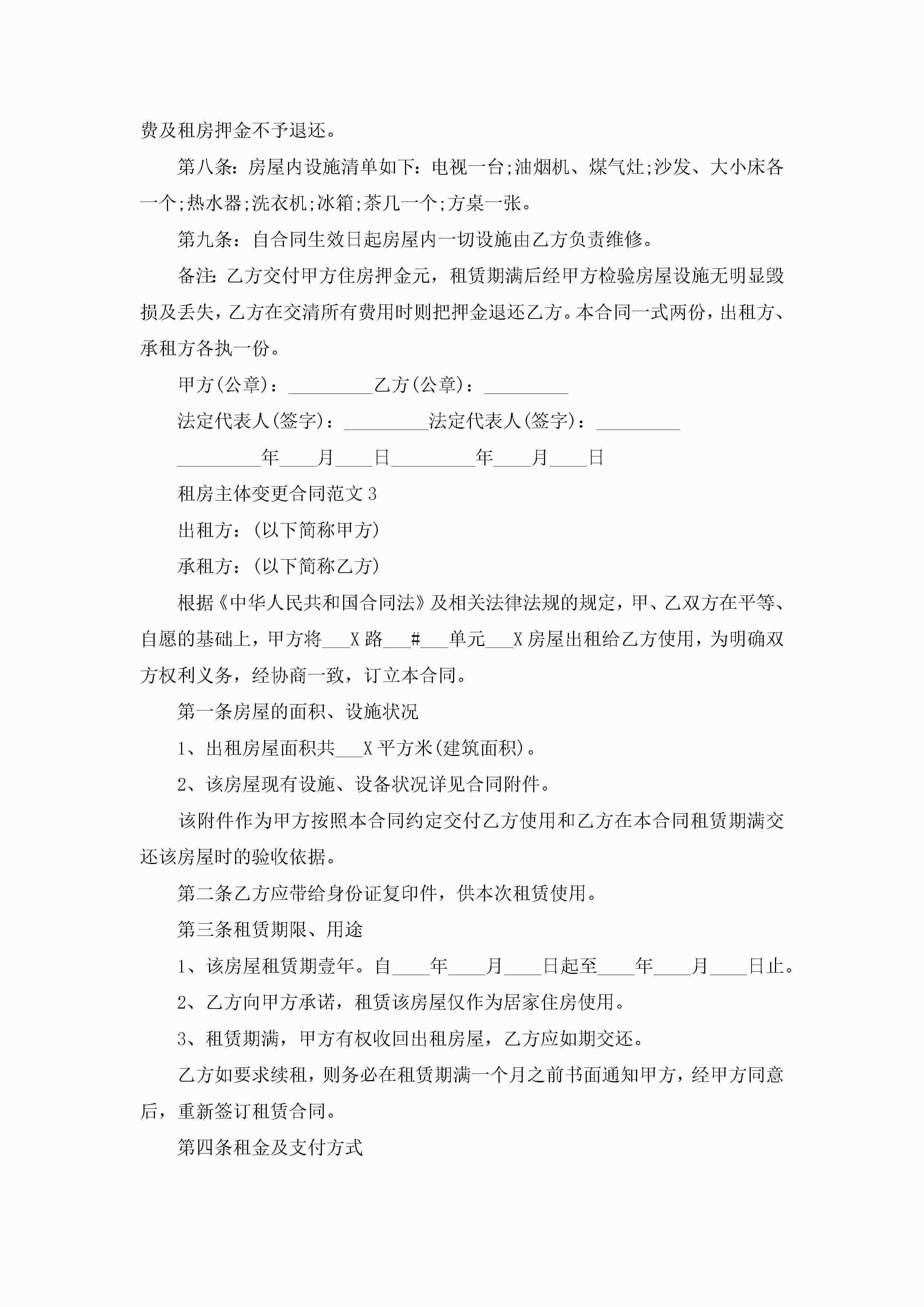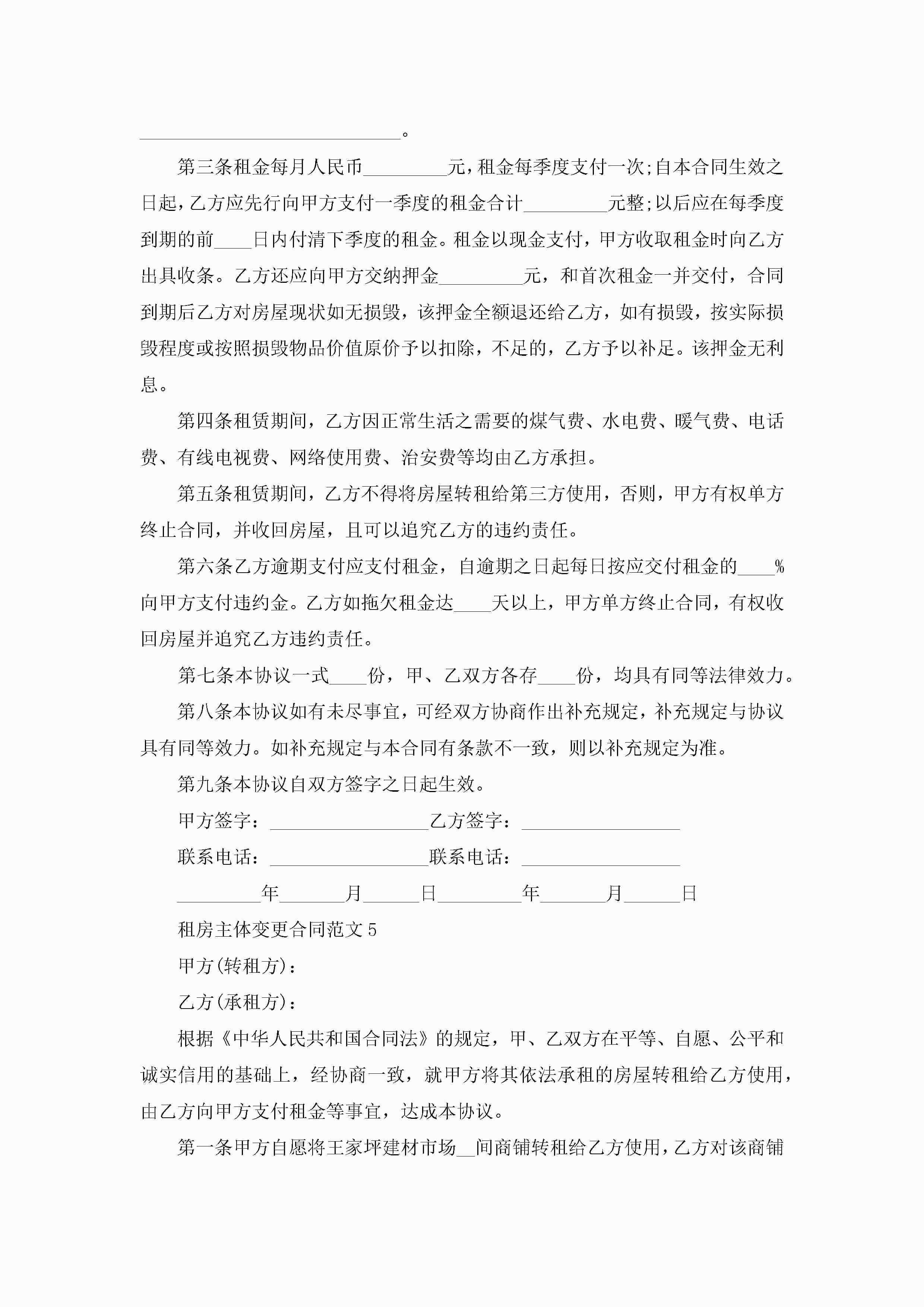 租房主体变更合同范文5篇jugei3月23日 01:48发布关注267 租房主体变更合同范文5篇此内容为付费资源,请付费后查看¥10.9 单篇文档限时特惠¥15个人会员开通企业会员开通立即下载无需登陆!可直接快捷下载单个模板付费资源© 版权声明THE ENDWord模板# 实用文档# 实用模板# 合同模板# 租房合同 如有问题,可点击最底部“联系我们”联系客服 分享QQ空间微博QQ好友海报分享复制链接收藏