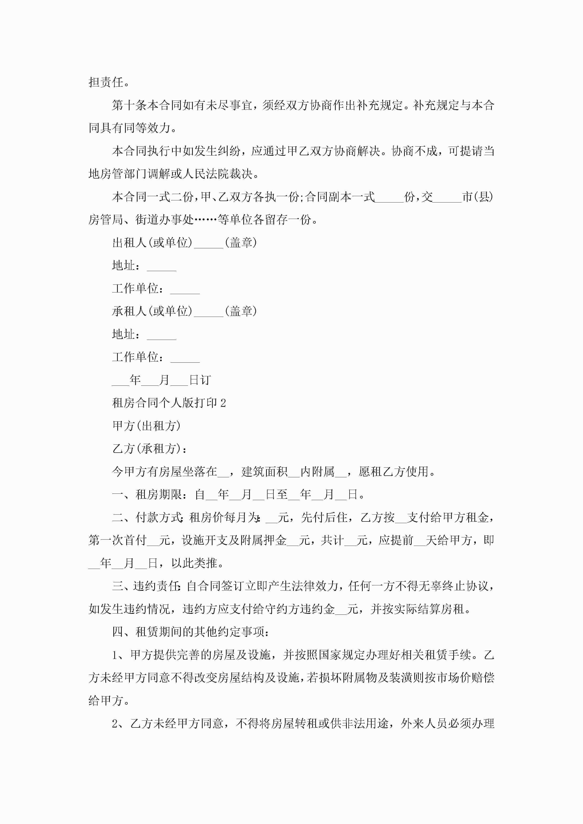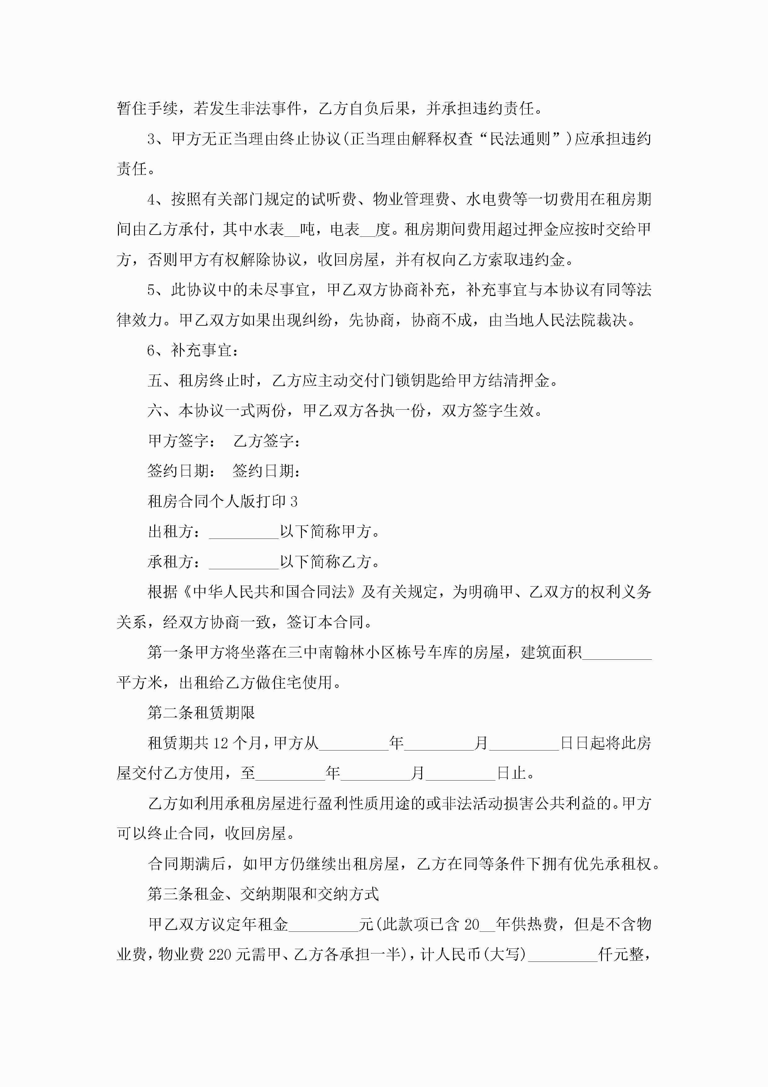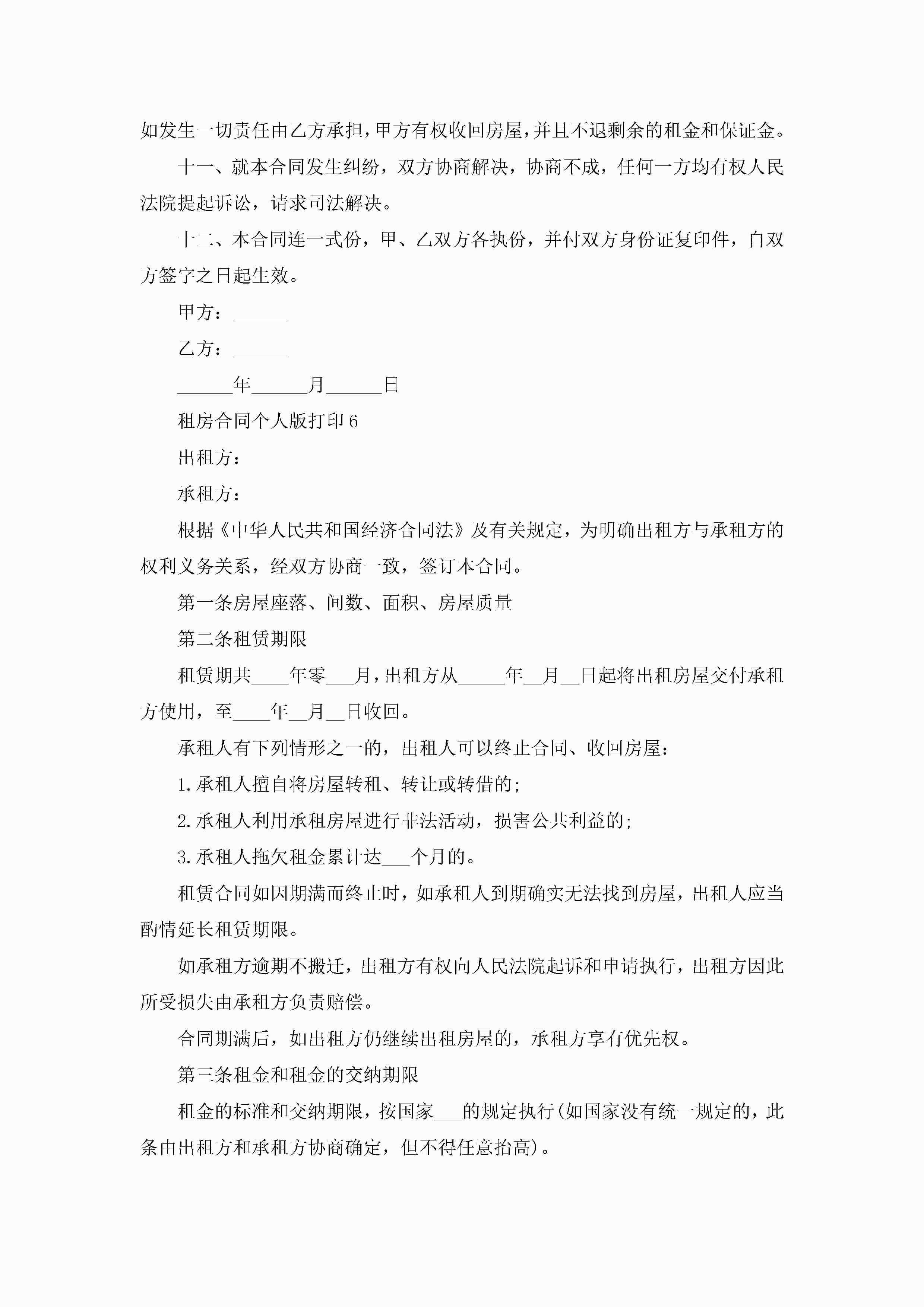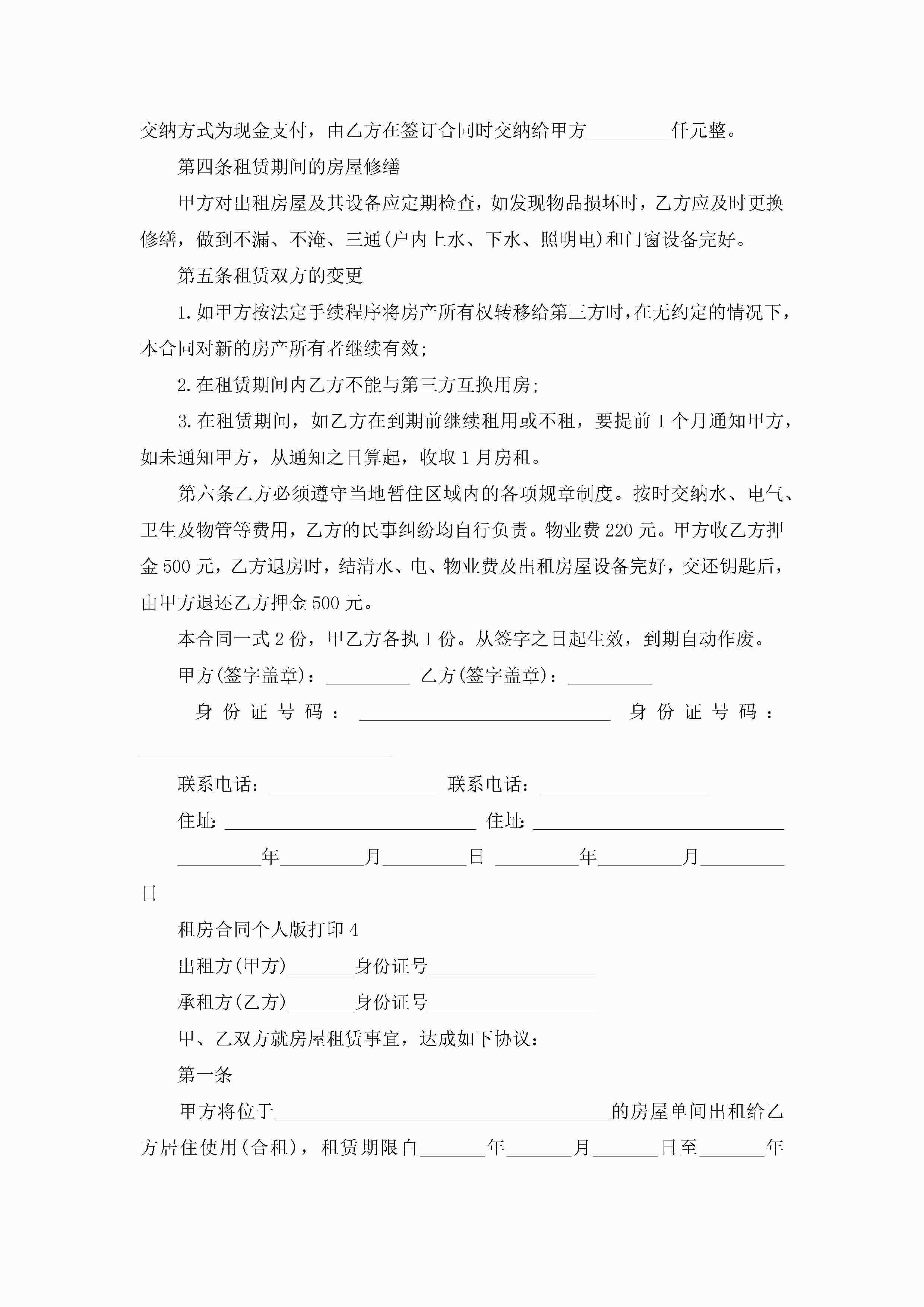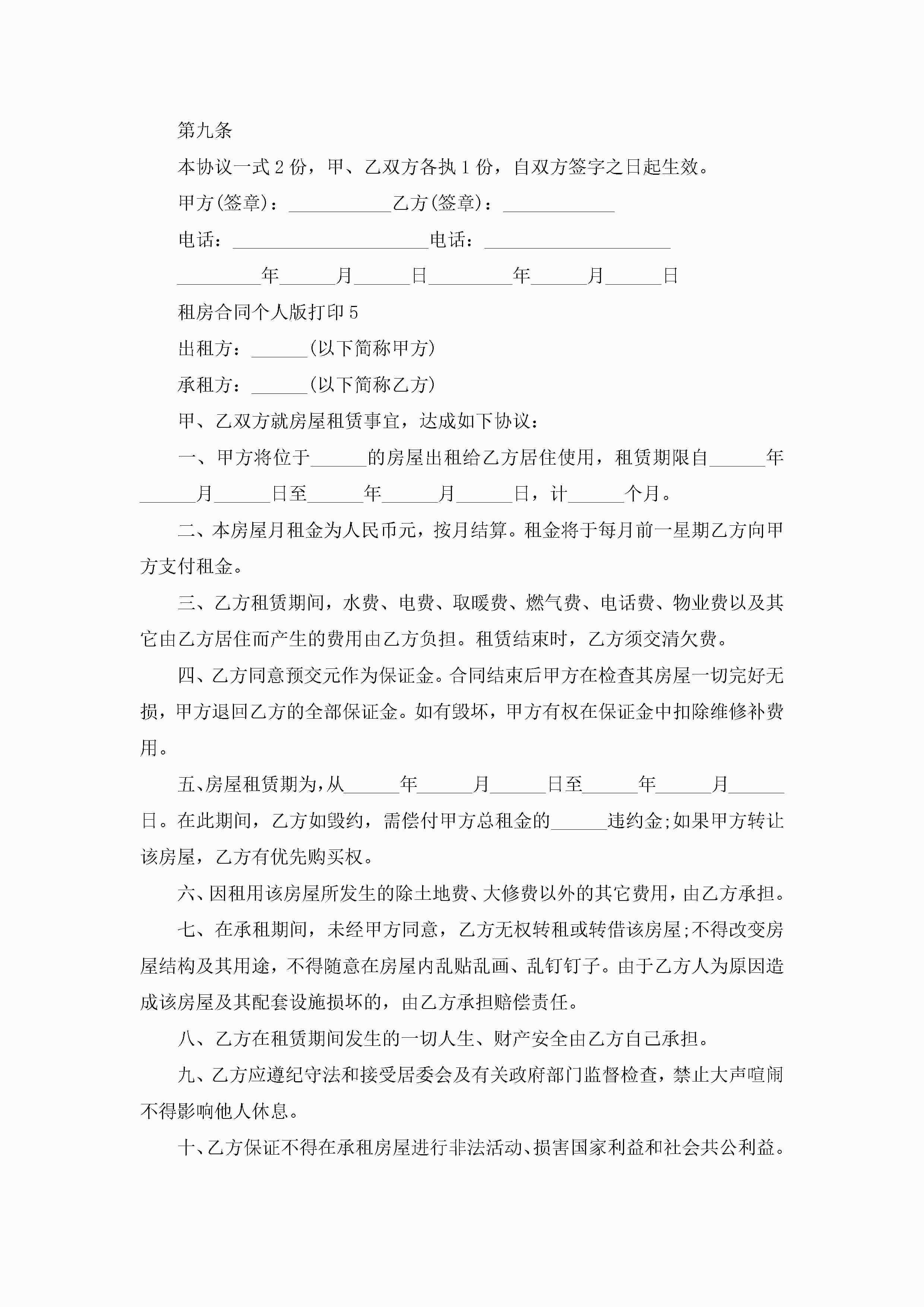 租房合同个人版打印(8篇)jugei3月23日 01:48发布关注207 租房合同个人版打印(8篇)此内容为付费资源,请付费后查看¥10.9 单篇文档限时特惠¥15个人会员开通企业会员开通立即下载无需登陆!可直接快捷下载单个模板付费资源© 版权声明THE ENDWord模板# 实用文档# 实用模板# 合同模板# 租房合同 如有问题,可点击最底部“联系我们”联系客服 分享QQ空间微博QQ好友海报分享复制链接收藏