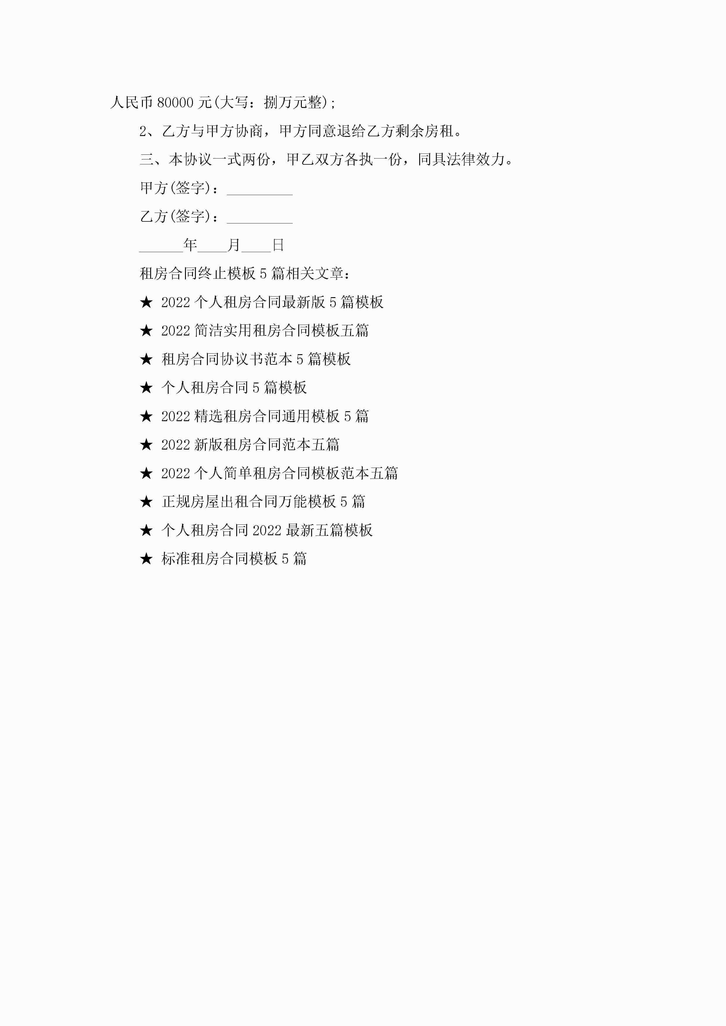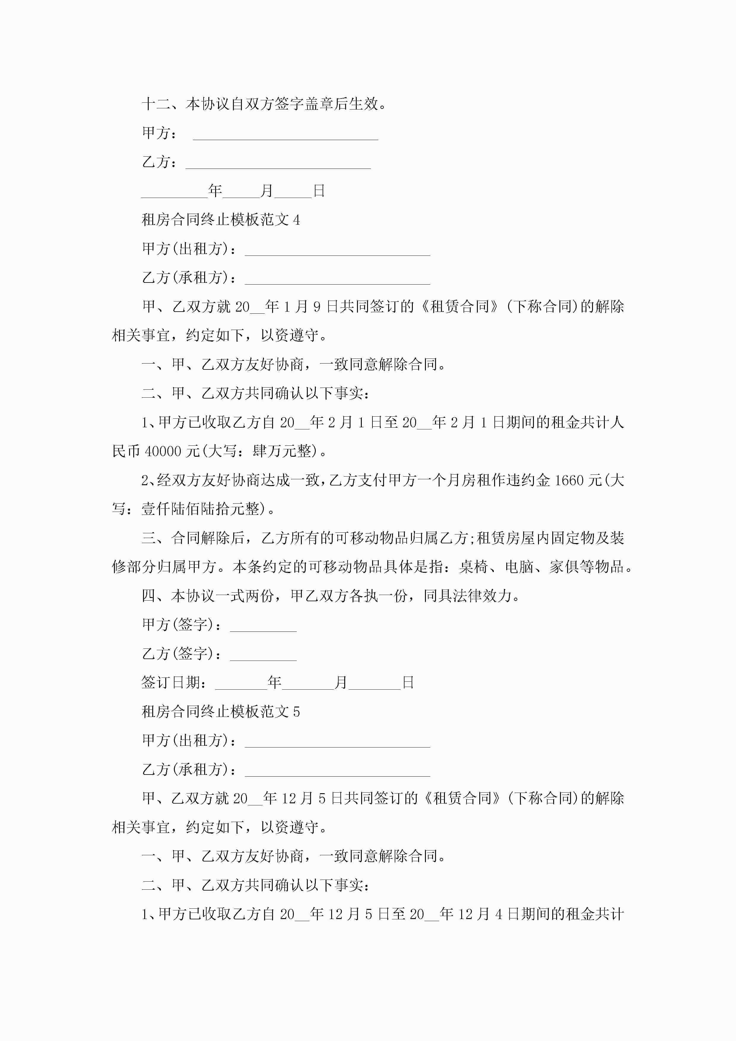 租房合同终止模板范文5篇jugei3月23日 01:48发布关注195 租房合同终止模板范文5篇此内容为付费资源,请付费后查看¥10.9 单篇文档限时特惠¥15个人会员开通企业会员开通立即下载无需登陆!可直接快捷下载单个模板付费资源© 版权声明THE ENDWord模板# 实用文档# 实用模板# 合同模板# 租房合同 如有问题,可点击最底部“联系我们”联系客服 分享QQ空间微博QQ好友海报分享复制链接收藏