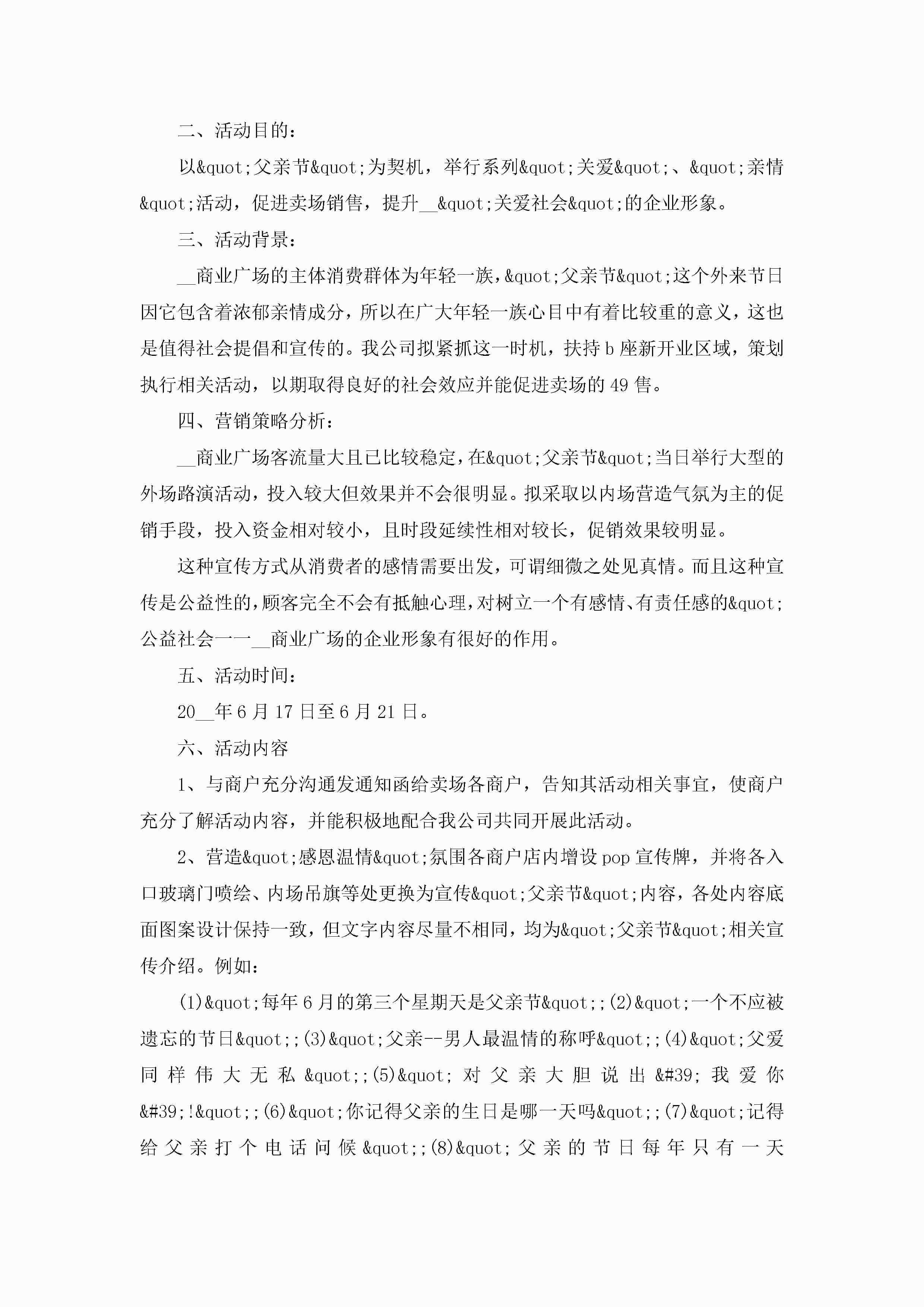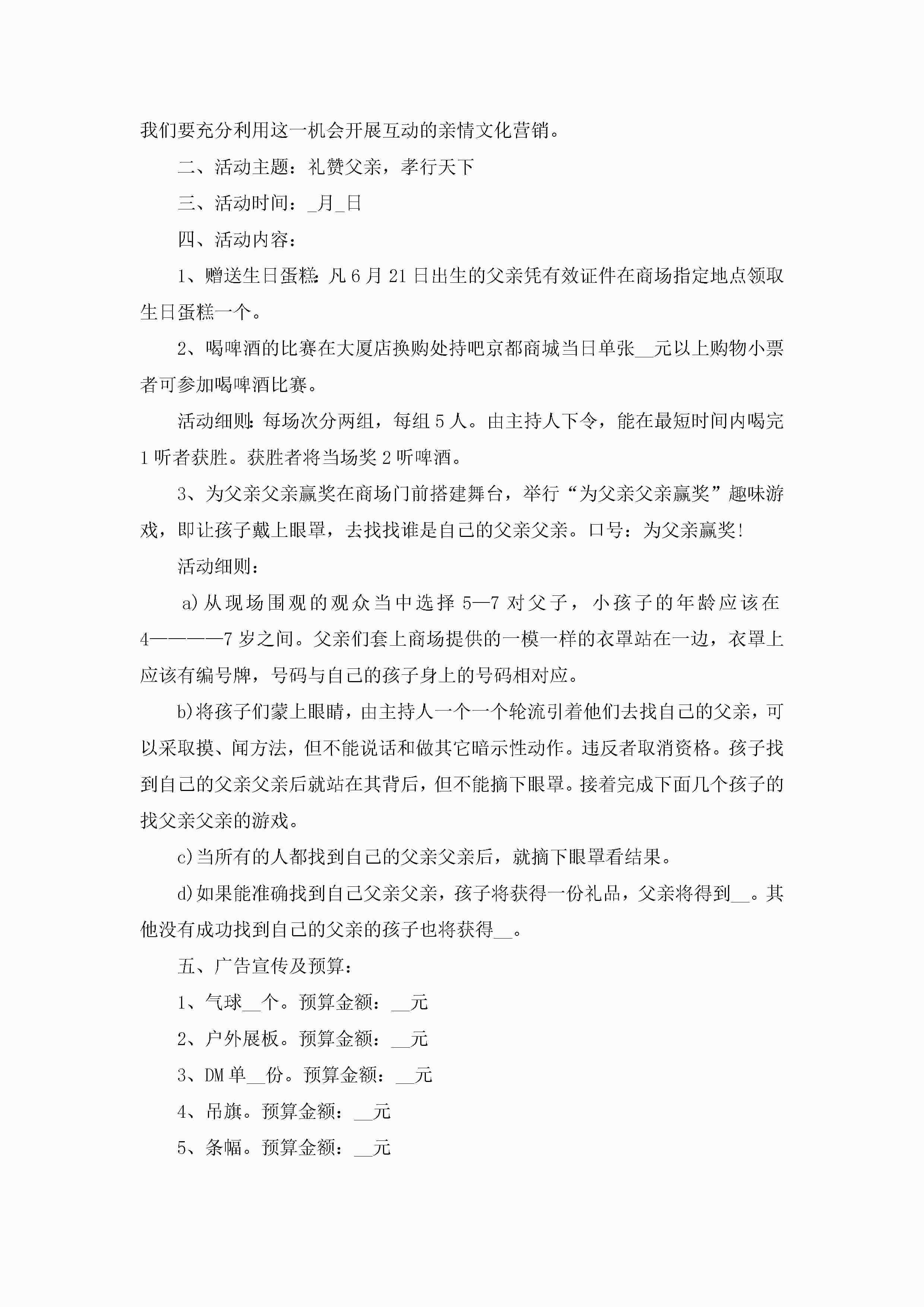 商场父亲节活动的策划方案范文5篇jugei3月23日 01:49发布关注193 商场父亲节活动的策划方案范文5篇此内容为付费资源,请付费后查看¥10.9 单篇文档限时特惠¥15个人会员开通企业会员开通立即下载无需登陆!可直接快捷下载单个模板付费资源© 版权声明THE ENDWord模板# 实用文档# 策划书# 策划方案# 商场父亲节活动的策划方案 如有问题,可点击最底部“联系我们”联系客服 分享QQ空间微博QQ好友海报分享复制链接收藏