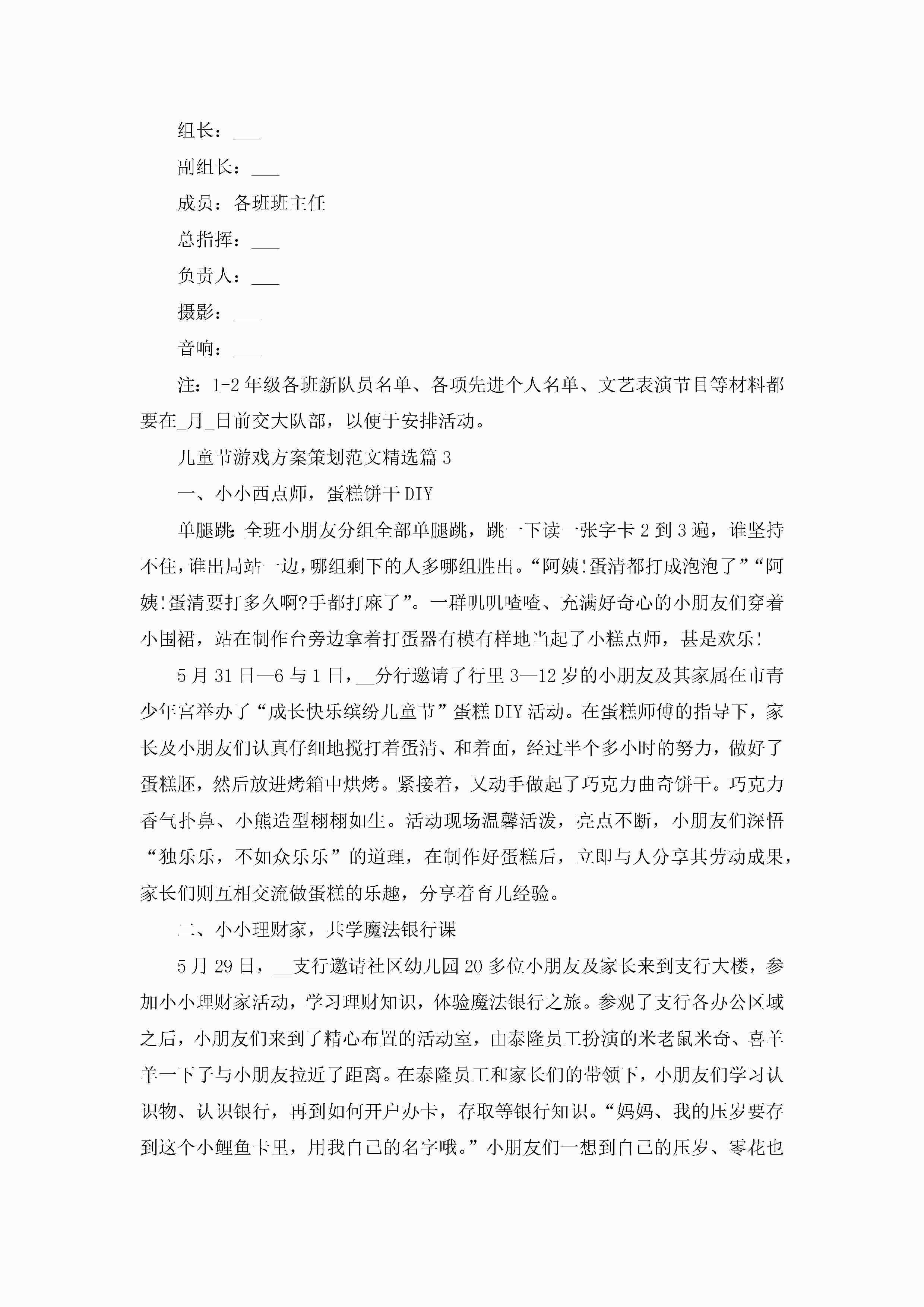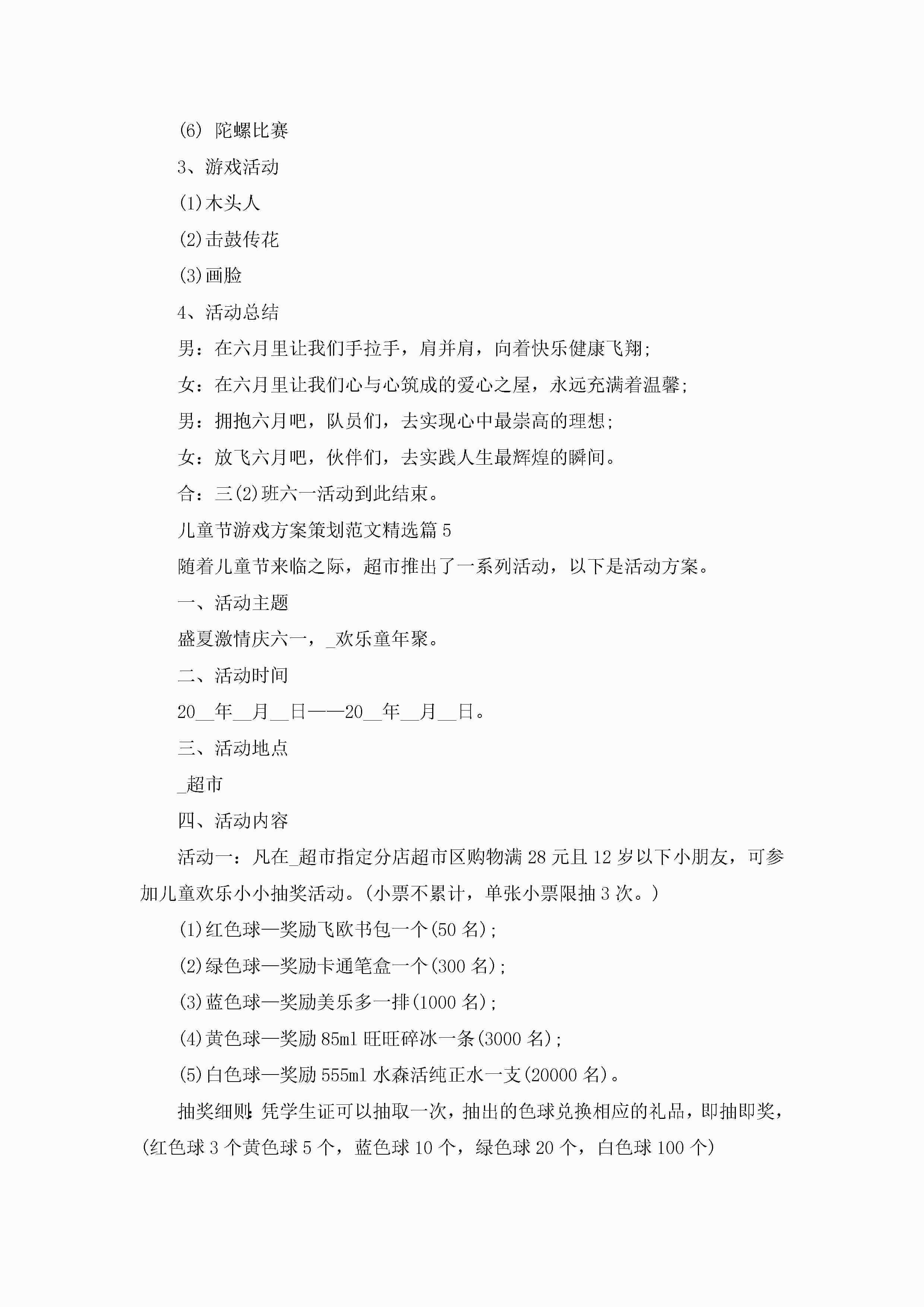儿童节游戏方案策划范文5篇jugei3月23日 01:49发布关注207 儿童节游戏方案策划范文5篇此内容为付费资源,请付费后查看¥10.9 单篇文档限时特惠¥15个人会员开通企业会员开通立即下载无需登陆!可直接快捷下载单个模板付费资源© 版权声明THE ENDWord模板# 实用文档# 策划书# 策划方案# 儿童节游戏方案策划 如有问题,可点击最底部“联系我们”联系客服 分享QQ空间微博QQ好友海报分享复制链接收藏