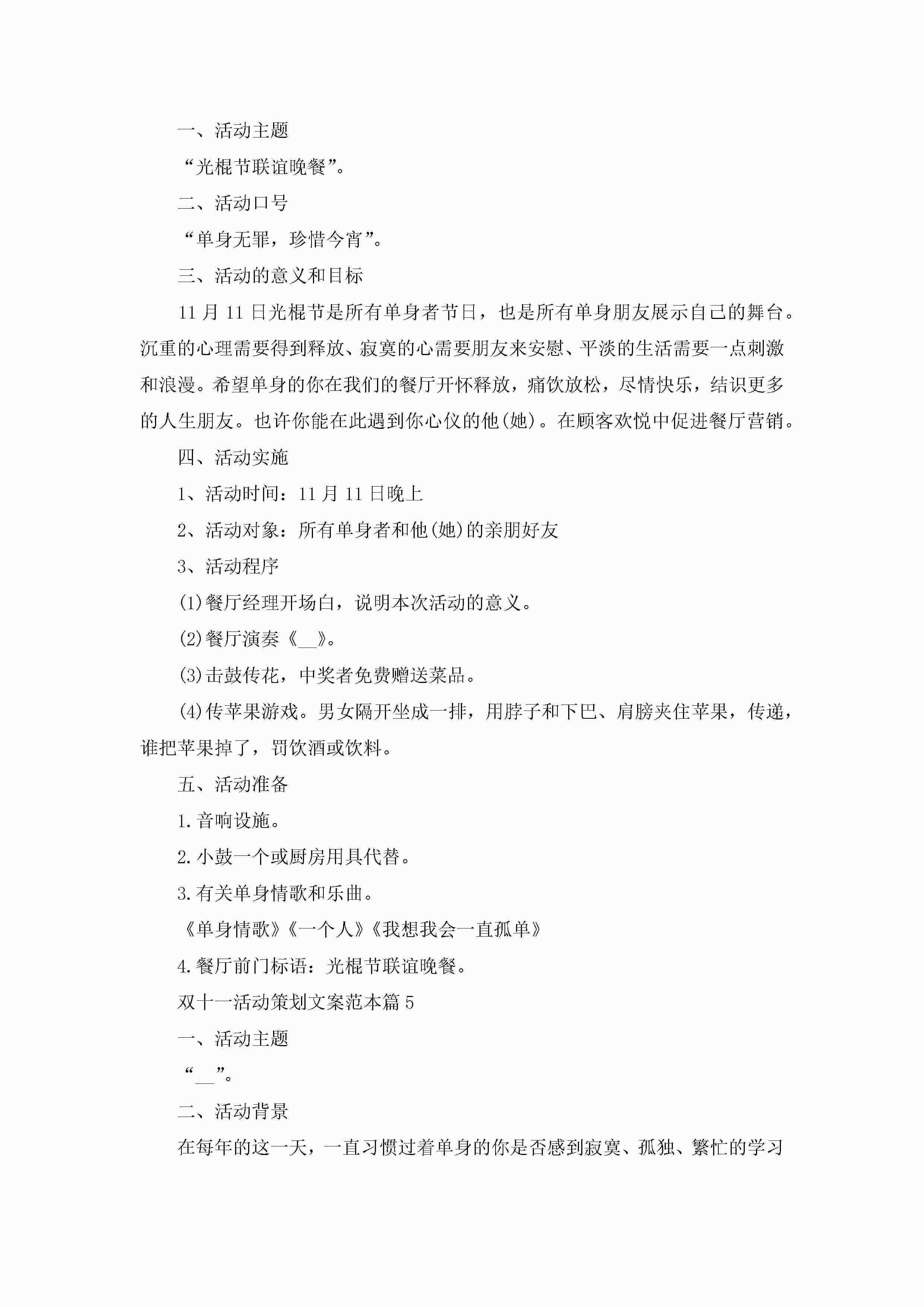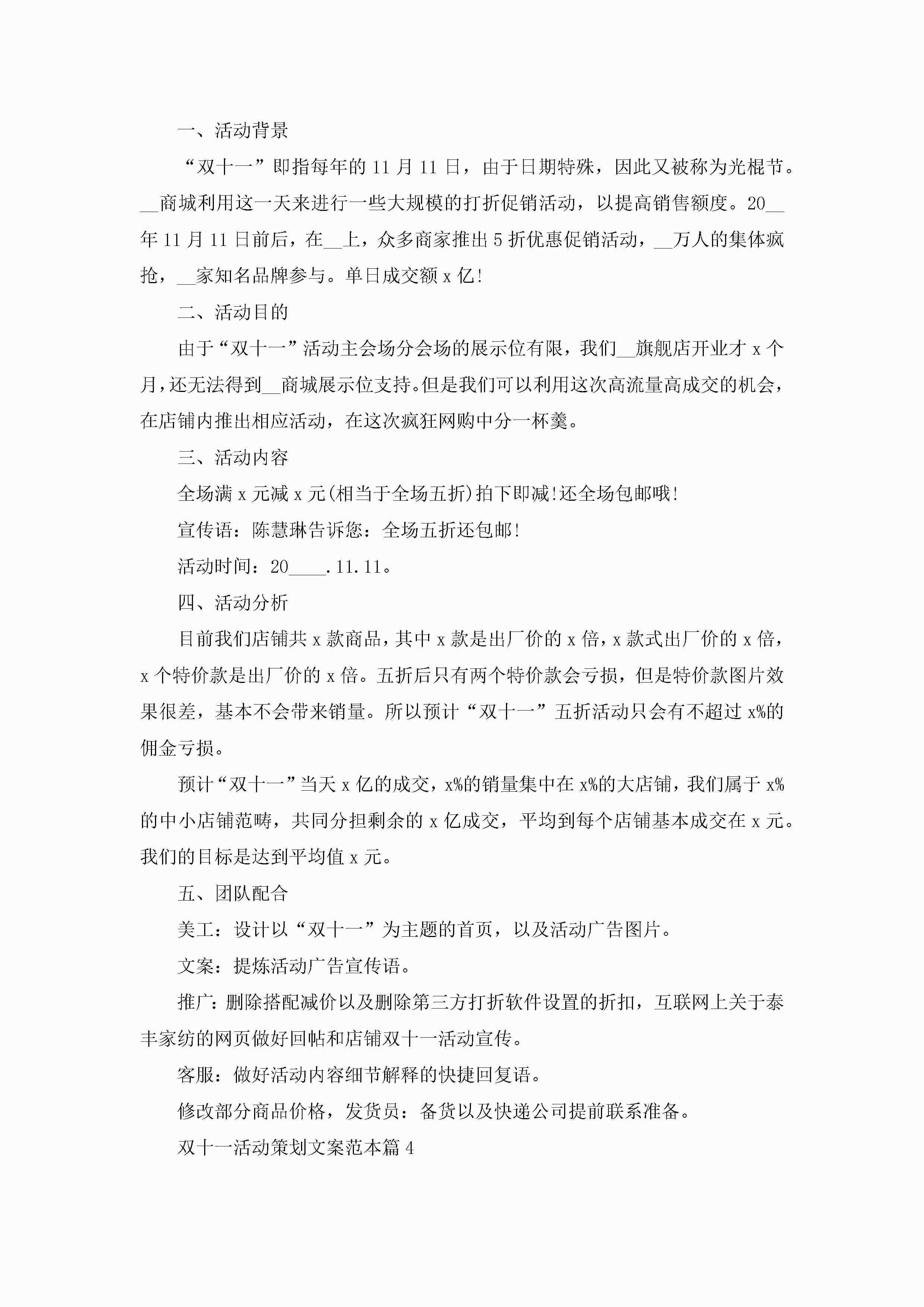 双十一活动策划文案范本5篇jugei3月23日 01:50发布关注198 双十一活动策划文案范本5篇此内容为付费资源,请付费后查看¥10.9 单篇文档限时特惠¥15个人会员开通企业会员开通立即下载无需登陆!可直接快捷下载单个模板付费资源© 版权声明THE ENDWord模板# 实用文档# 策划书# 策划方案# 双十一活动策划文案 如有问题,可点击最底部“联系我们”联系客服 分享QQ空间微博QQ好友海报分享复制链接收藏