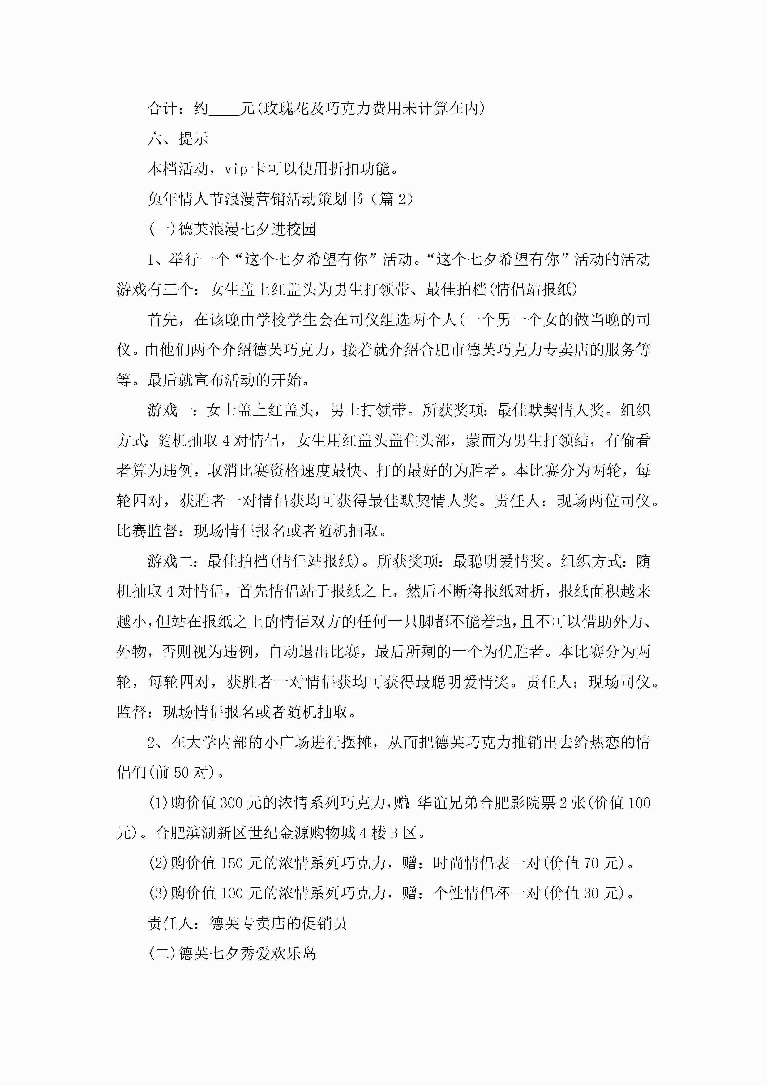 兔年情人节浪漫营销活动策划书通用7篇jugei3月23日 01:51发布关注363 兔年情人节浪漫营销活动策划书通用7篇此内容为付费资源,请付费后查看¥10.9 单篇文档限时特惠¥15个人会员开通企业会员开通立即下载无需登陆!可直接快捷下载单个模板付费资源© 版权声明THE ENDWord模板# 实用文档# 策划书# 工作文档# 营销策划 如有问题,可点击最底部“联系我们”联系客服 分享QQ空间微博QQ好友海报分享复制链接收藏