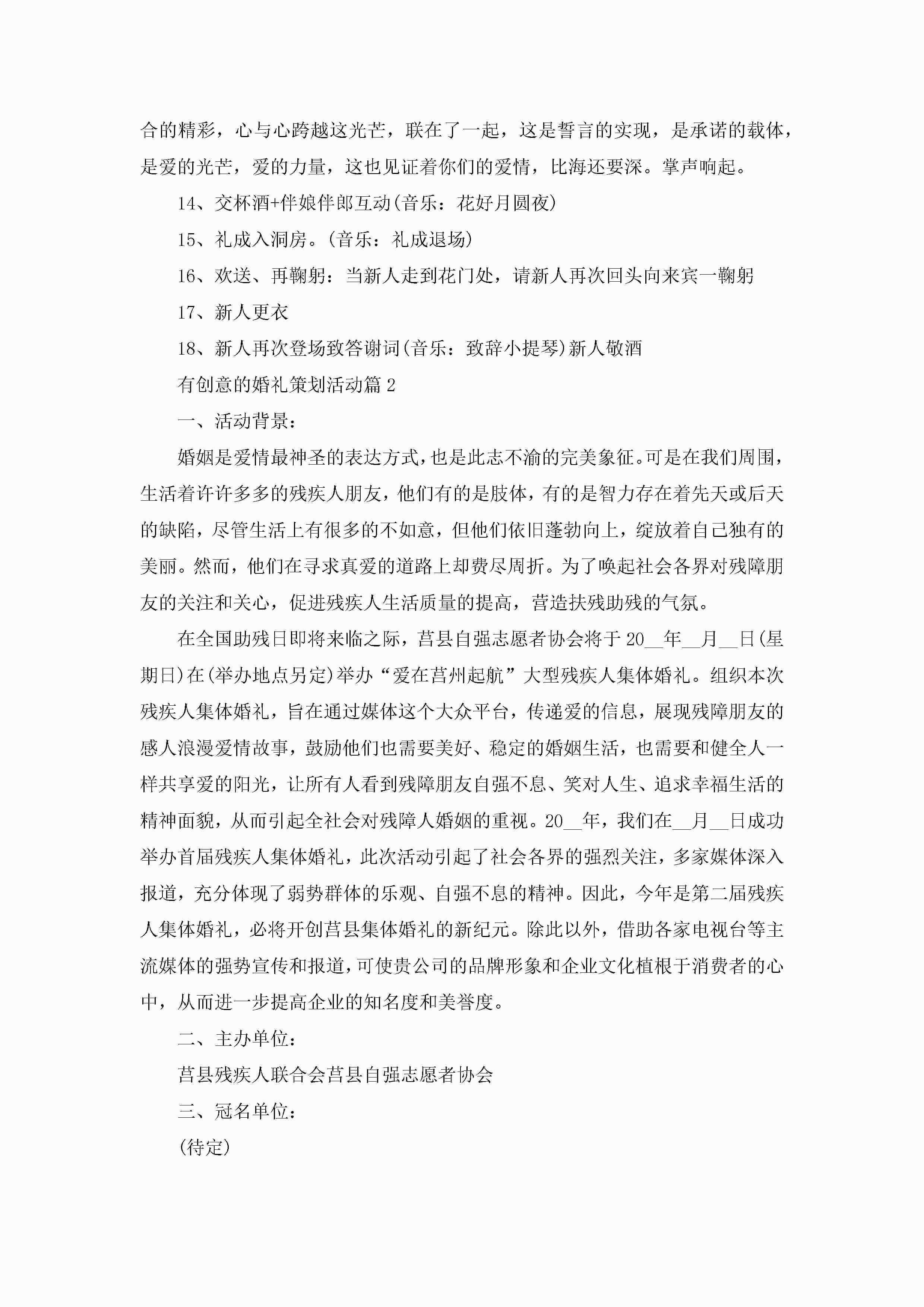 有创意的结婚典礼策划活动最新5篇jugei3月23日 01:52发布关注415 有创意的结婚典礼策划活动最新5篇此内容为付费资源,请付费后查看¥10.9 单篇文档限时特惠¥15个人会员开通企业会员开通立即下载无需登陆!可直接快捷下载单个模板付费资源© 版权声明THE ENDWord模板# 实用文档# 策划书# 工作文档# 婚礼策划 如有问题,可点击最底部“联系我们”联系客服 分享QQ空间微博QQ好友海报分享复制链接收藏